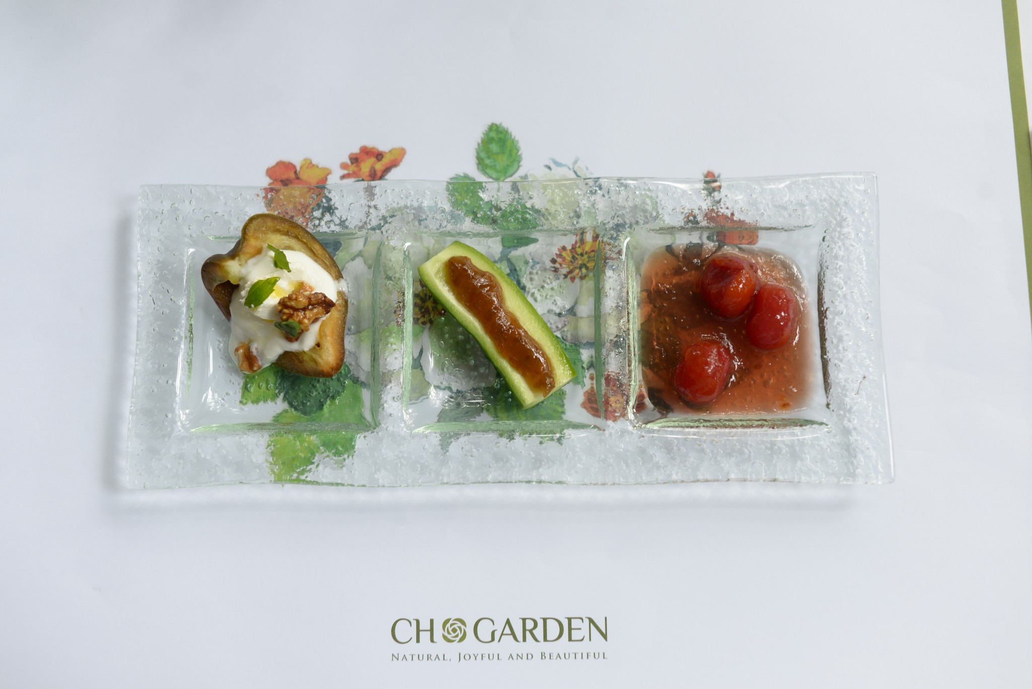 接著登場的是開胃三小品,從左到右分別是『薄荷Feta起司與有機彩色甜椒佐自製優格』、『鮮脆有機小黃瓜佐千樺梅醬』與『紅酒蜜汁有機小番茄』。一開始上菜我還誤以為最左邊的甜椒是無花果,但服務人員會很仔細的介紹菜色與原料,輕描淡寫的調味能自然的吃出原始蔬菜的香甜,高招!