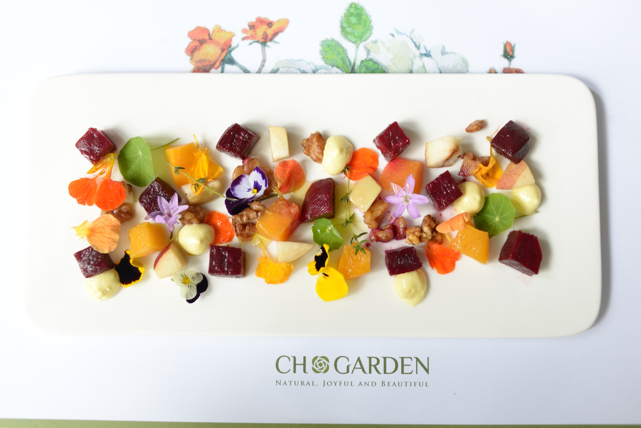 [法式經典素食套餐] 貓大王的素食當然就不會出現臘腸啦!『特級橄欖油拌綜合堅果、蜜桃與百里香酒醋甜菜根』取而代之的是核桃。