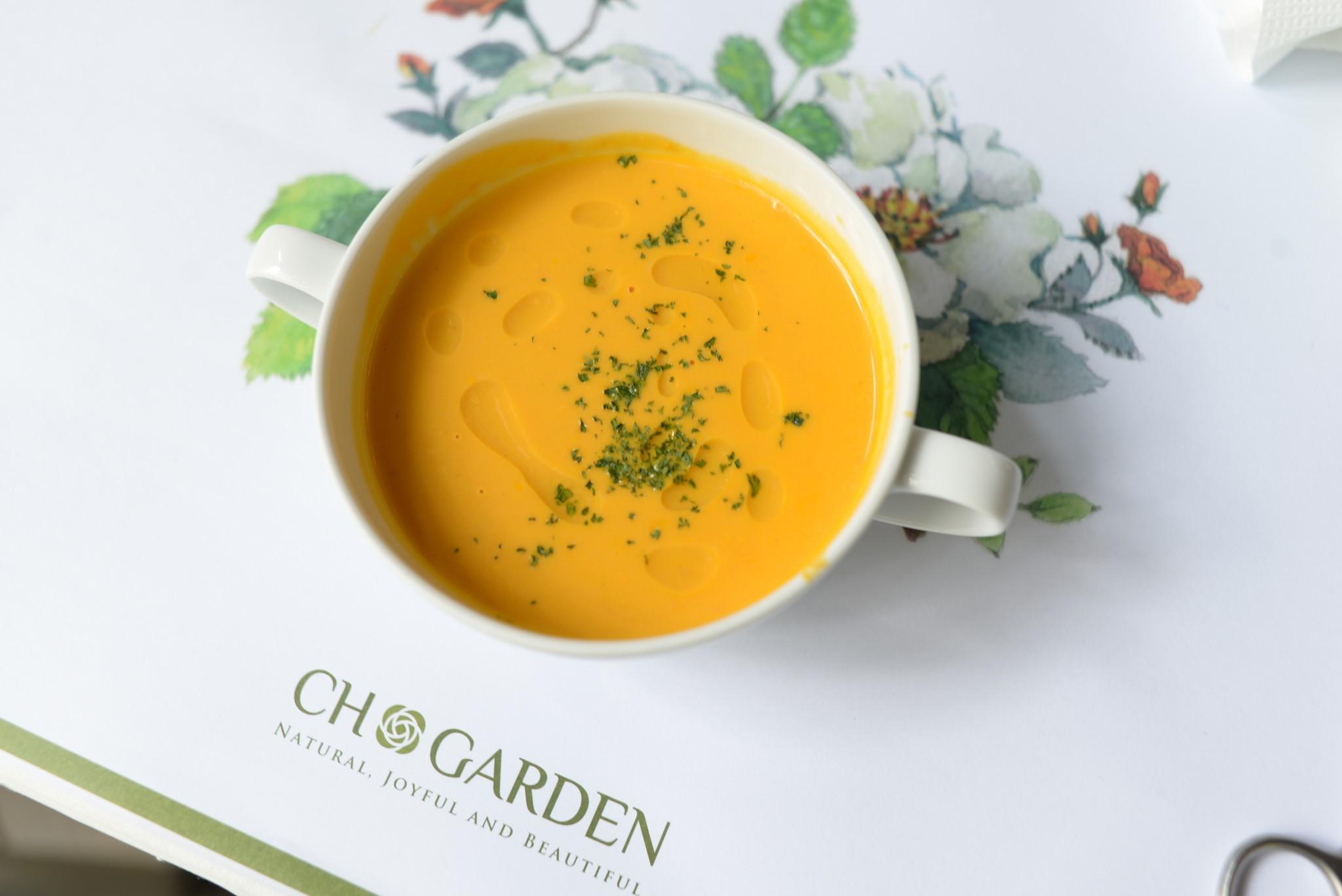[法式經典素食套餐] 貓大王的『奶油雲林VDS紅蘿蔔濃湯』就真的要大推一下,實在是太好喝了。初嚐一口會誤以為是南瓜濃湯,咕嚕下肚後喉頭會有一陣紅蘿蔔特有的甜味,猜測是將紅蘿蔔打泥後混入濃湯內,那味道似乎並沒有將蘿蔔煮熟,改天的型男大主廚時間來嘗試煮煮看。