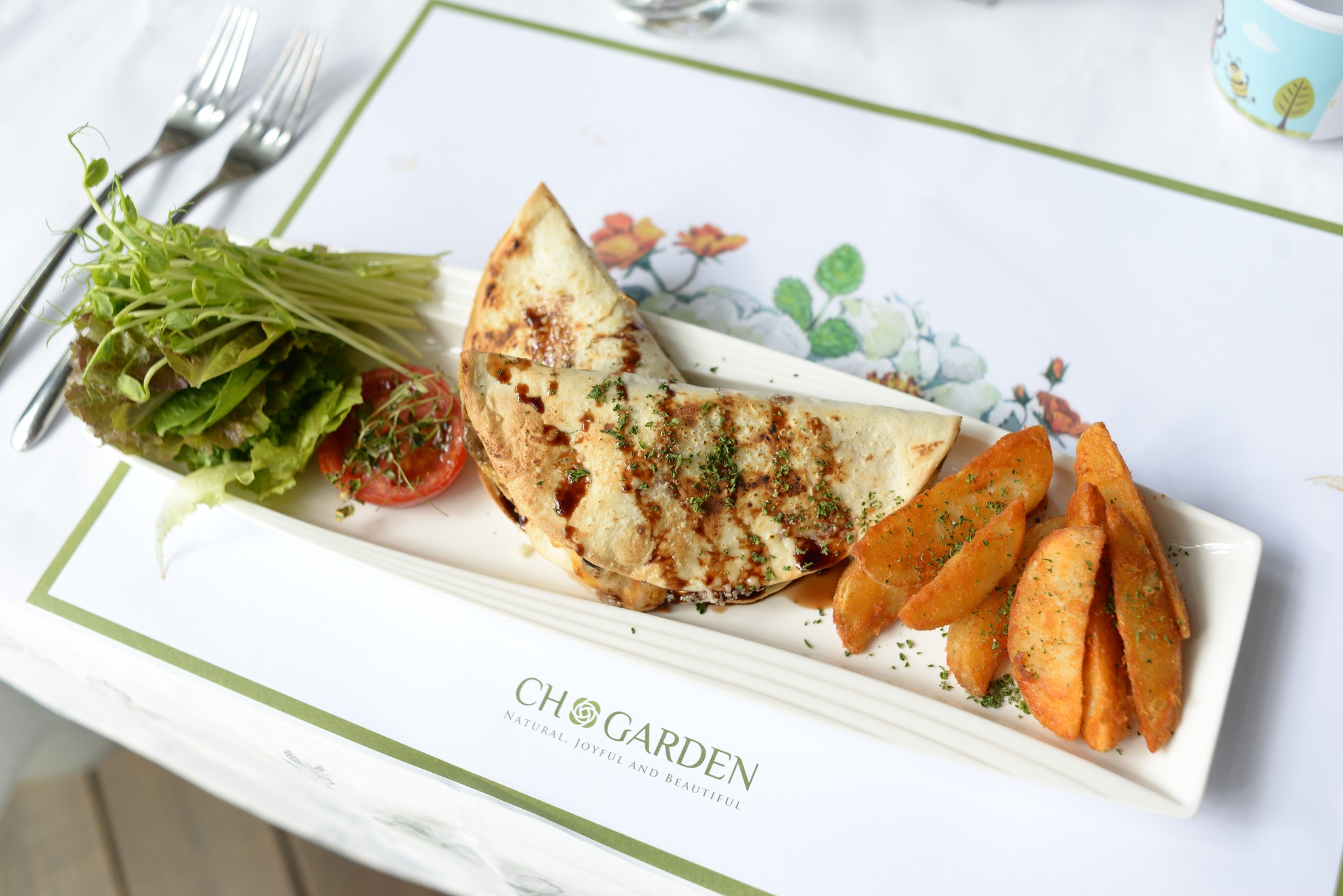 [法式經典素食套餐] 貓大王的主菜是『帕達諾起司風味牛肝菌蕈菇蔬菜餅襯烤馬鬱蘭有機番茄』,烤餅部分趁熱吃非常好吃,似乎是淋上黑醋栗醬,甜甜鹹鹹的風味,大勝舒果的卡洛佐尼枕頭披薩。生菜部分無任何調味,感覺很像馬兒吃草。薯條雖然很熱很香脆很好吃,但有點違背蔬果鮮食的精神,我還是很開心的把它吃光光。