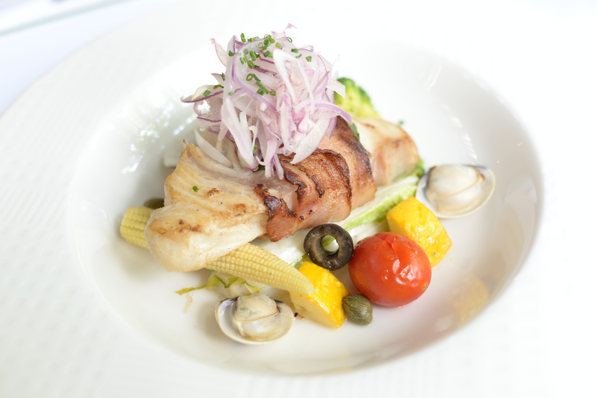 [白酒羅勒培根銀鱈與澎湖小卷佐哈礪酸豆黑橄欖醬汁] 我的湯品有兩種可以選,因素食餐是濃湯,所以服務人員建議我選『海瓜子新社白精靈菇柴魚清湯』。這道湯品我覺得有些偏鹹(和其他菜色相比),但小妞超愛,整碗被她喝花花。
