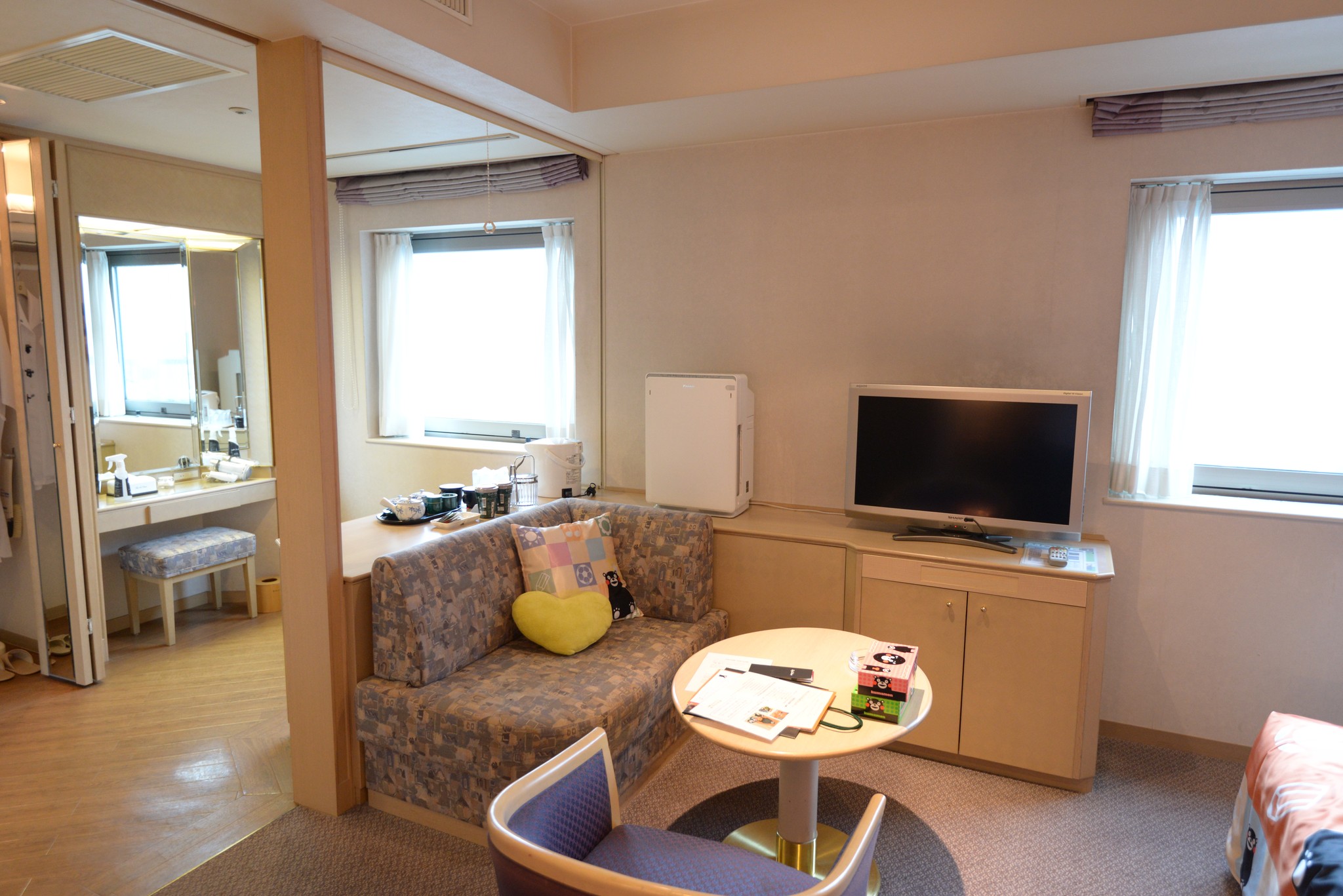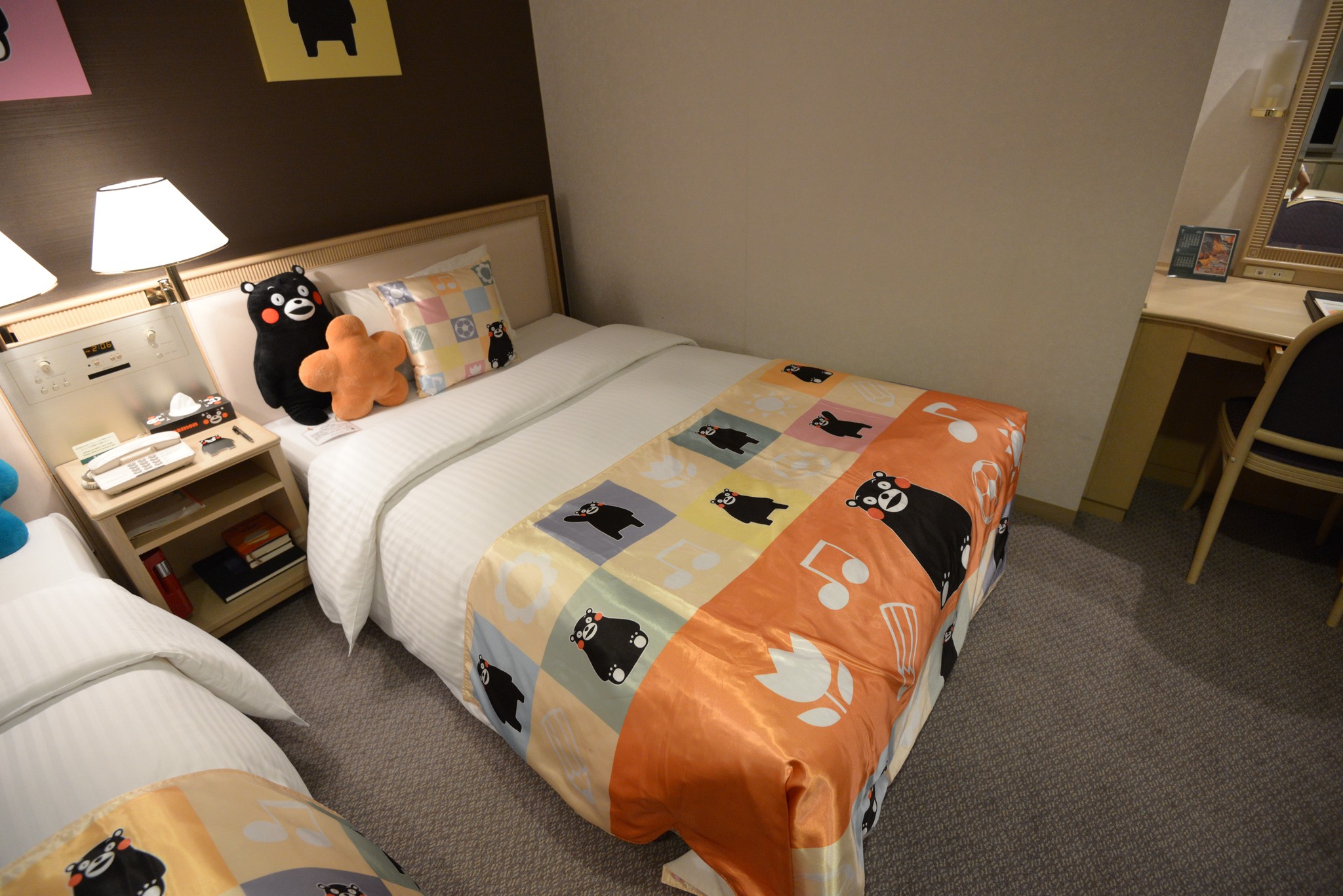 被門房帶進位於最高樓層的 Kumamon 房,一進房有些傻眼,房間是很大沒錯(35平米),但除了床舖區外,其他的區域完全是老舊飯店的感覺,空氣裡還彌漫一股霉味,地毯上看得出使用很久的痕跡。嚴格上說起來,硬體上只有床頭那面牆有 Kumamon 的裝飾,床包有使用 Kumamon,其餘的就放幾個 Kumamon 的抱枕和毛巾備品。真的是太不用心了!