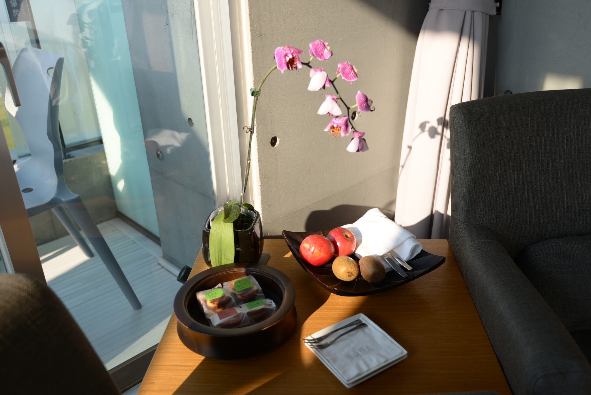 我們的房間就在照片中主體建築的最右側,老實說我不是很愛清水模這種冷冰冰的建築,但在台灣似乎不跟著安藤忠雄走就不算是前衛的設計師,偏偏台灣的工法又不是很到位,細看會覺得像是住在毛胚屋一般。
