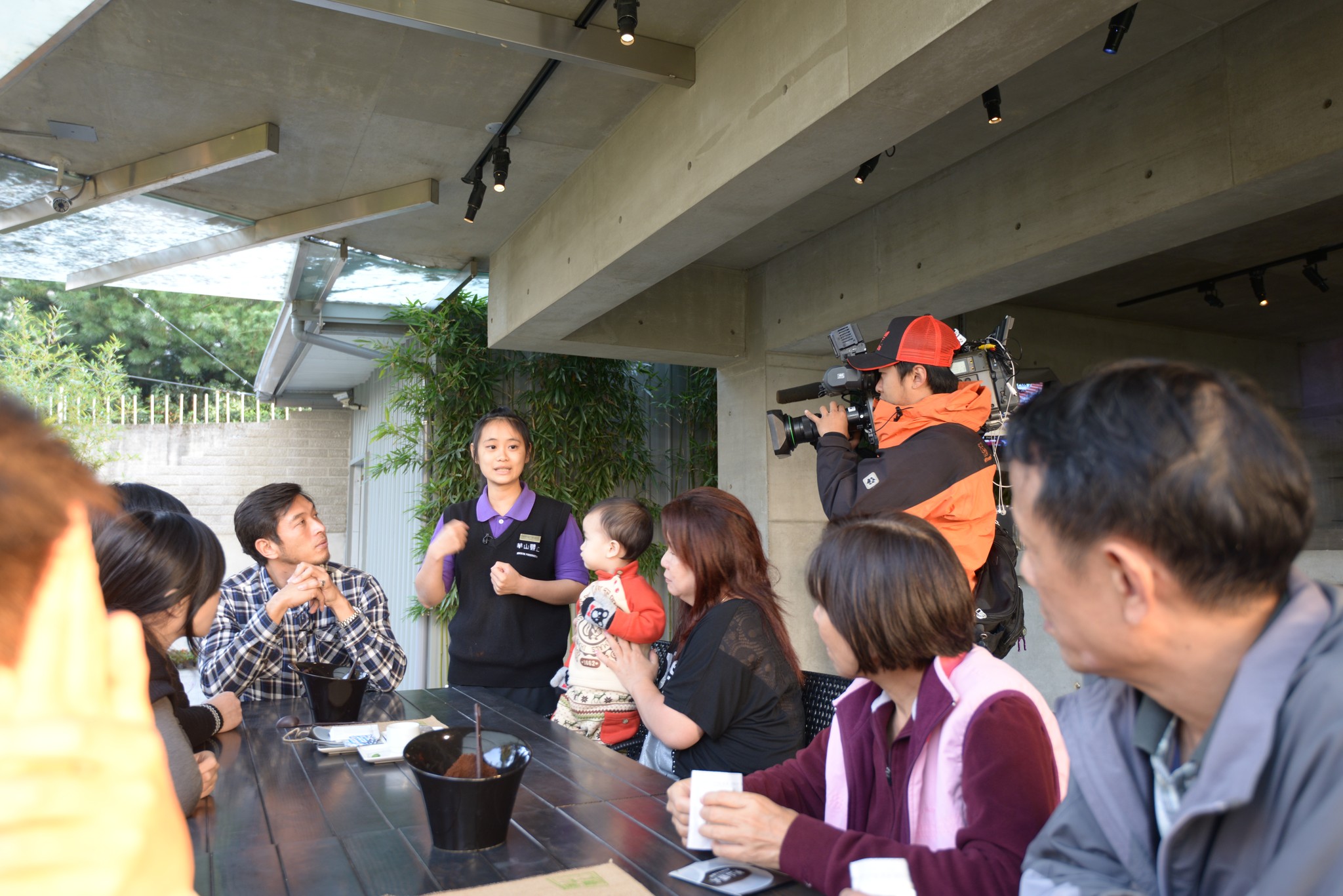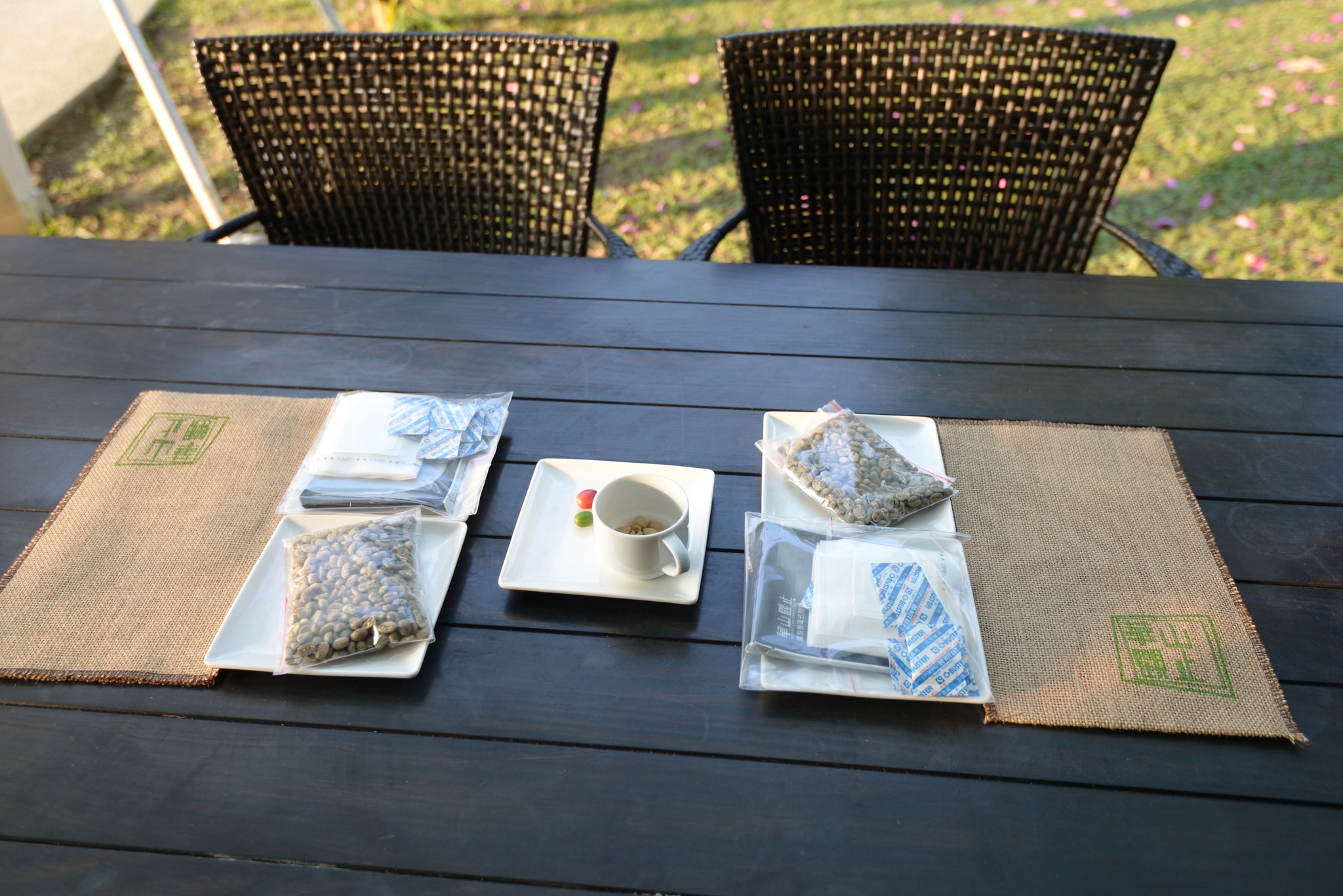 正巧來的這天非凡新聞台來此拍旅遊節目,我們參加的體驗咖啡 DIY 差點無法成行,後來被告知會有記者在一旁攝影,我們並不介意,只是 DIY 的時間與介紹的流程被打亂。DIY 的原料如桌上這些,有樹上採下來的咖啡果實(紅色是可採收),一包已曬過一星期的豆子(之後會拿去機器內烘焙),掛耳式咖啡的包裝袋(烘完咖啡可直接磨粉裝袋帶回家沖泡)。