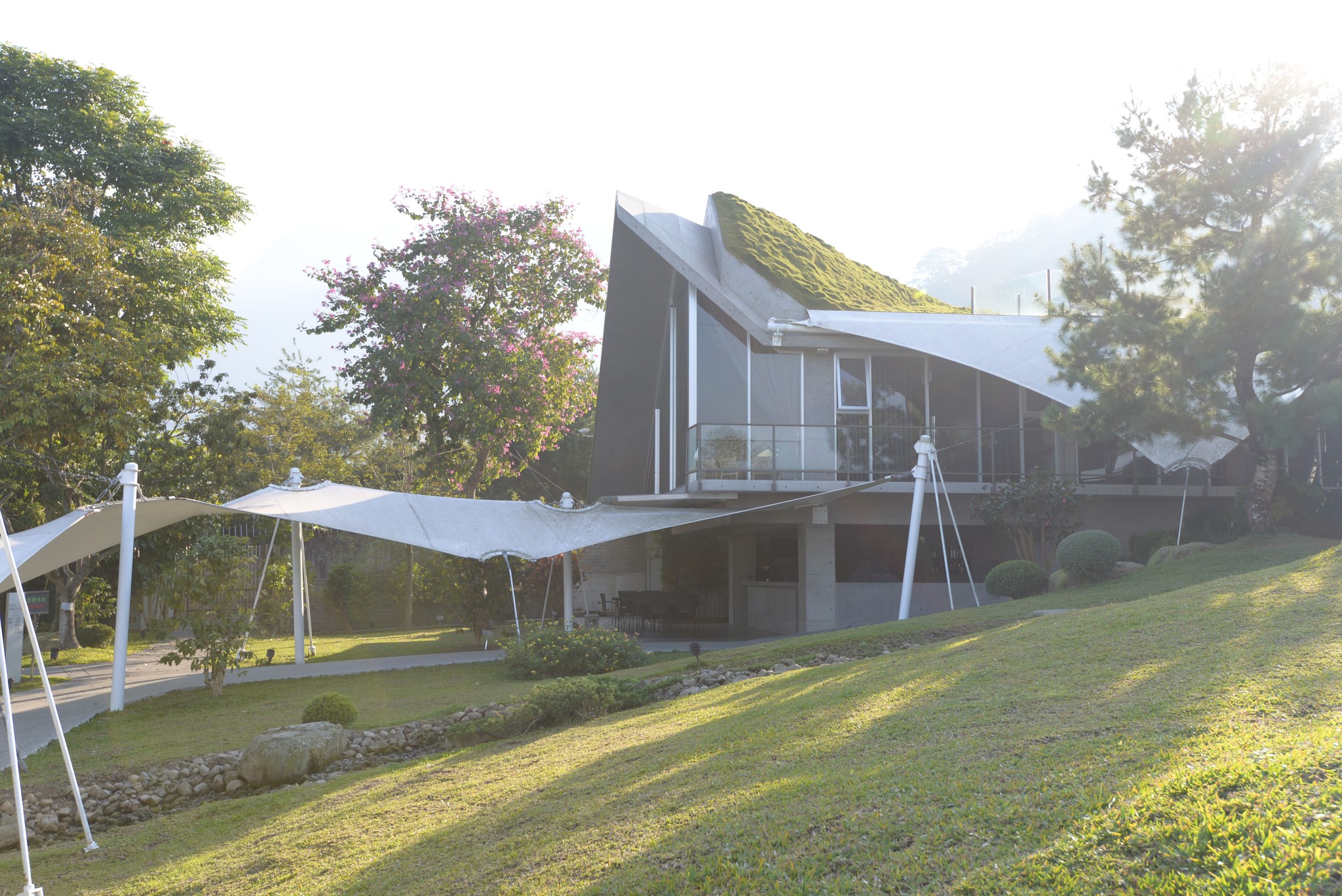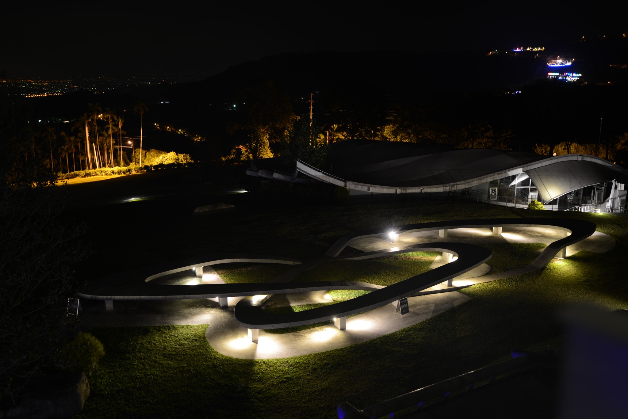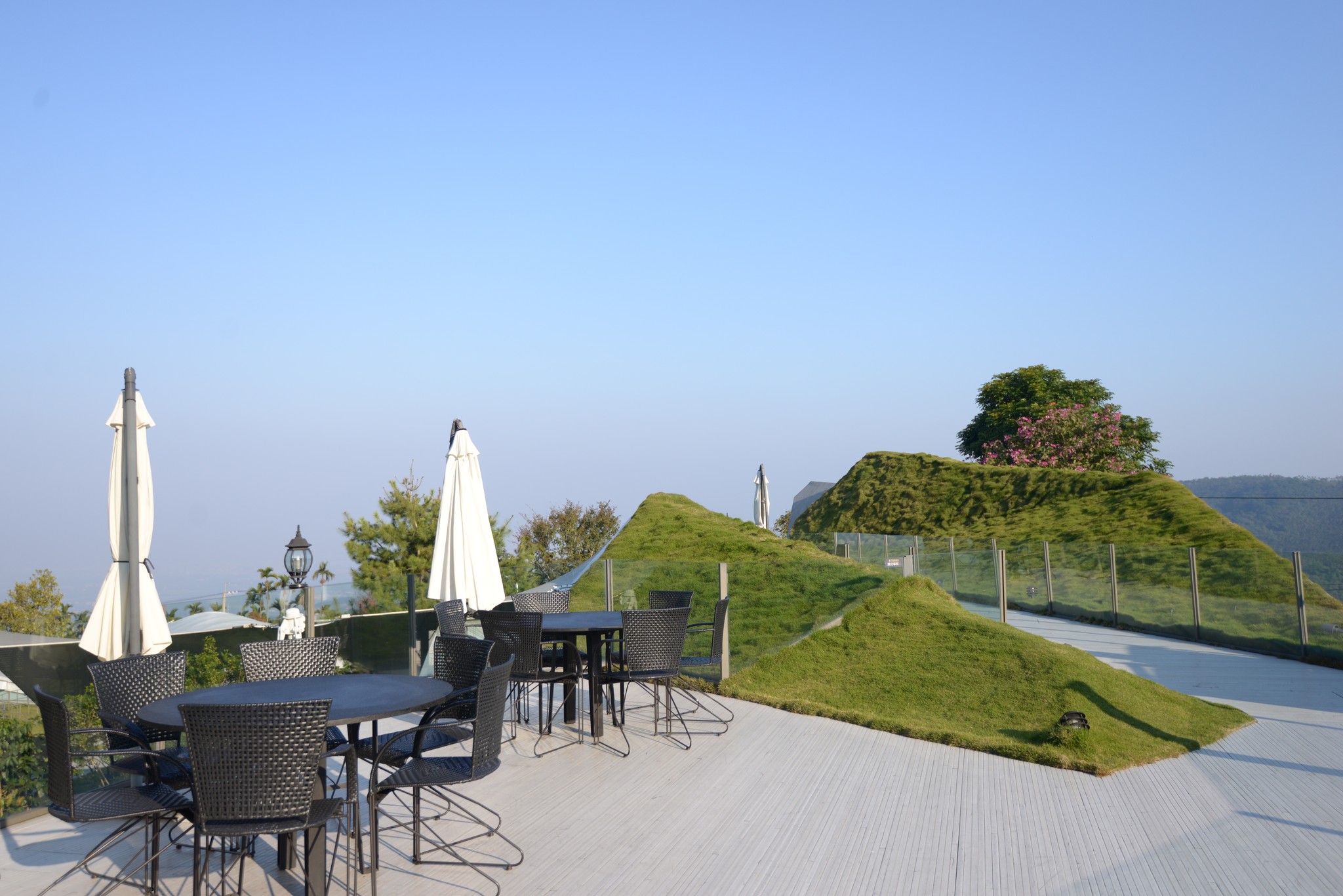 爬上屋頂看到的就是這樣的景致,高低起伏的草皮和遠處的山峰相呼應,非常有趣的一項設計!夜間我曾爬上這屋檯上想拍拍三縣交界的夜景,可惜不夠高,視線被會被遮蔽,晚間十一點園區內的燈就關閉了,我扛著相機大砲活像是個偷拍的怪叔叔。