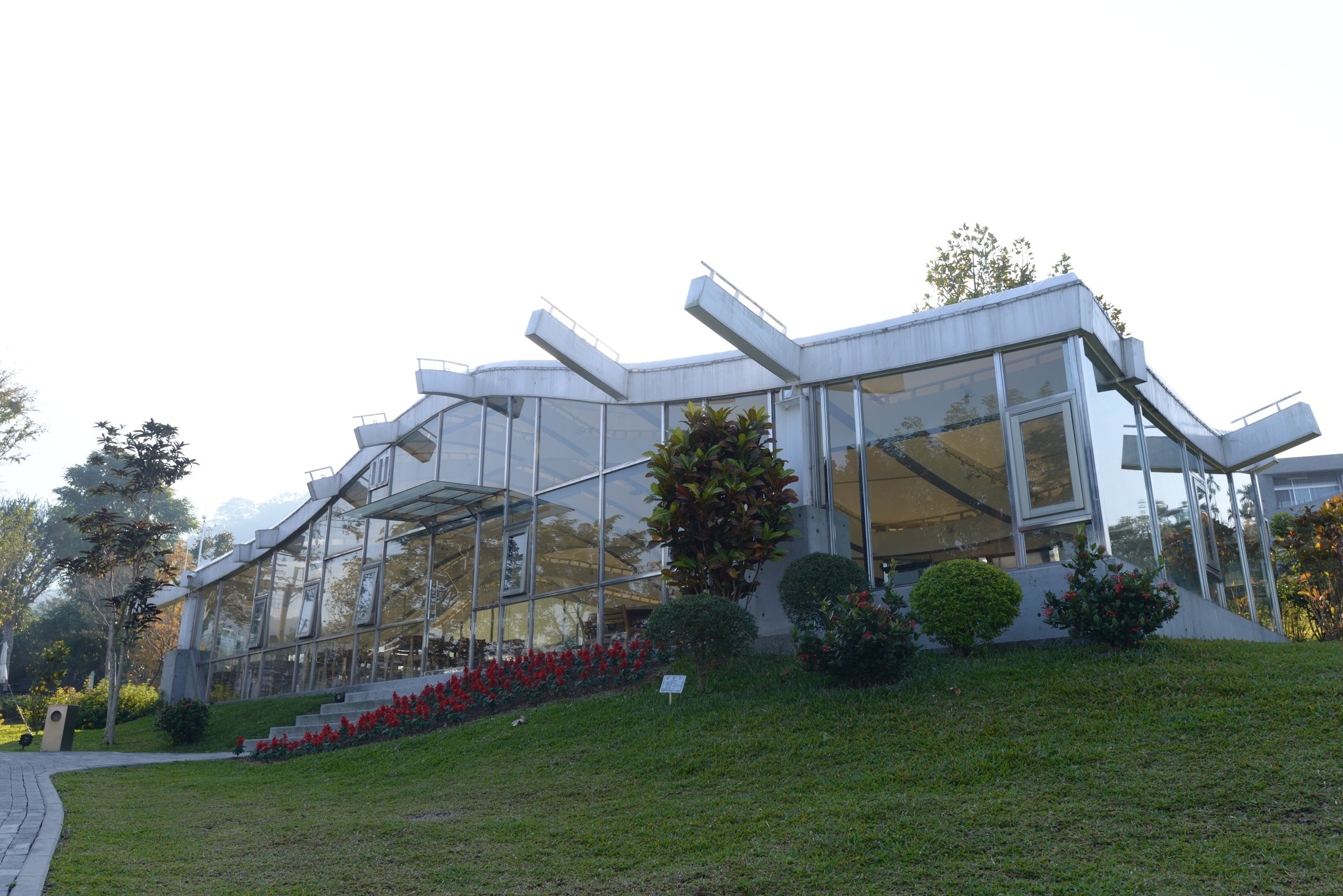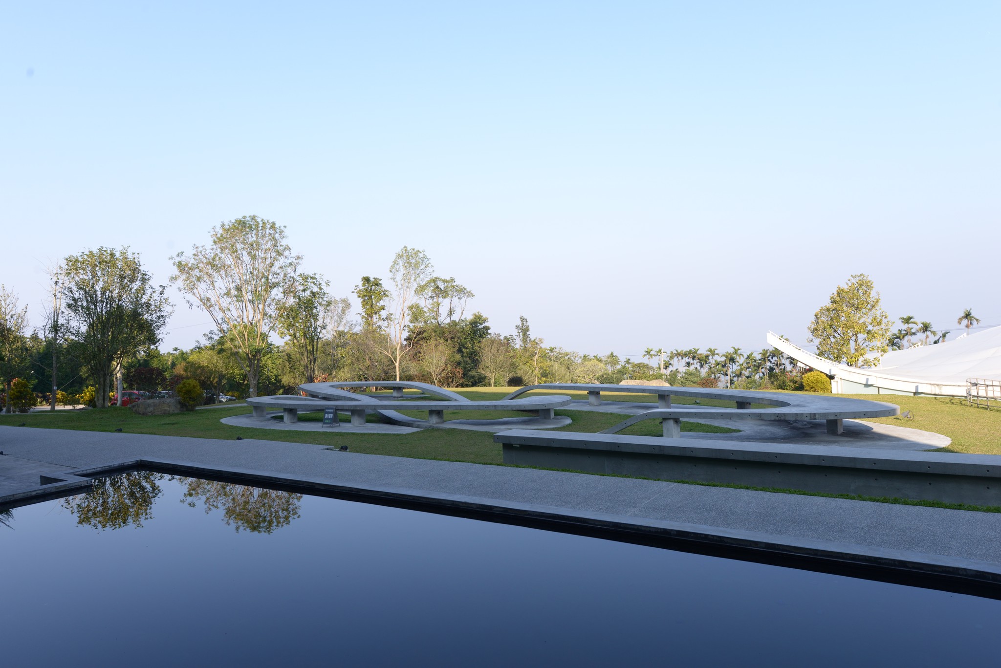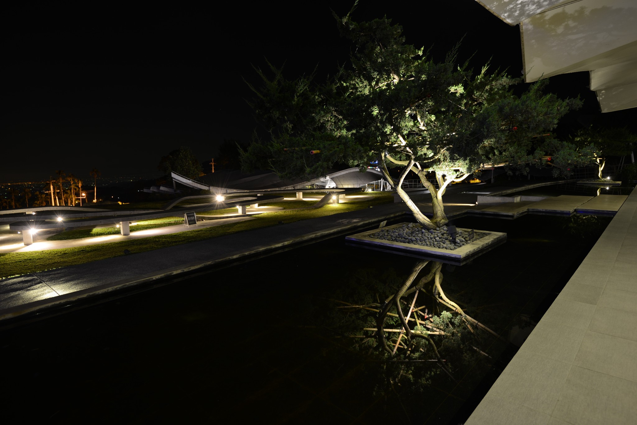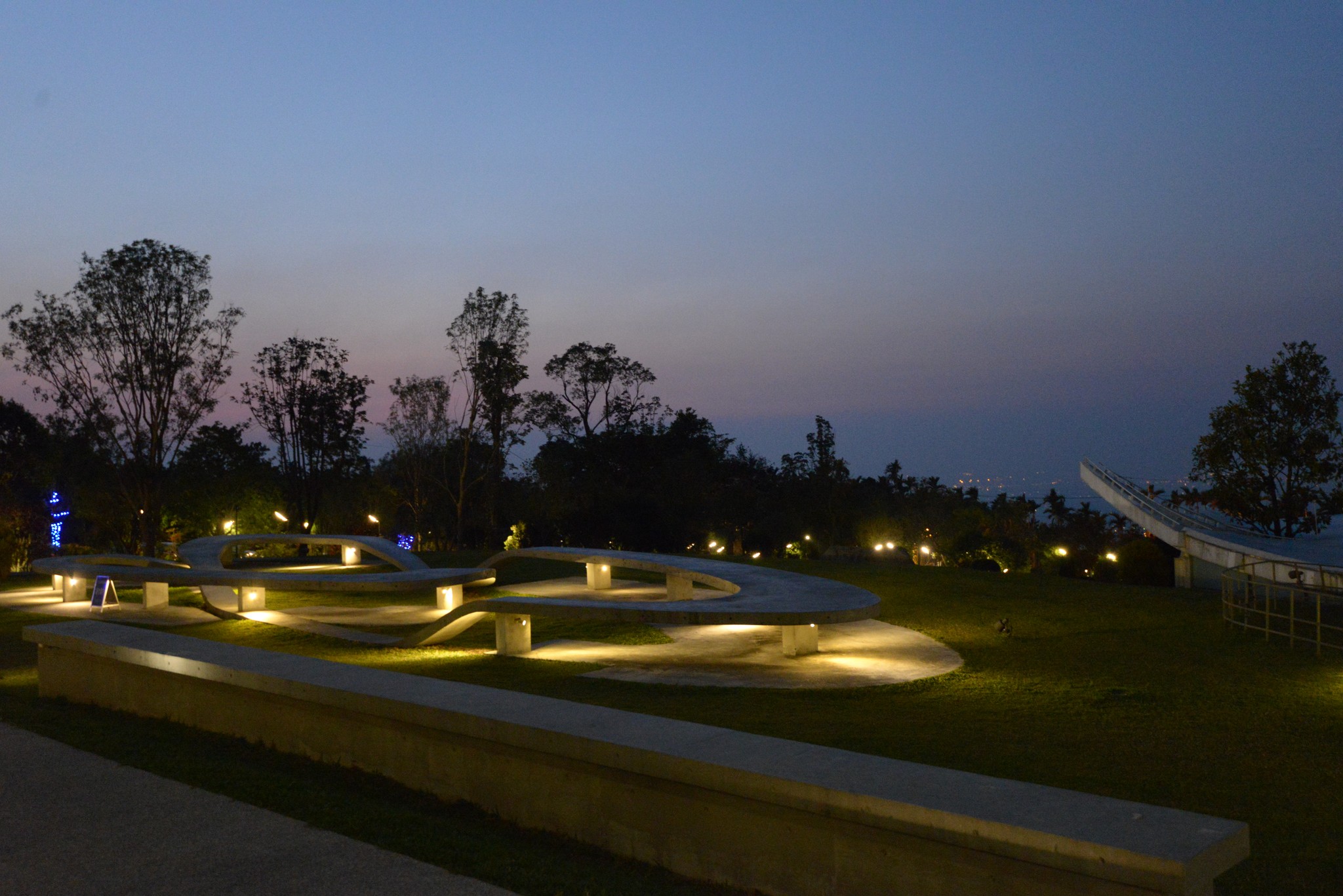 爬上屋頂看到的就是這樣的景致,高低起伏的草皮和遠處的山峰相呼應,非常有趣的一項設計!夜間我曾爬上這屋檯上想拍拍三縣交界的夜景,可惜不夠高,視線被會被遮蔽,晚間十一點園區內的燈就關閉了,我扛著相機大砲活像是個偷拍的怪叔叔。