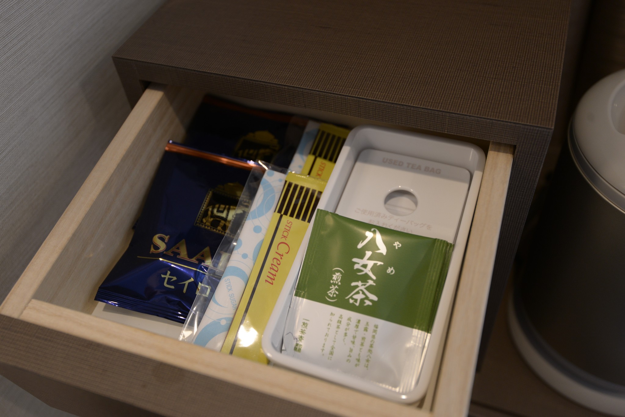 小抽屜打開有九州出名的八女茶,神奇的是一旁藍色包裝並不是常見的咖啡,而是立體茶包裝的紅茶。紅茶好喝,所以每晚我都先 A 進行李箱內讓隔天的 house keeping 補。