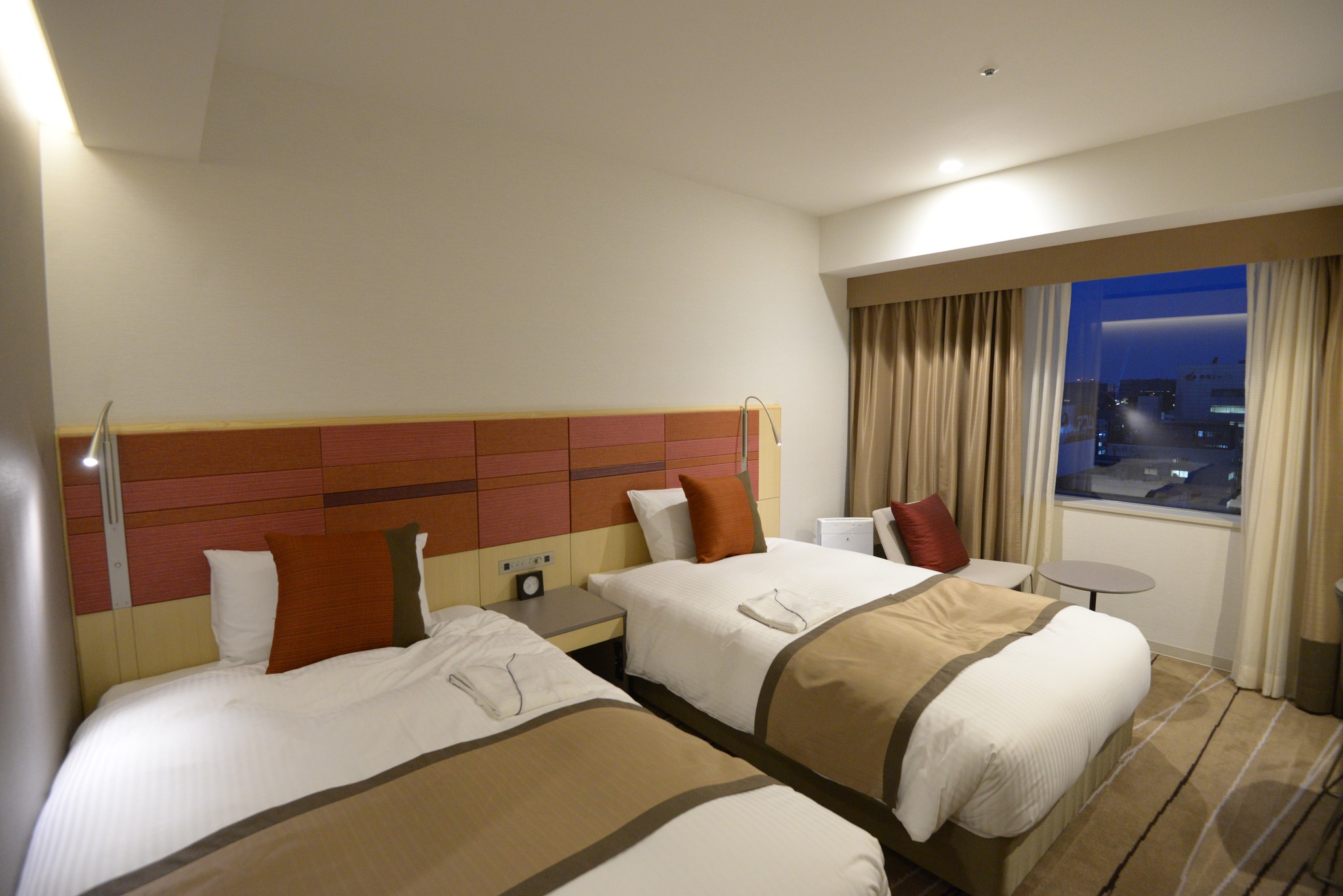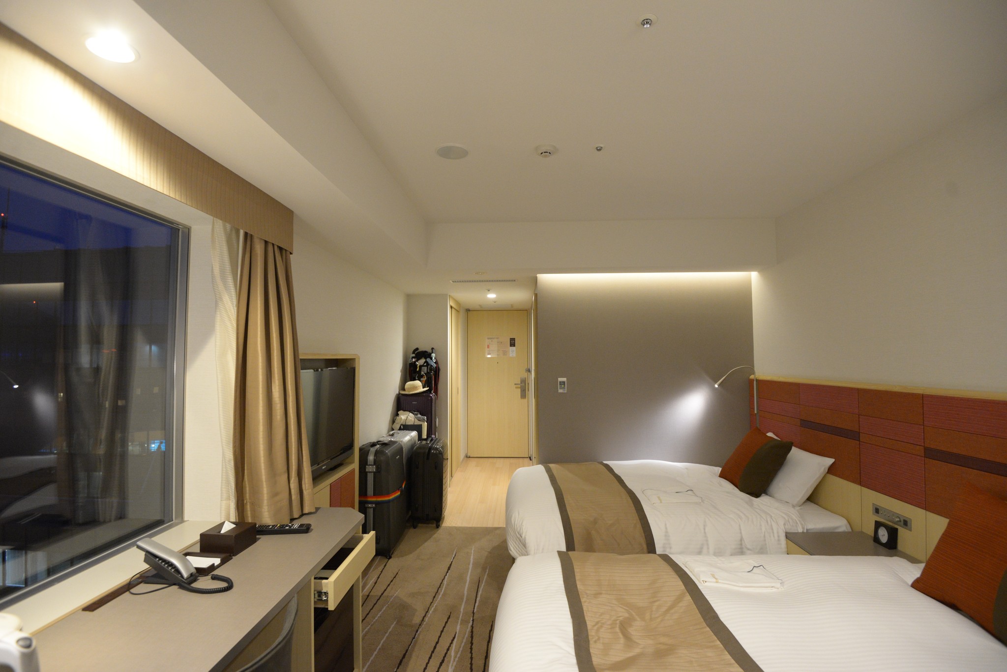 再來就是房間嘍。這回我們住的是 25㎡ 禁煙ツインルーム,頭一晚住的是 302 ,就是上圖 1402 的大小,屬於短胖型,後四晚住的是 1405 ,狹長型的房間。感覺上短胖型的空間感較大,但這間 1402 有兩扇窗,算是各有優點。這回正好有 book 到【開業記念プラン(朝食付き)】 特別料金でご案内的 plan,這 twin 的房型含早餐一晚 11,400 隻羊,相同房型的普通 plan 要價 ¥18,800,我們住五晚算是賺很大!