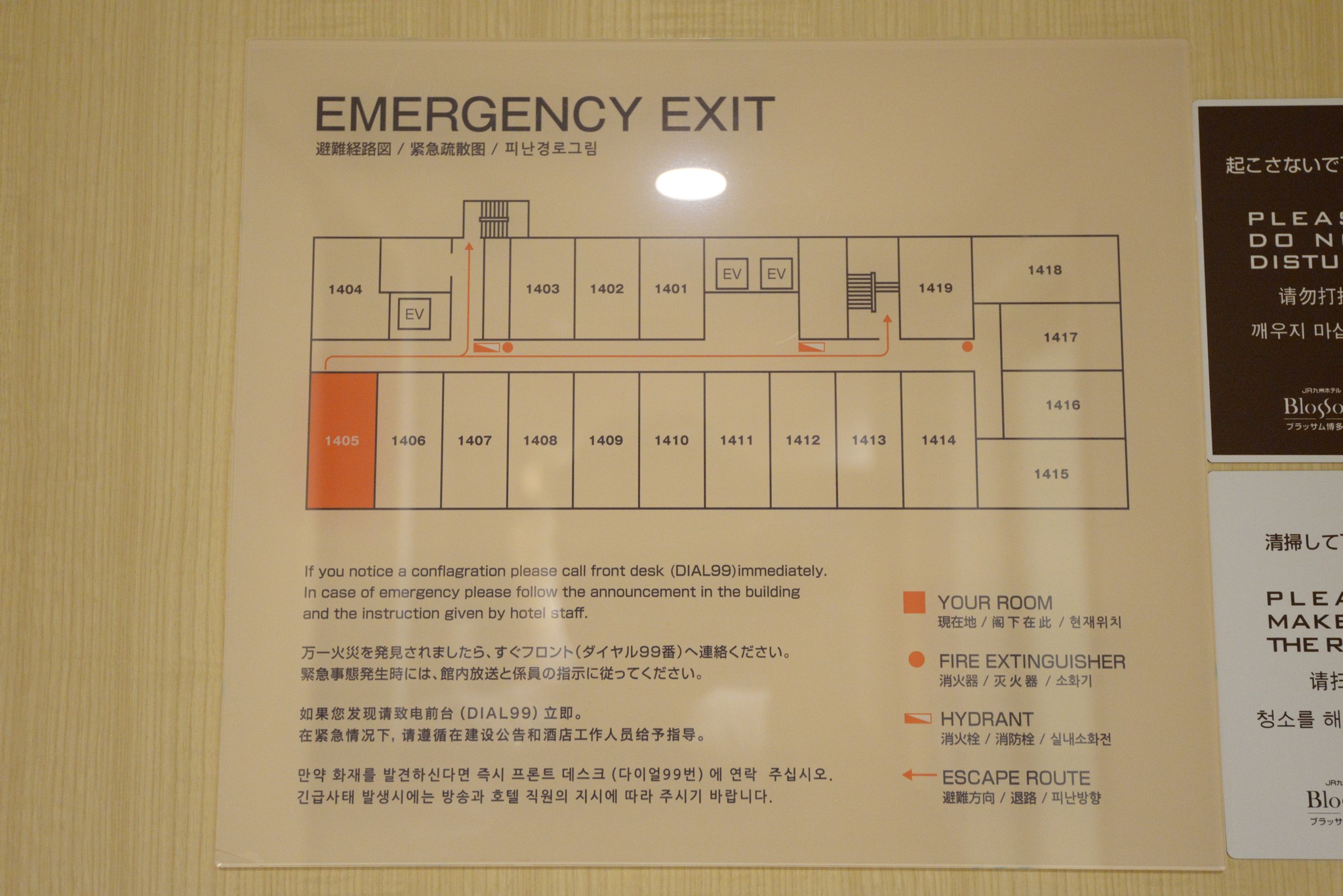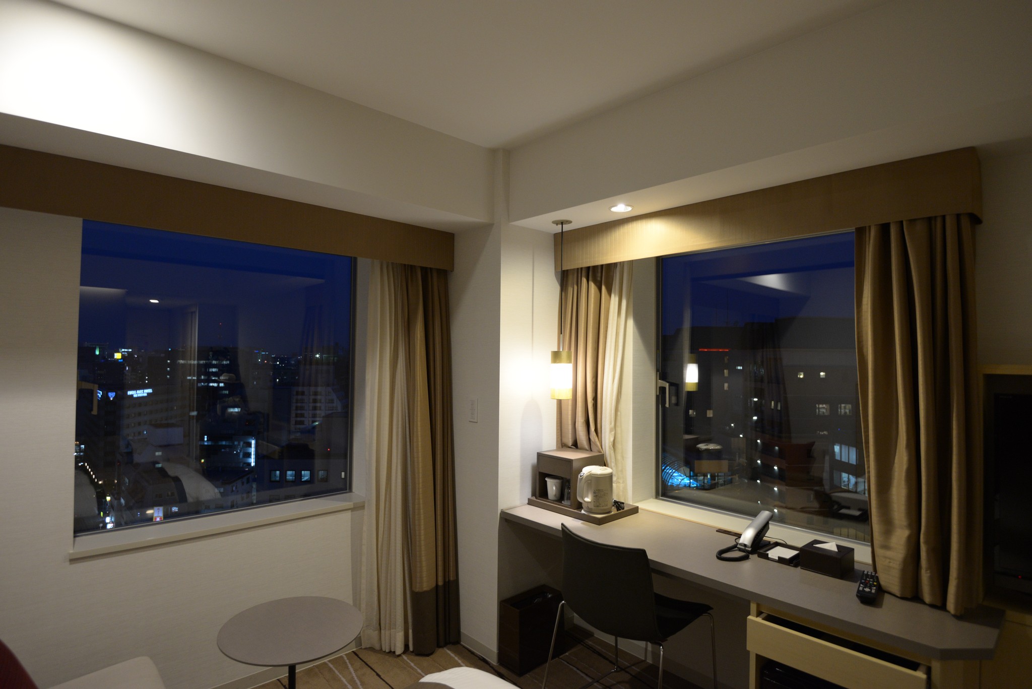 1405 這間位在邊間且又在最高樓,窗戶開兩面,一整個開心呀,雖然博多沒什麼夜景可看,但窗邊多出來的空間當成書桌的延伸也是蠻棒的!桌上有一快煮壺,抽屜下有冰箱,要注意的是,使用前請將開關打開(冰箱內),因為冰箱一般都不會和房卡控制的總電源連動,否則離開房間冰在裡面的東西不就會壞了,但有些人不會用冰箱,always 供電也不節能環保,所以有這樣的設計。而桌上有有線網路,速度比 Hinet 50MB 還來得快!