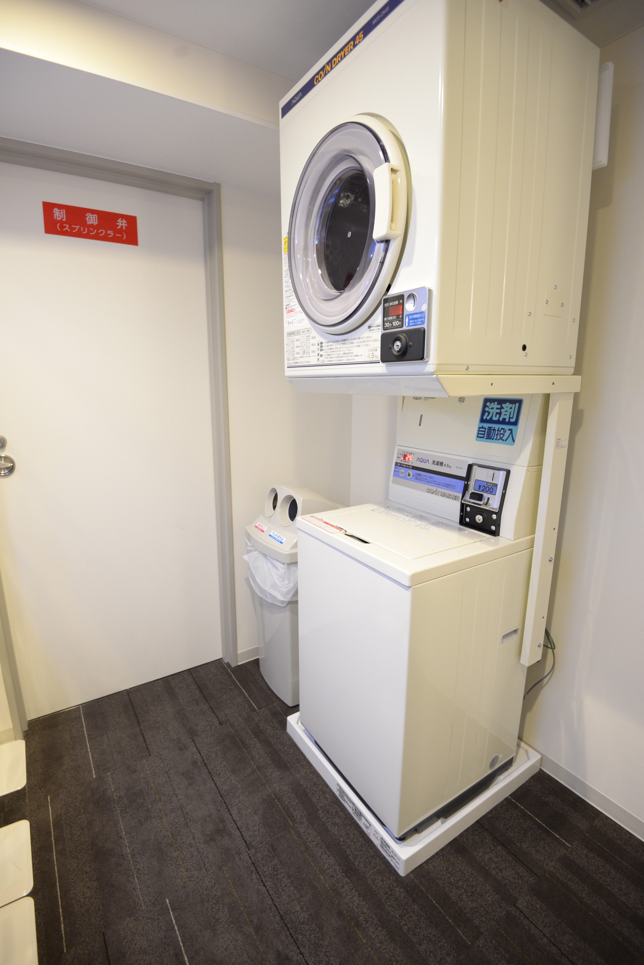 而右手邊是洗衣乾衣機,洗衣兩百隻羊,洗之前它可以清洗洗衣槽,且洗劑也含在內,我們還傻傻的帶洗衣粉,洗衣 30 分鐘。上頭的乾衣機一百隻羊,一樣 30 分鐘,但我使用後發覺沒有全乾,烘兩次可能會比較好,但我沒時間等待,直接拿回房間的衣櫃掛著,一晚也就乾得差不多了。