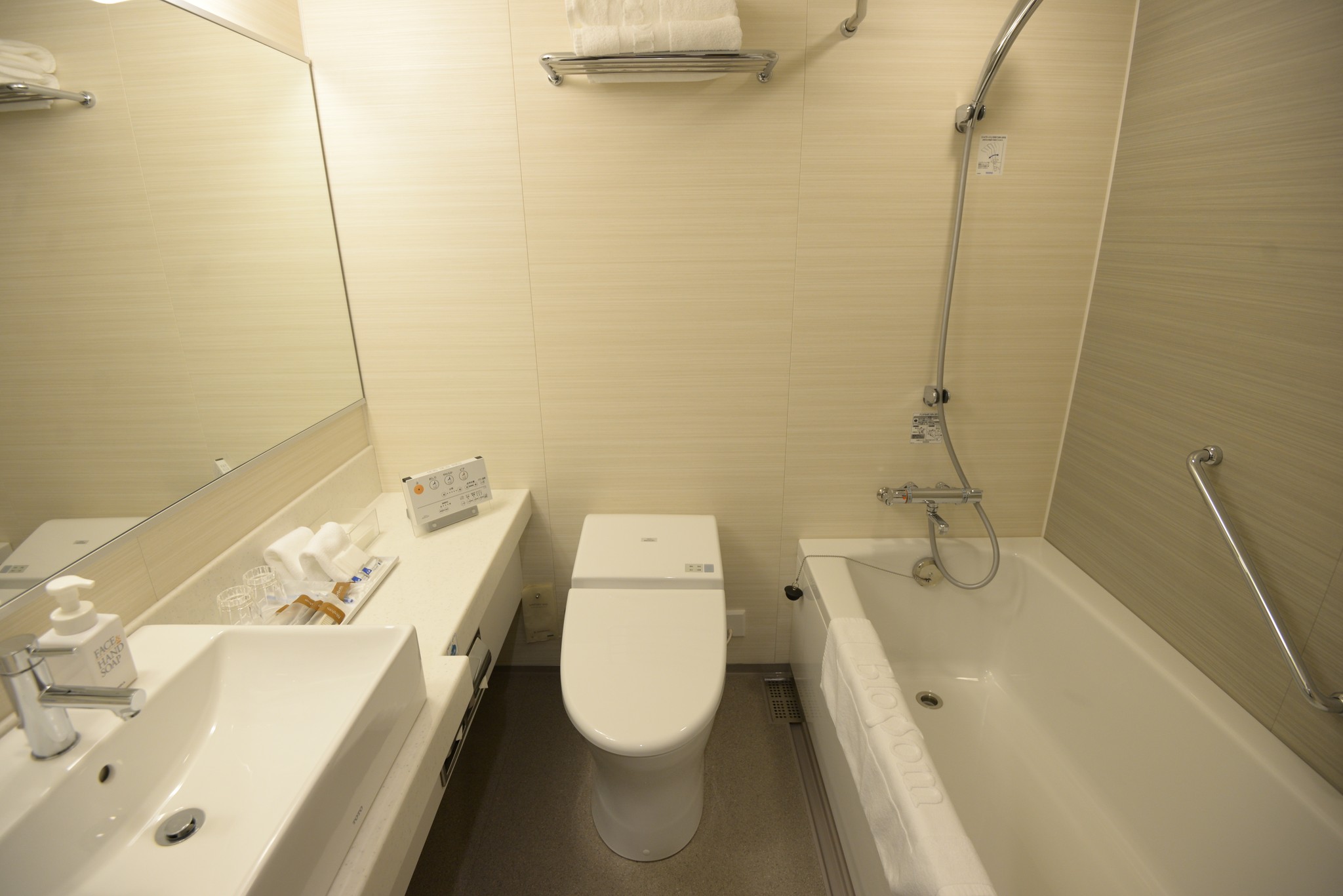浴室的配置!空間算是不小,雖無乾濕分離但有浴帘可拉。水壓很不錯,住最高樓層的 14 樓水壓也夠強夠穩定,配備恆溫蓮蓬頭。
