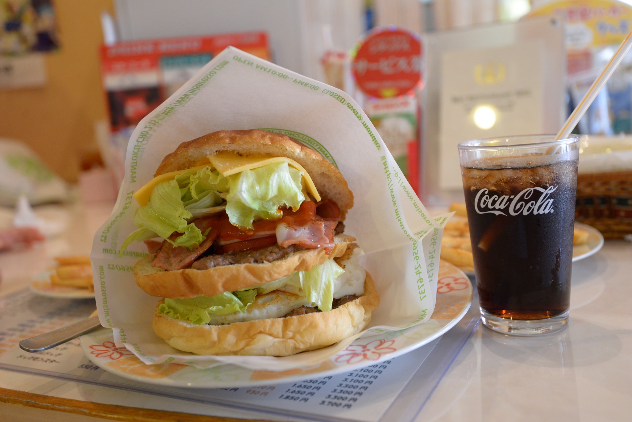 店內充滿了宅宅的氛圍,和美式洋派的氣氛完全扯不上關係,桌上有一奪命鈴,叮一下老板就會跑出來。一旁的兩位日本男子,看起來應該是做粗活的,漢堡一上來我大吃一驚,怎麼這麼大!但,他們三兩下就嗑完了。