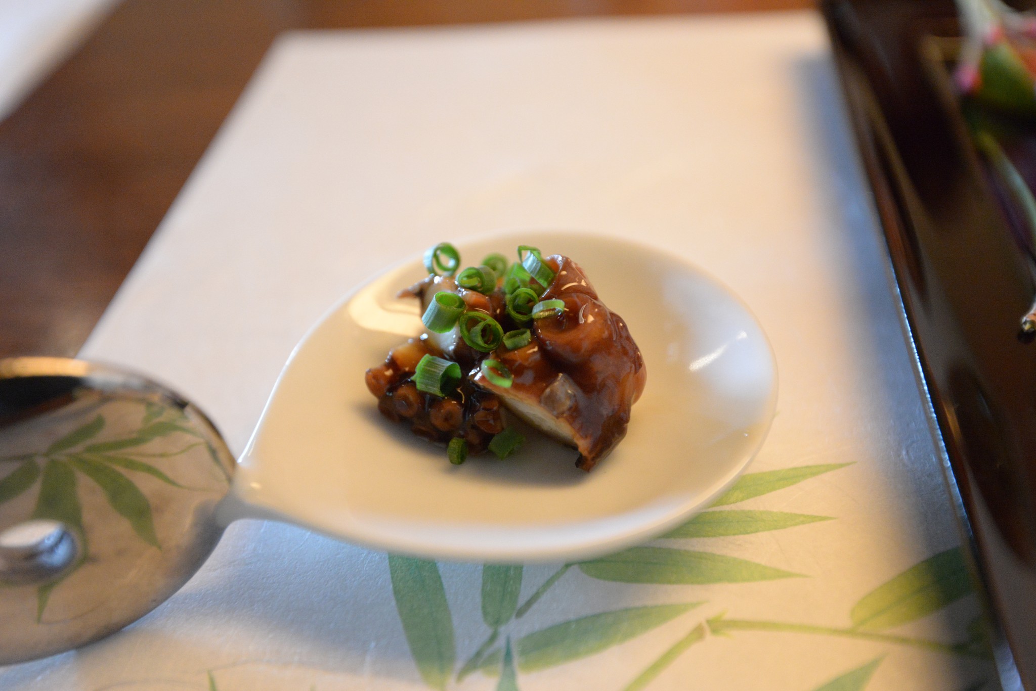 第二道是季節的八寸,這一盤由左至右分別是:鮪魚赤身和酪梨的茶巾料理,茄子翡翠煮 蝦餅 果凍,玉米葛豆腐,鴨肉 柳橙風味的醋味增,苦瓜與薄井豌豆的和風蔬菜料理,炸溪蝦,丸十炸柿籽(溪蝦的下方)。比較有特色的是茶巾料理,一開始吃不出是生鮪魚,滿口都是酪梨的香味,我還以為是水果,貓大王提醒我有生魚片時,我才發現原來這裹成一小球的茶巾外頭就是鮪魚!而玉米葛豆腐使用櫻桃梗插著方便食用,蠻特別的。鴨肉的部分猜測原菜單應該是生鴨肉,只不過我們有提到不吃生的,所以有先煎一下。苦瓜與豌豆泥意外的搭配,這一盤八寸配色完美味道豐富,水準之上!