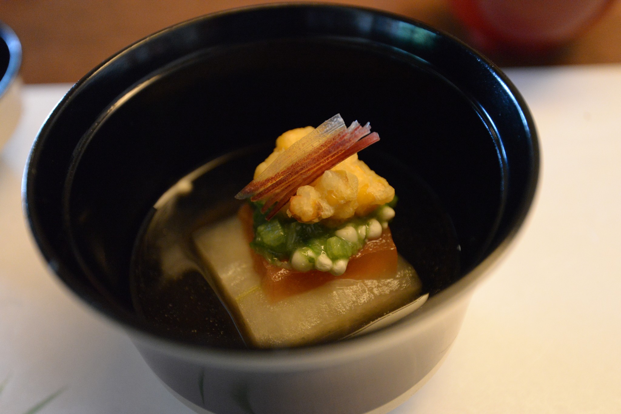 季節お椀:冬瓜裹雞肉泥 玉米炸柿籽 秋葵 針茗荷。小小一碗大大學問,讓不愛吃冬瓜的我最後連湯都喝完。