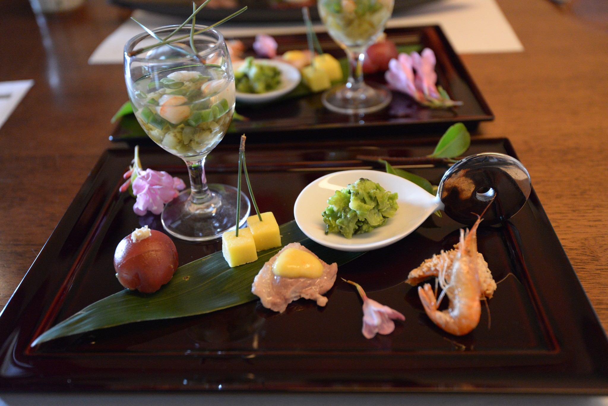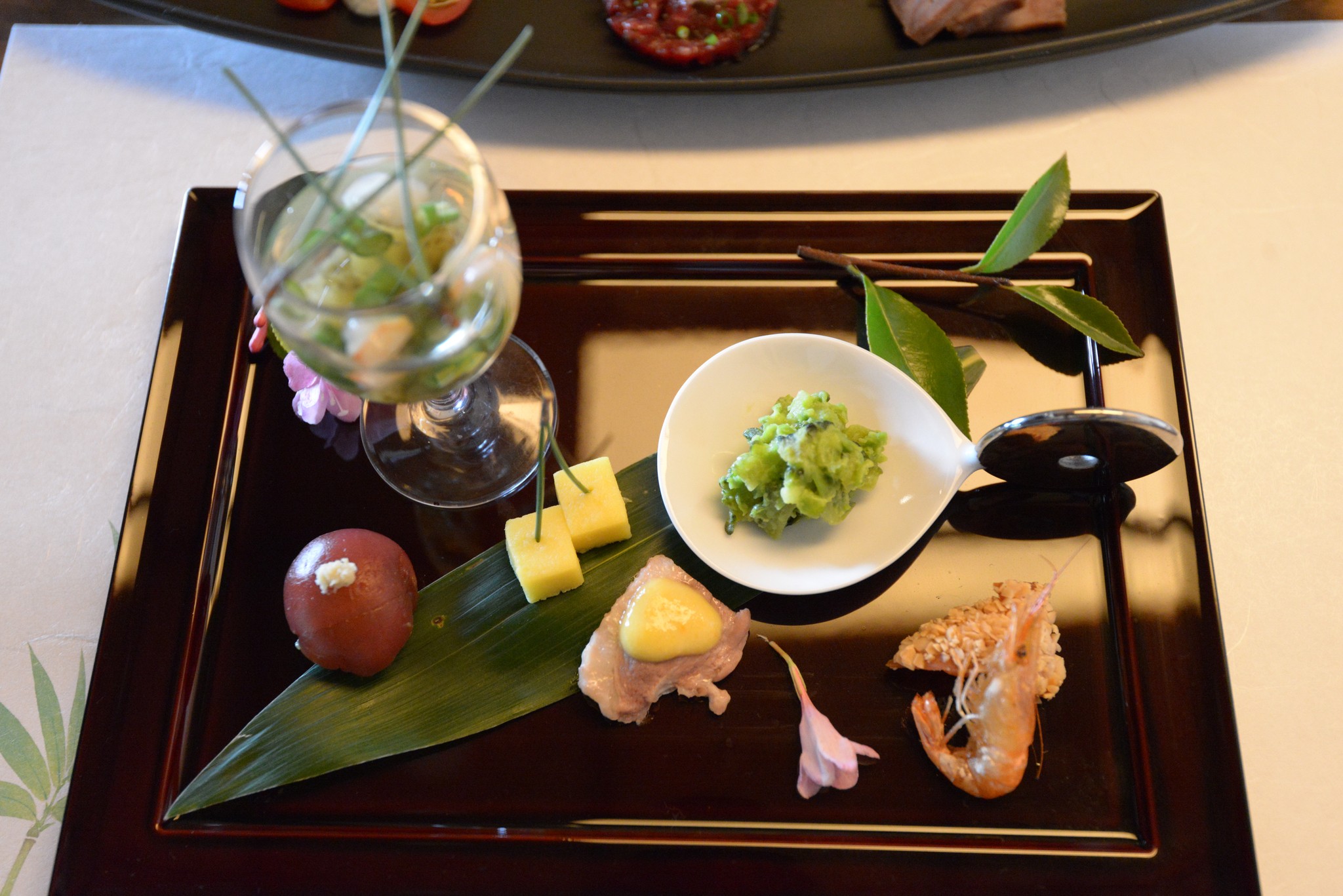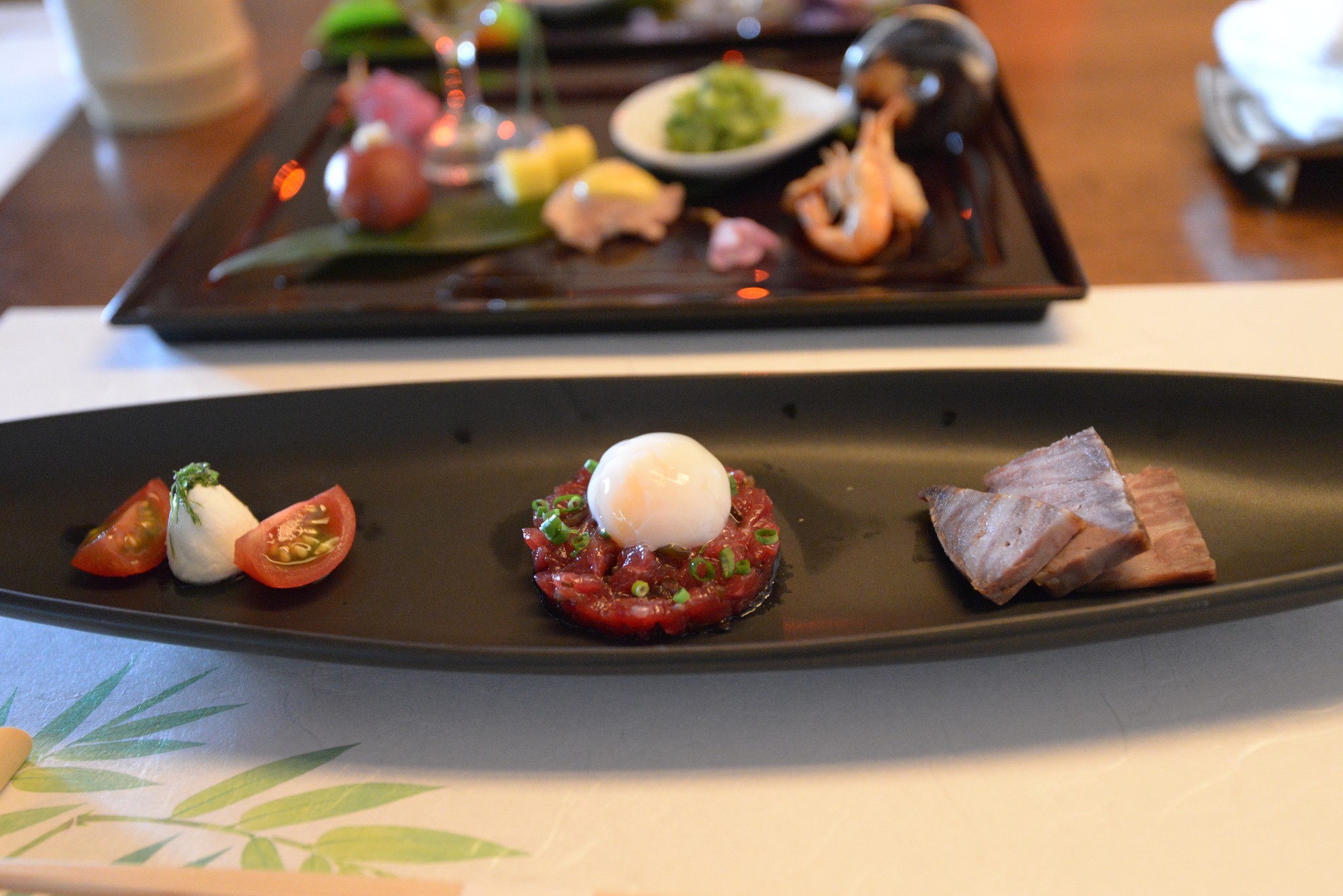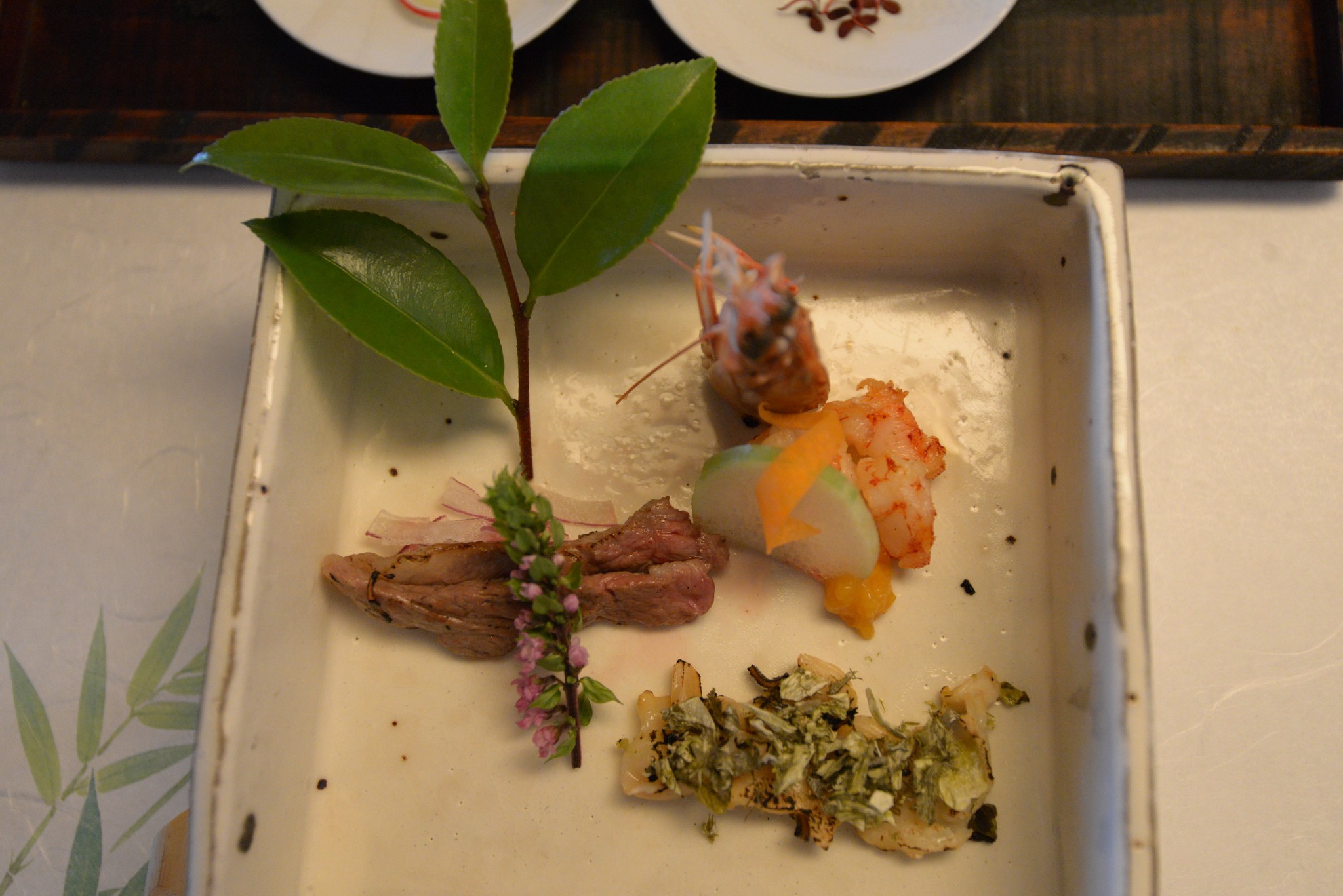 第一道上來的是『季節先付け』,也就是前菜。由左至右分別是:山間牧場特製的半熟成起司,生馬肉,阿蘇紅牛。因為 cheese 是半熟成,味道不會很強烈,搭配番茄還蠻搭的。生馬肉,這就要克服心理因素,第一次吃馬肉就吃生的難免有些不能接受,實際嘗過並無什麼特別的感覺,只希望馬上下肚,有些浪費了這個食材。牛肉的滋味就顯得有些普通。