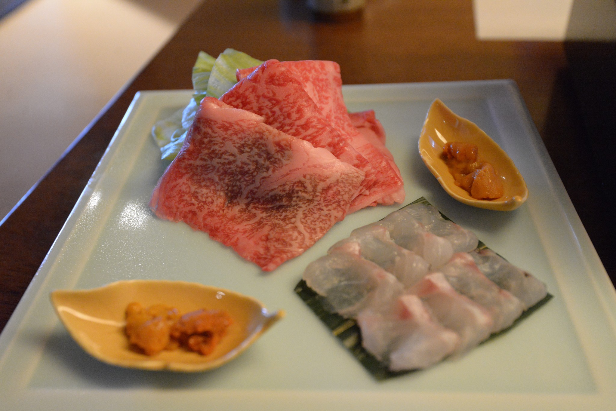 台のもの:豐後牛及天然紅鯛魚的涮涮鍋,當季蔬菜,還有菜單內沒有,主廚準備的生海膽。看看這豐後牛的油花,似乎比三嶋亭還讚。鯛魚也是新鮮得沒話說,一口豐後牛一口紅鯛魚海陸輪番上陣,最後再涮萵苣平衡一下過多的蛋白質,完美。
