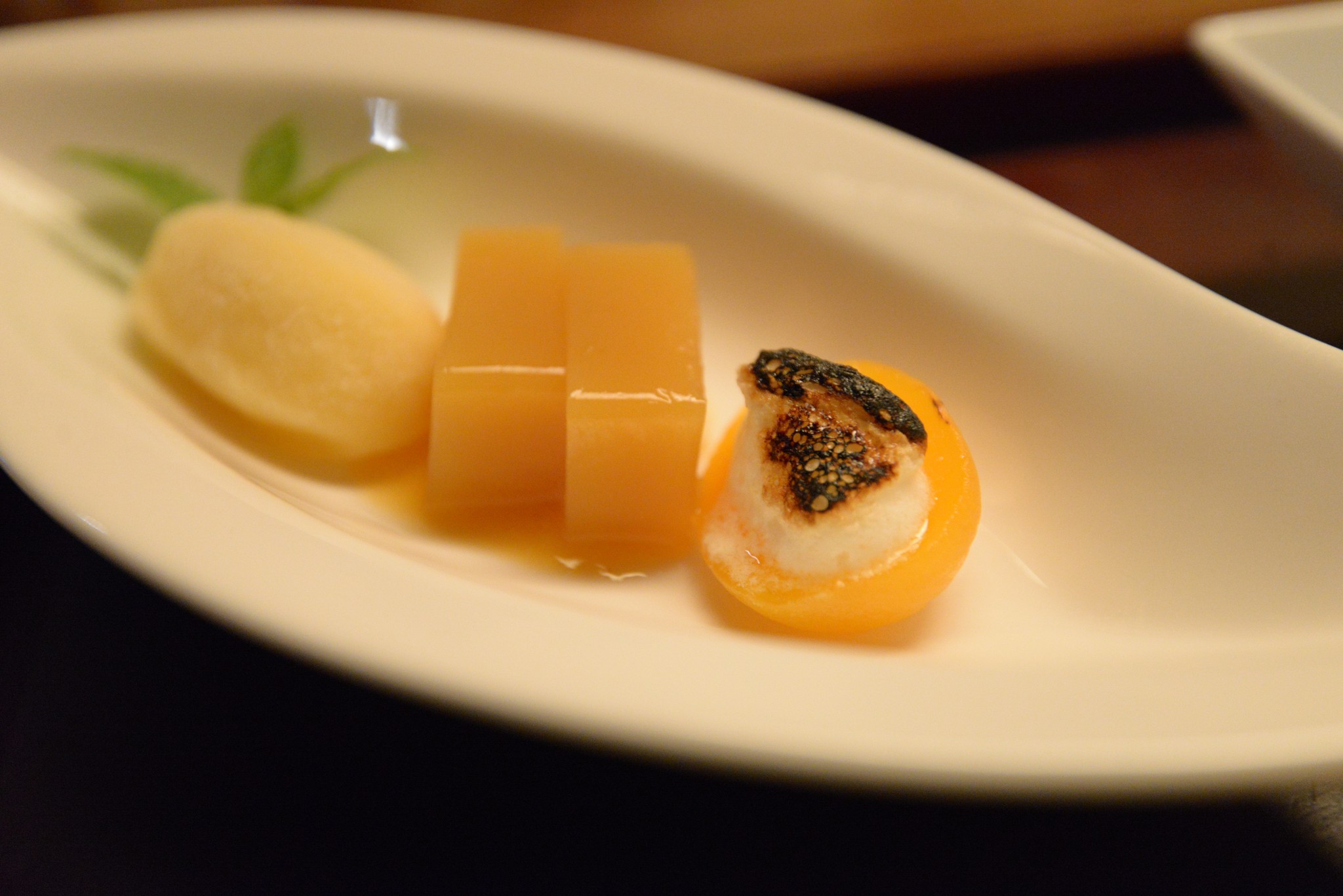 甘味:杏桃水羊羹 雪酪 水菓子。甘味是五選一,有