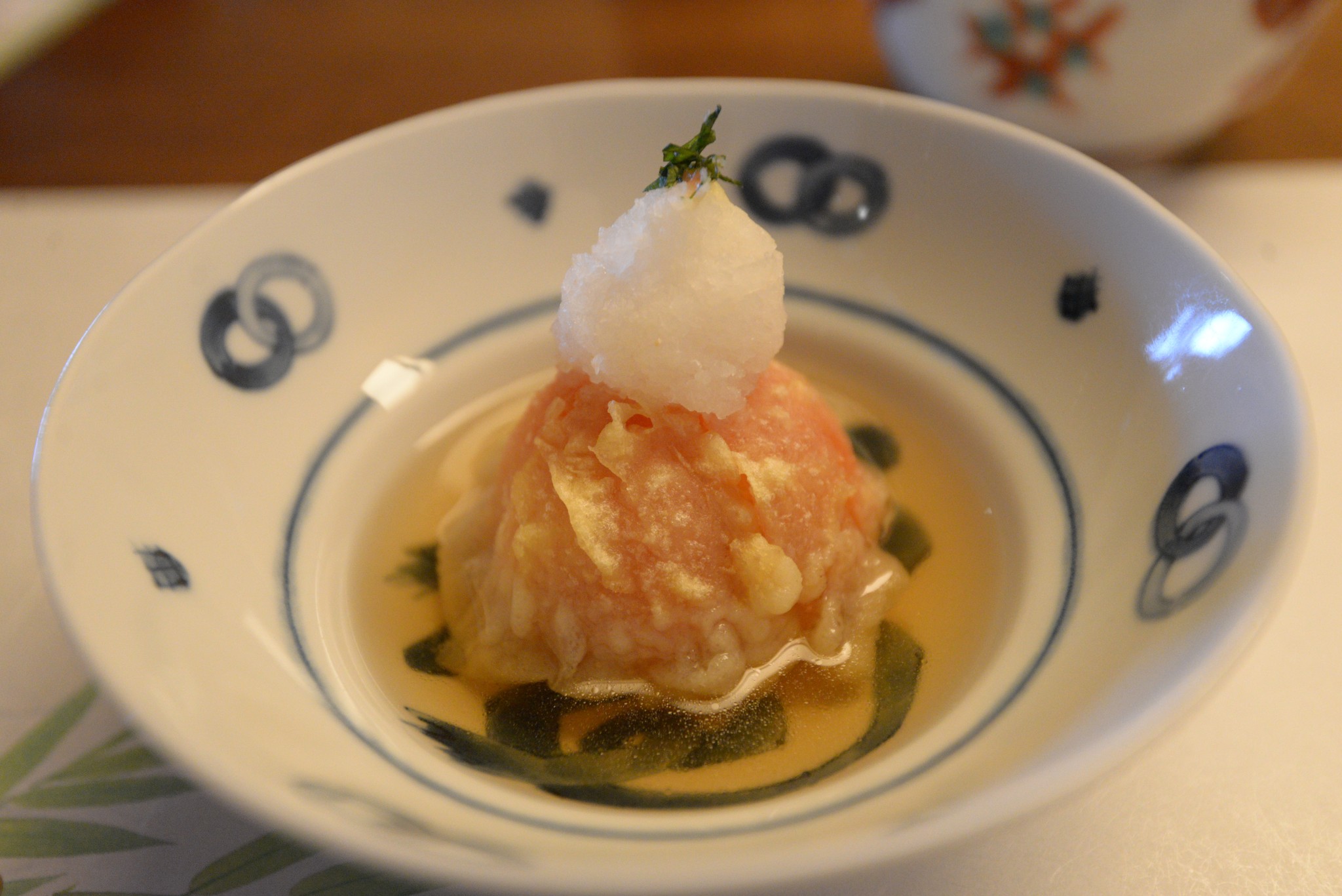 季節の揚げも:界阿蘇特製 炸蕃茄 搭配紫蘇白蘿蔔泥沾醬。這道很特別,從沒吃過的炸番茄,番茄去皮後整顆微炸,混著上頭的紫蘇蘿蔔泥,緩緩地飄出淡淡的蕃茄香,無油炸的油膩感卻有些許的酥脆,最高!