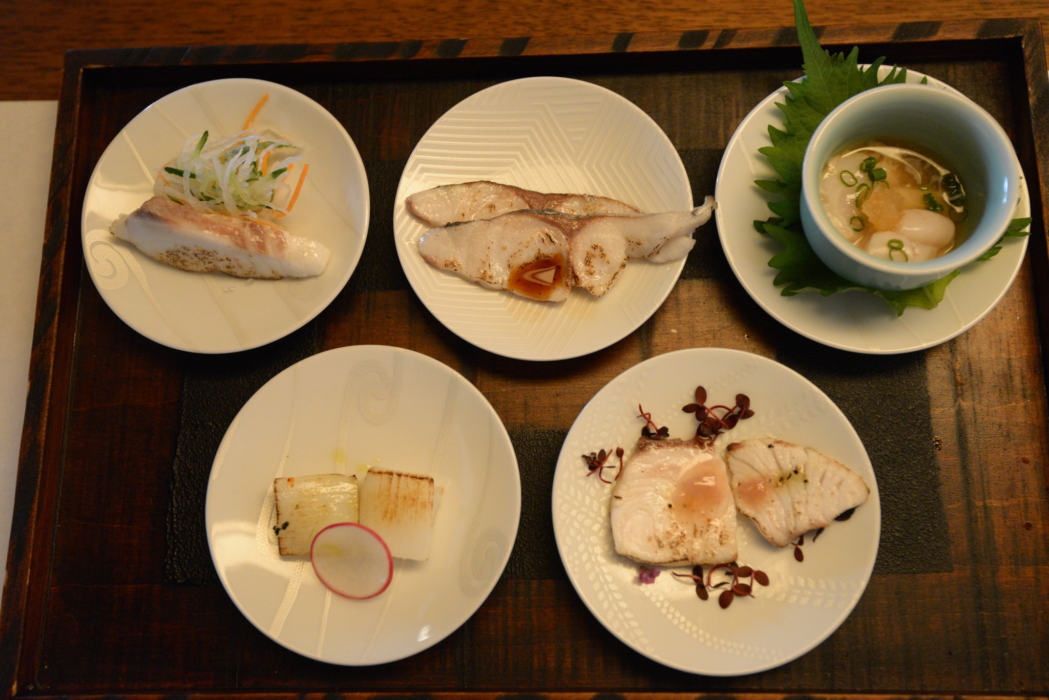 地原產地魚のお造り,界阿蘇流海鮮生魚片,這道原是生魚片,主廚幫我們加熱弄熟,上頭的醬汁維持不變:(上)鯛魚 - 酸橘和天然海鹽,高級鯖魚 - 納豆醬油,鯛魚白 - 柚子水果醋,(下)烏賊 - 紅柚子胡椒和鰐梨油,高体魚師 - 海盜醬油。