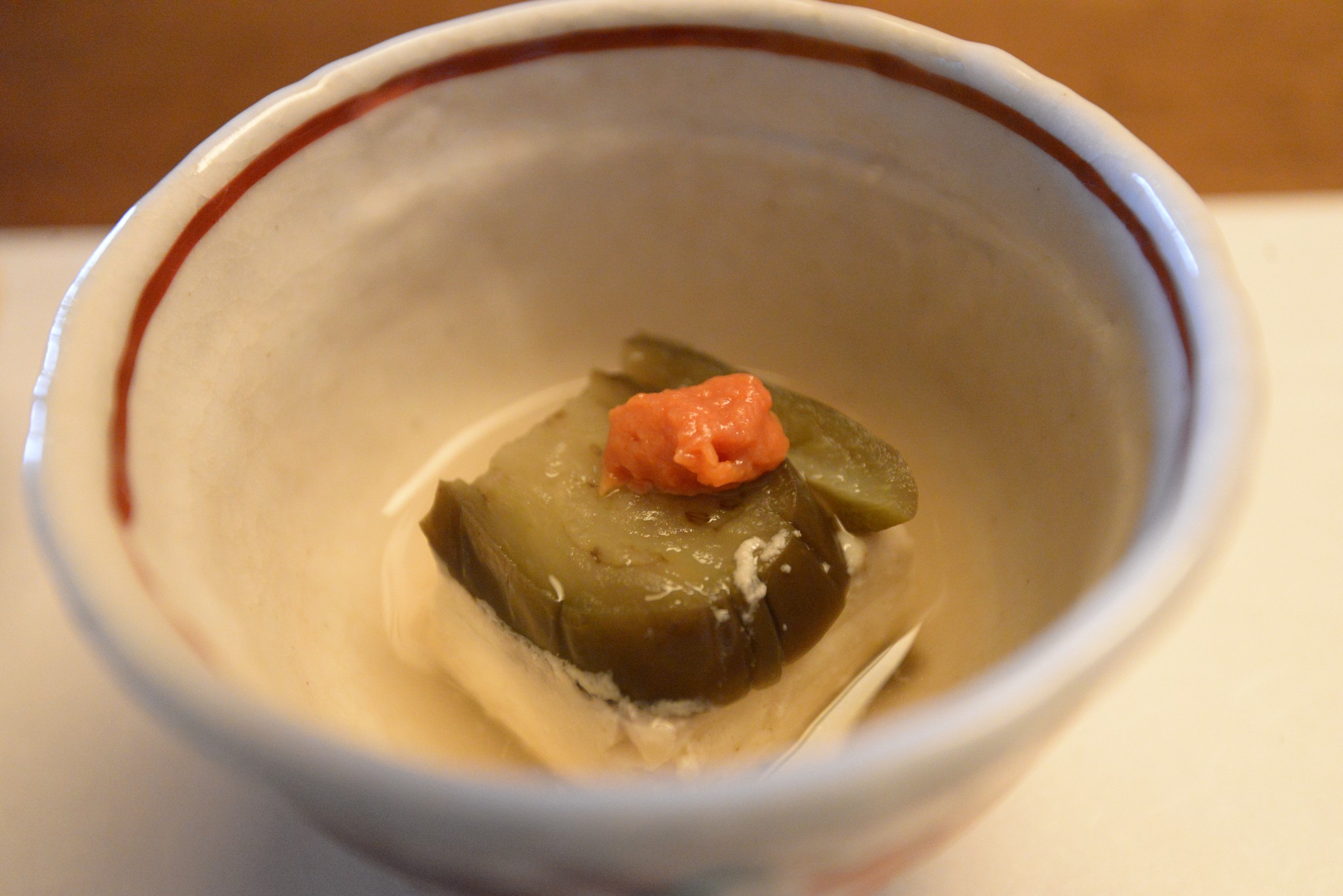 季節の蓋物:茄子與雞肉鬆的博多蒸 五彩勾欠 蕃茄味噌。博多蒸的特色,就是層層分明的食材薄片堆疊,整碗拿去蒸。
