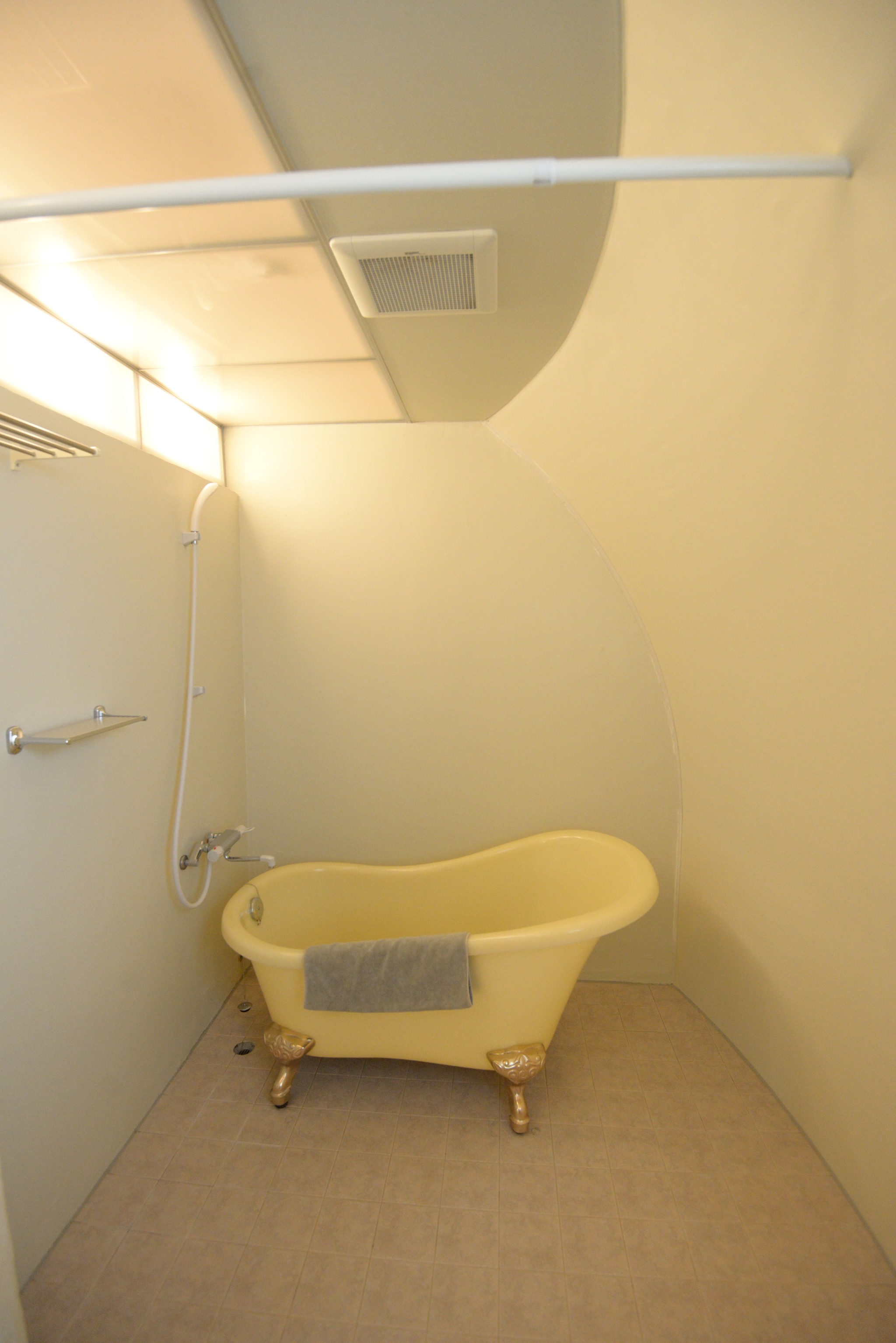 另一半是顯得有些簡陋的浴缸與淋浴,看這浴缸的比例就可知道其實衛浴空間其實頗大。