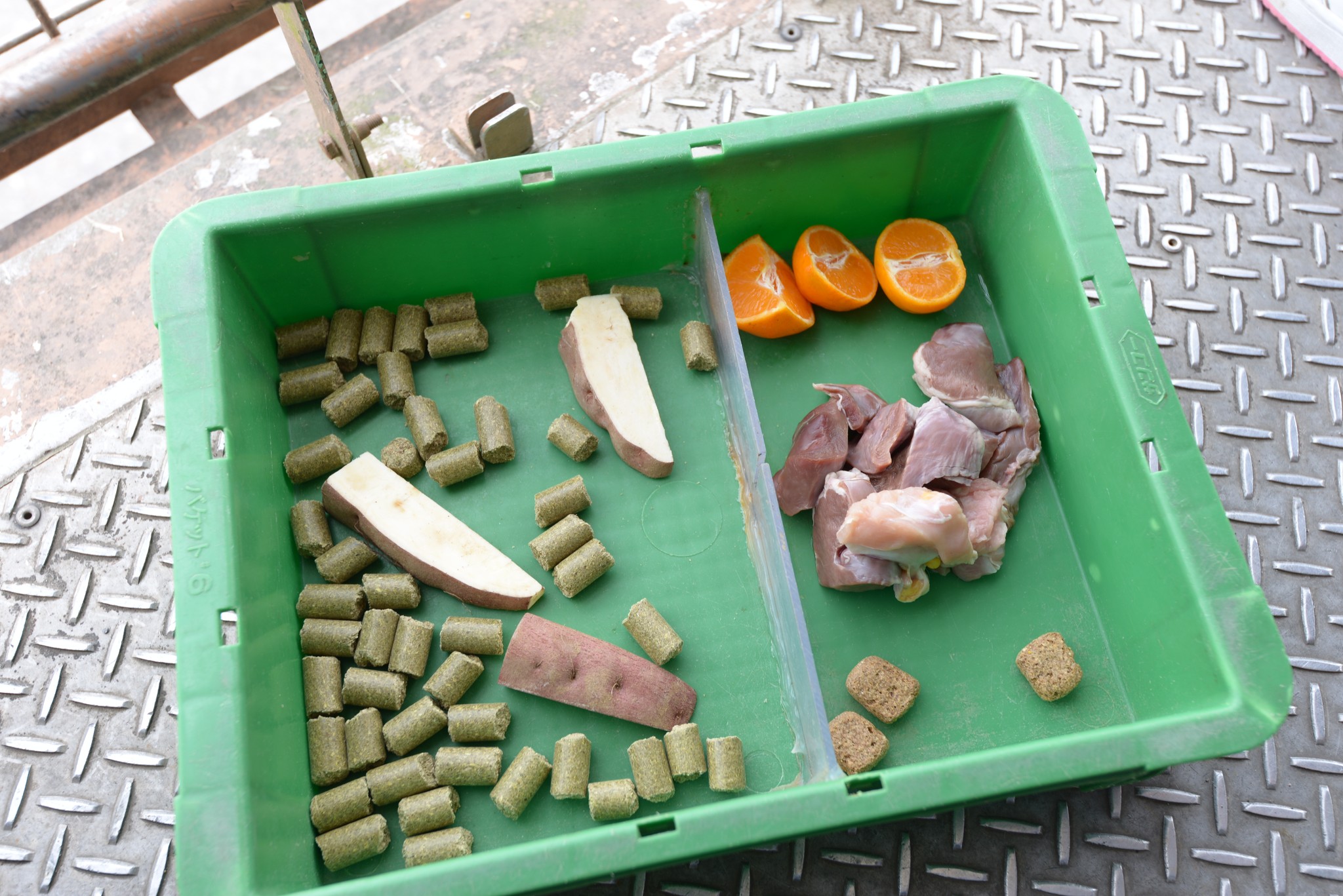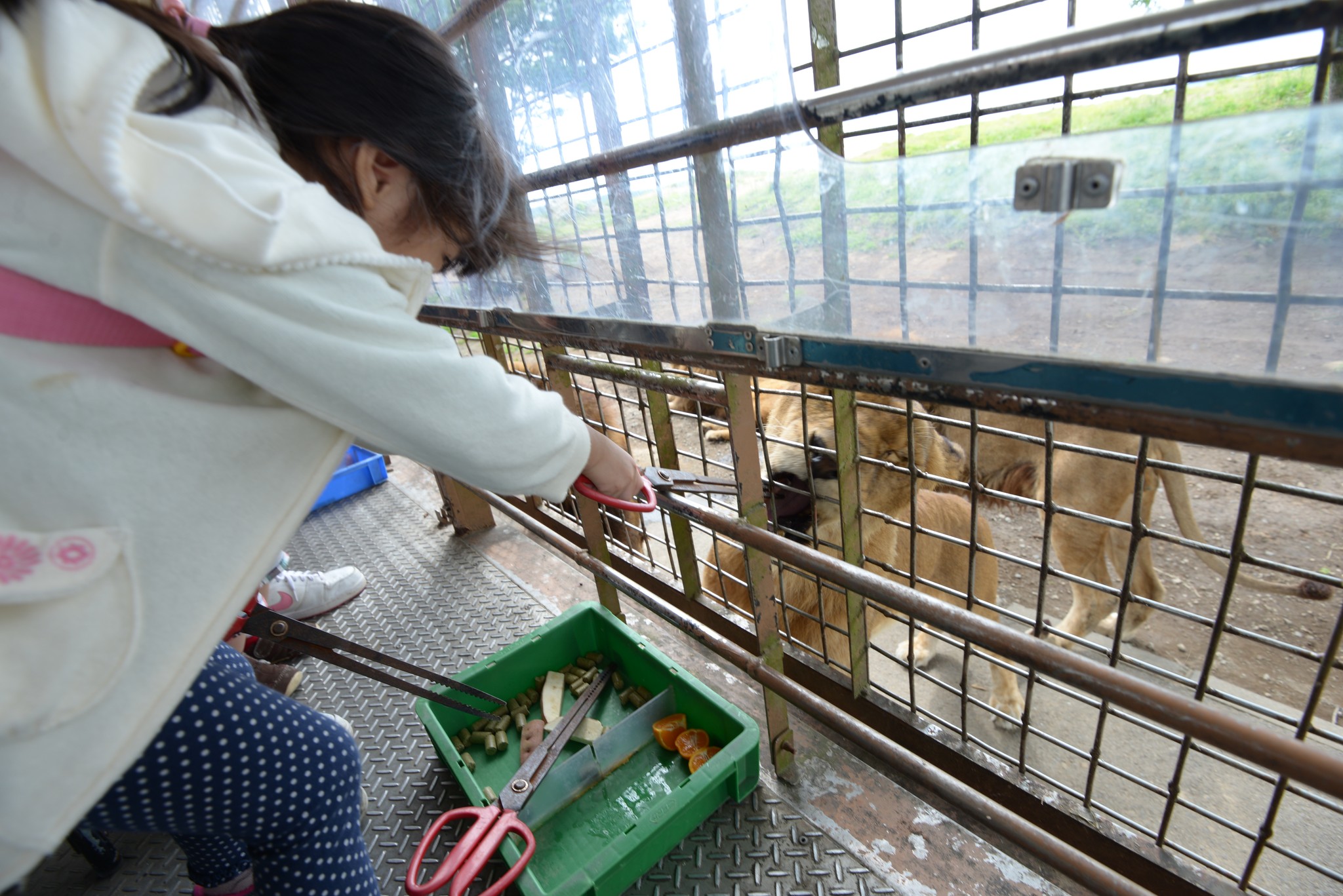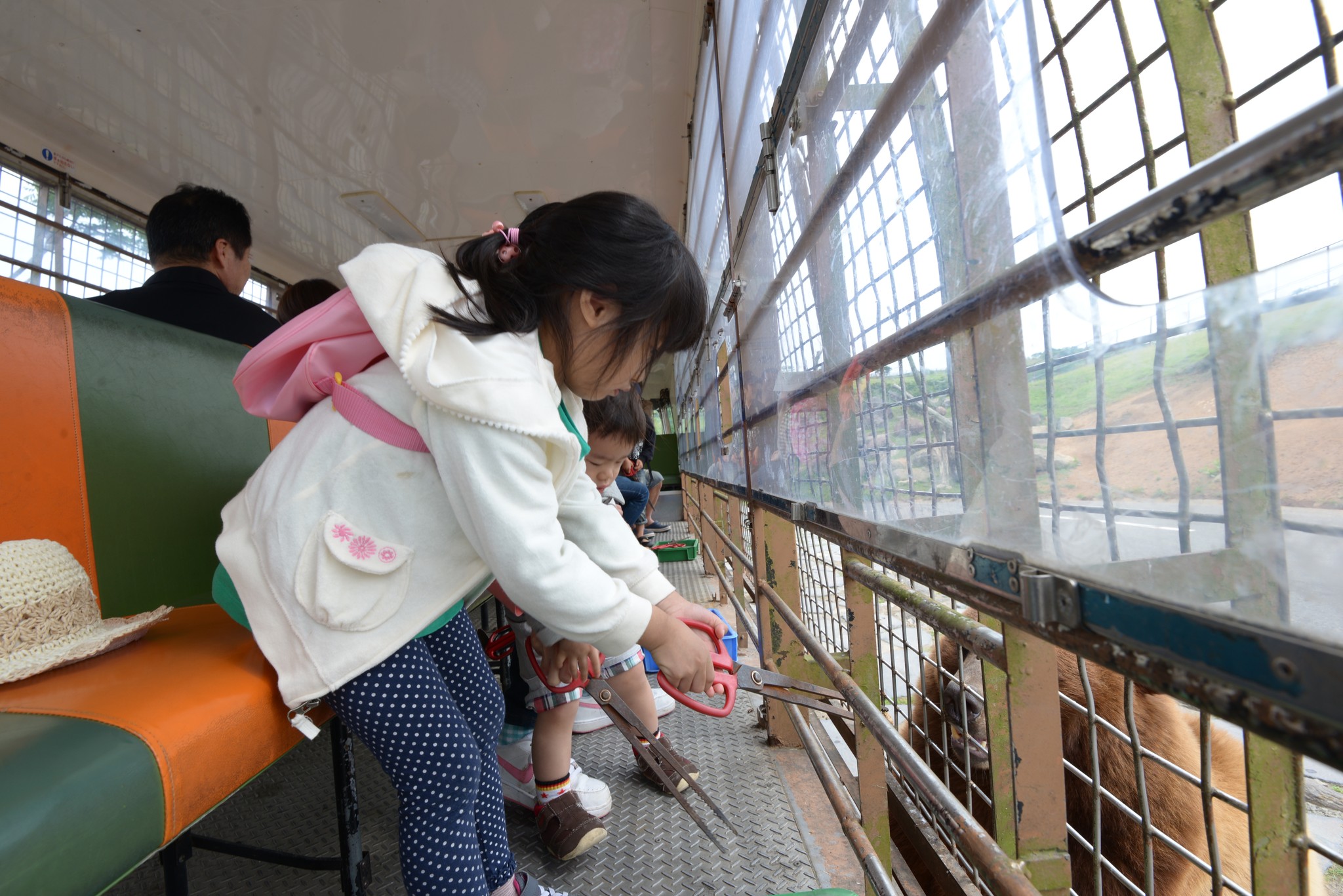 餵食的方式也很簡單,用座位底下剪刀狀的長鑷子夾取食物,伸出車外餵食。