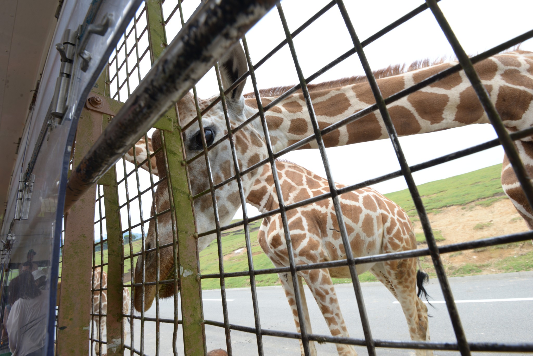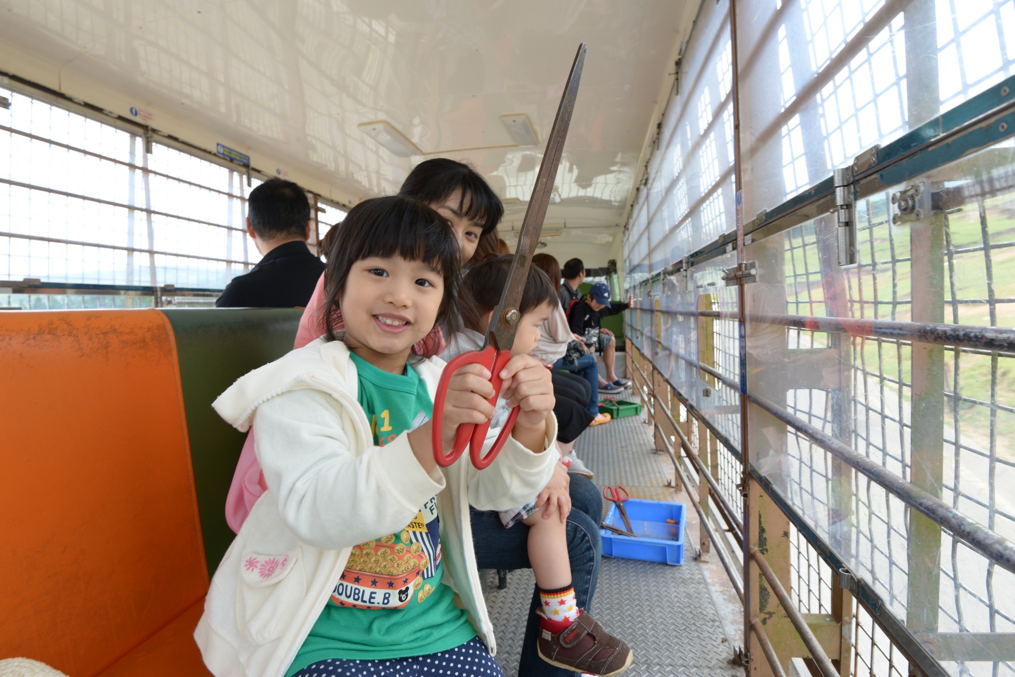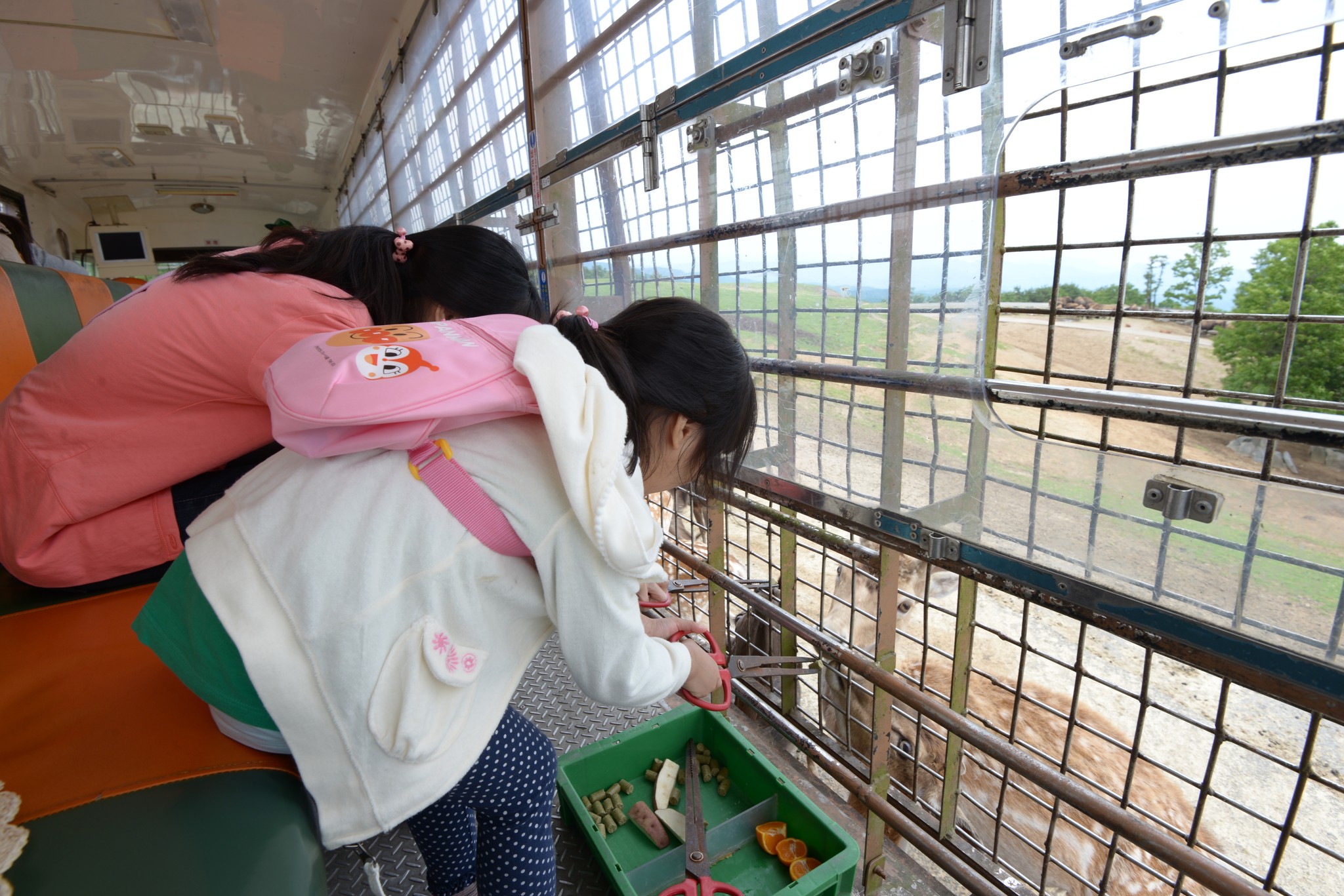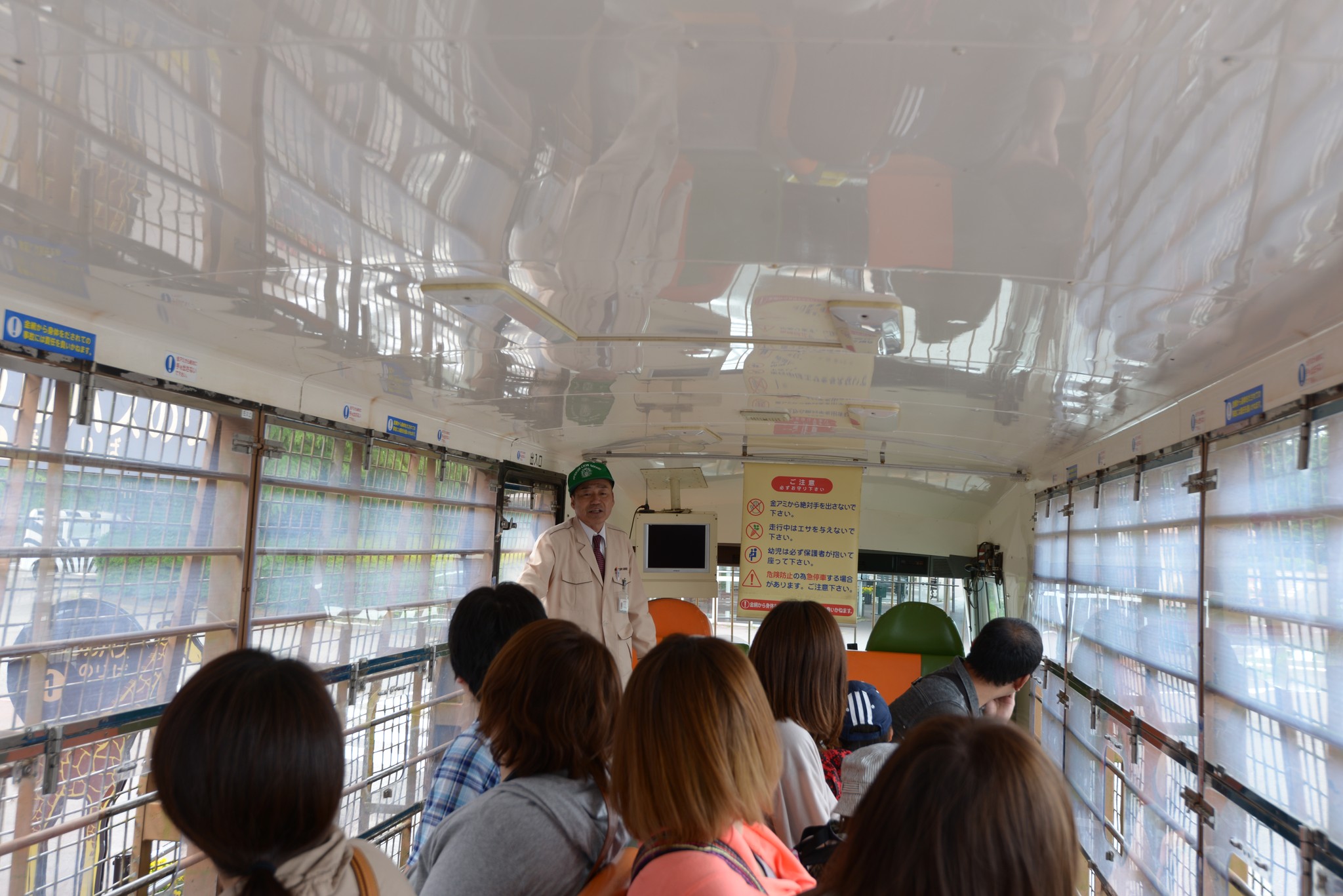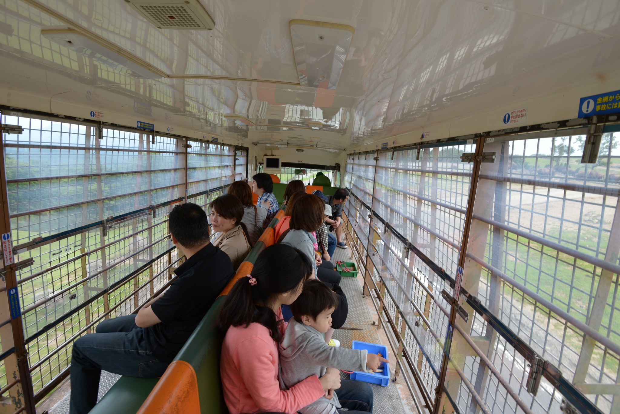 為了搶絕佳的座位,我們排第一順位上車,坐在車尾的好處是除了座位前方的開口可餵食外,車尾也有,因為動物從四面八方過來,在車尾也很方便拍照。我們這班車其實只坐八分滿,日本人很怕跟外國人講英文,所以也離我們遠遠的,我們的座位空間還算挺大挺舒適的!發車前整車都很興奮,吱吱喳喳吵不停。