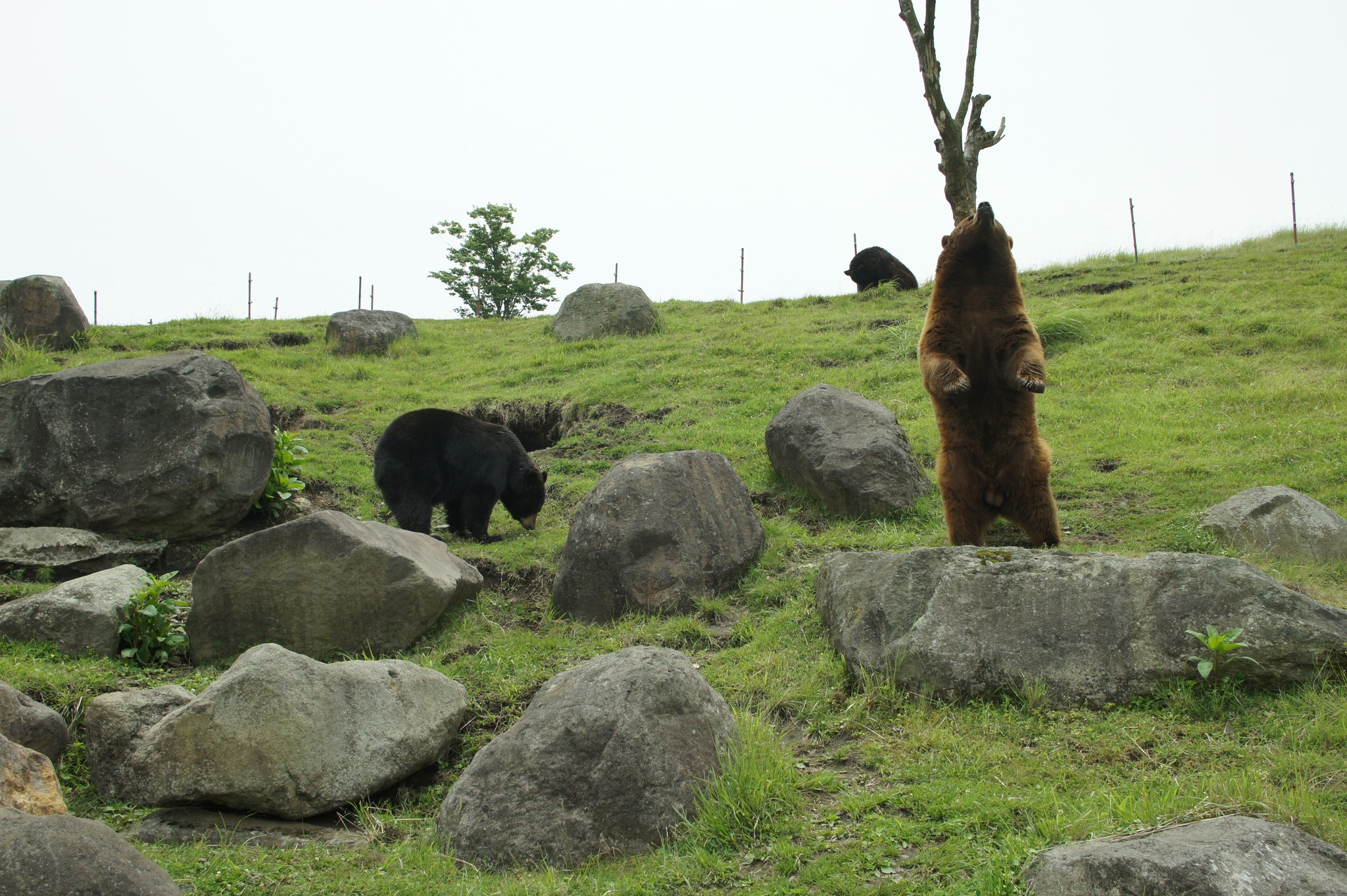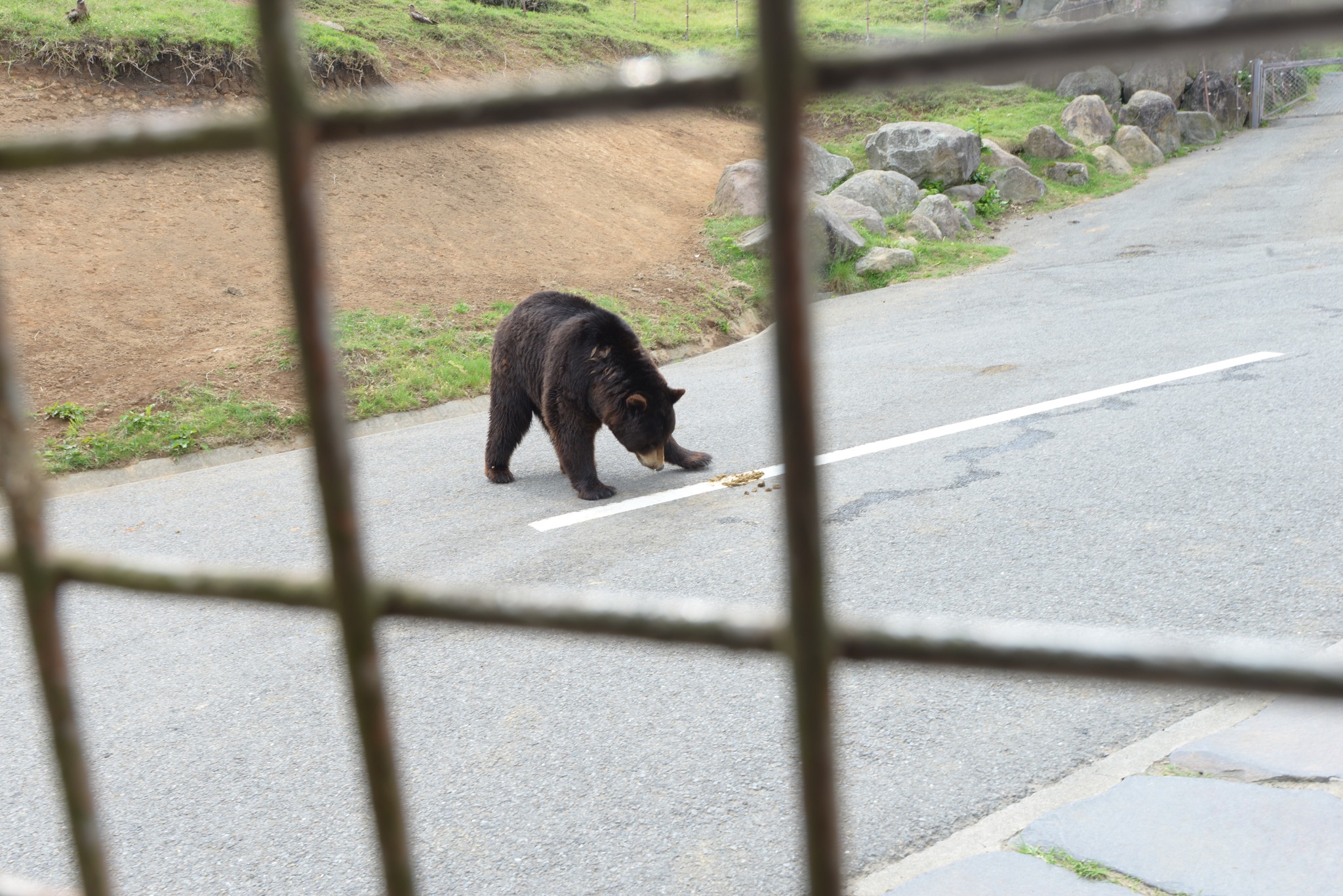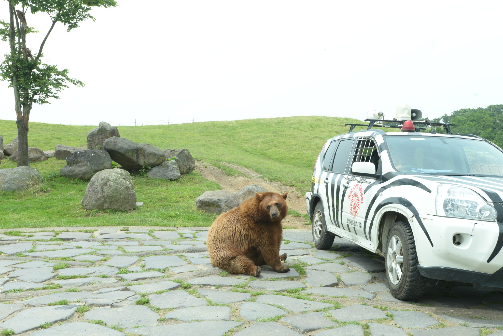 我們在熊區真的混很久,看這些熊在搞什麼花樣很有趣,因為佔地廣大,這些熊自由自在的,所以不會像一般動物園裡的熊一樣懶洋洋的。只要有熊試圖接近我們的車子,斑馬紋的警戒車就會衝過來,這些熊就會識趣地離開。這隻棕熊索性就直接在警戒車旁等食物,只要丟出肉片,它就會很開心的吃掉。所以 Jungle Bus 上餵的只是點心無誤。