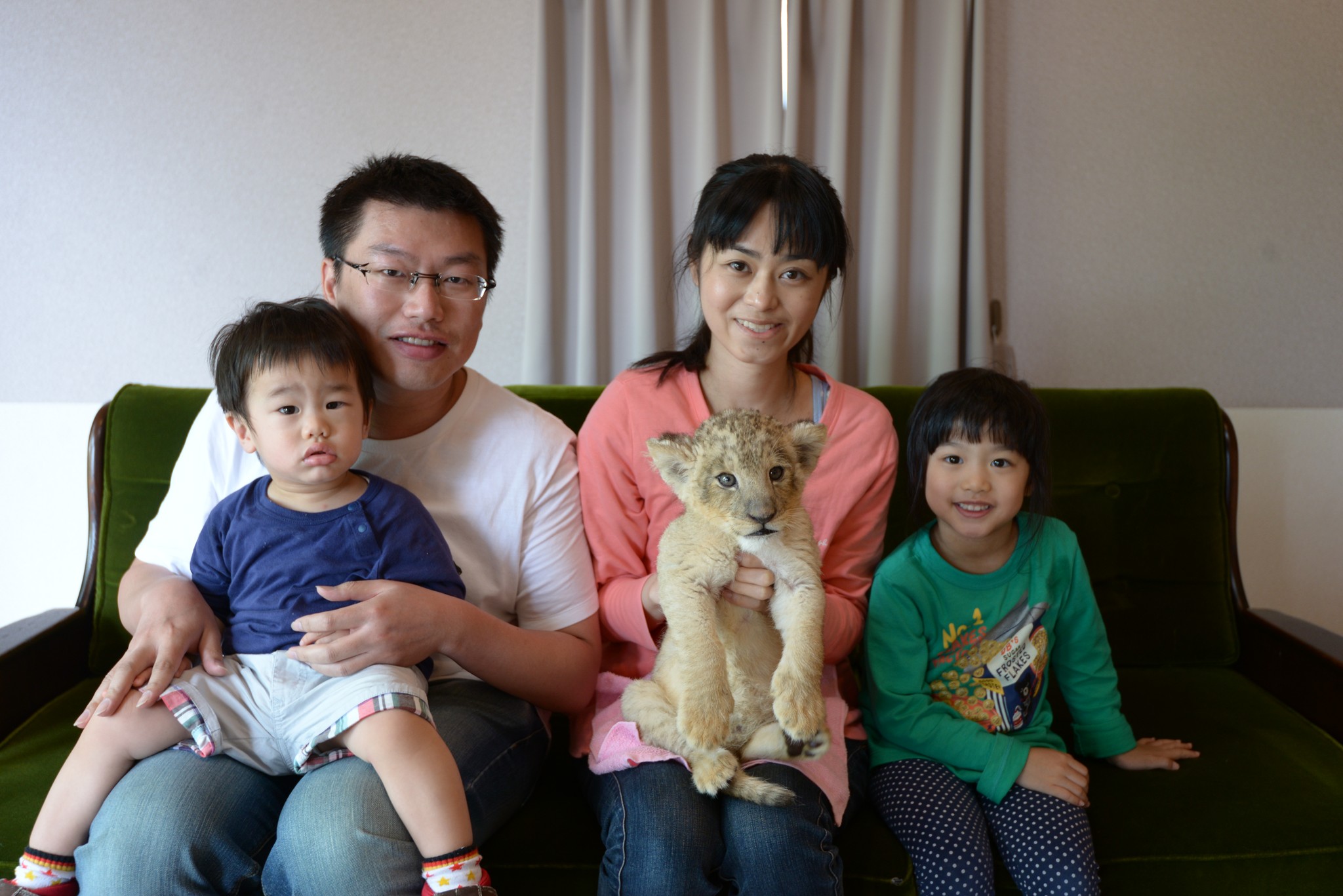 就像這個家庭這樣,有一個像是簡易攝影棚的沙發區,一位工作人員負責將小獅子抱給其中一位大人,另一位負責拍照。
