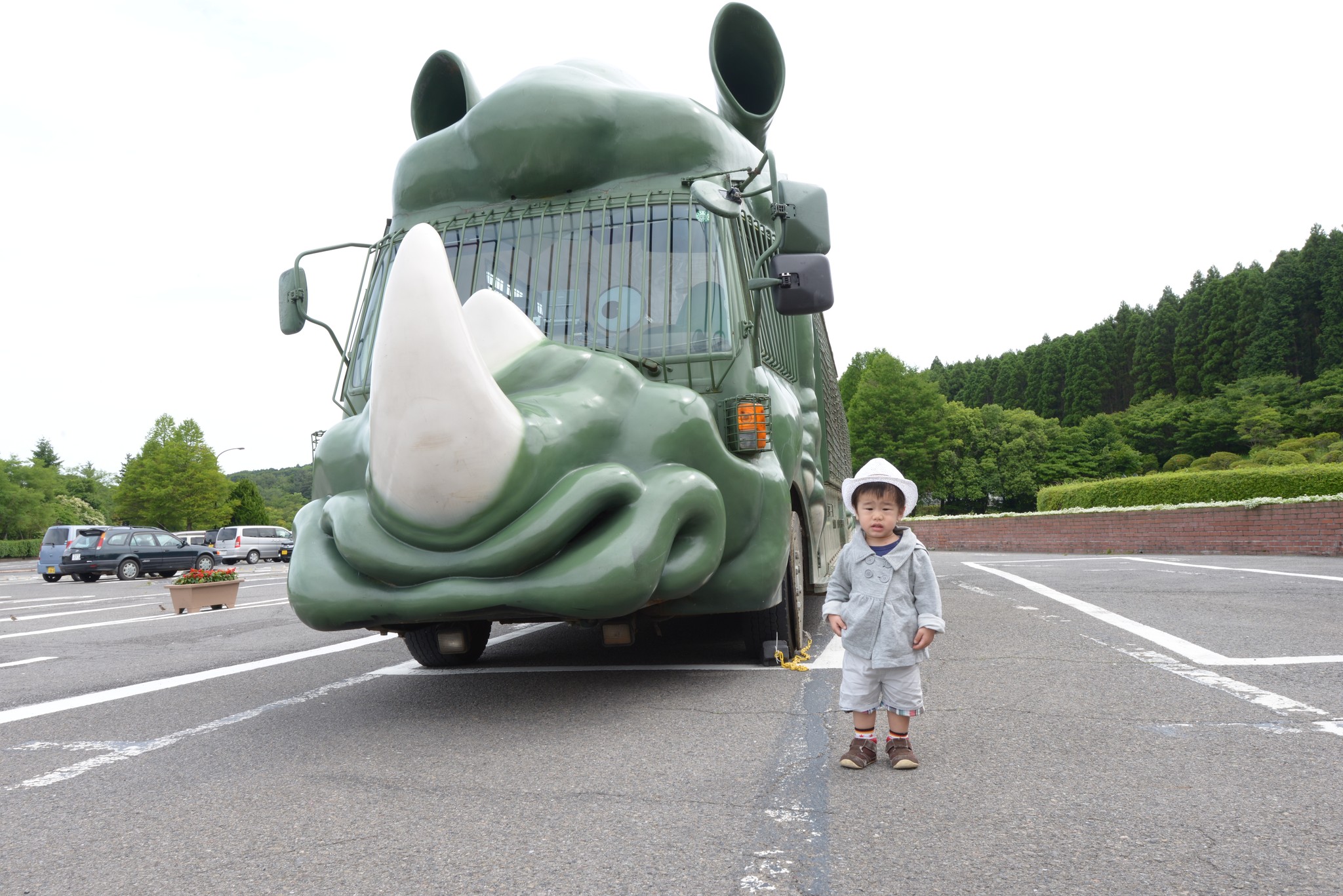原先是預約十一點的ジャングルバス,沒想到九點半就到了(有夠近),門口的售票小姐就直接幫我改十點的場次,我們接下來的行程也比較有餘裕。陳小弟身後就是大名鼎鼎的ジャングルバス,有多款動物造型,站在車子前面的陳小弟顯得非常的矮小。(噗!)