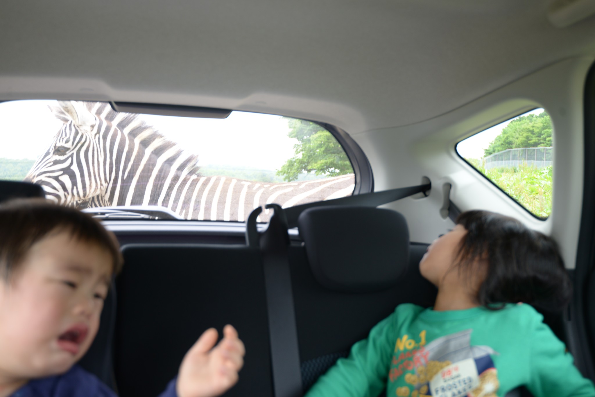 斑馬看到我們車子停下來就從遠方走來,陳小弟原本就有些哭鬧,看到斑馬將車圍住時有些驚嚇,斑馬可能是因為聽到哭聲而駐足一會兒。