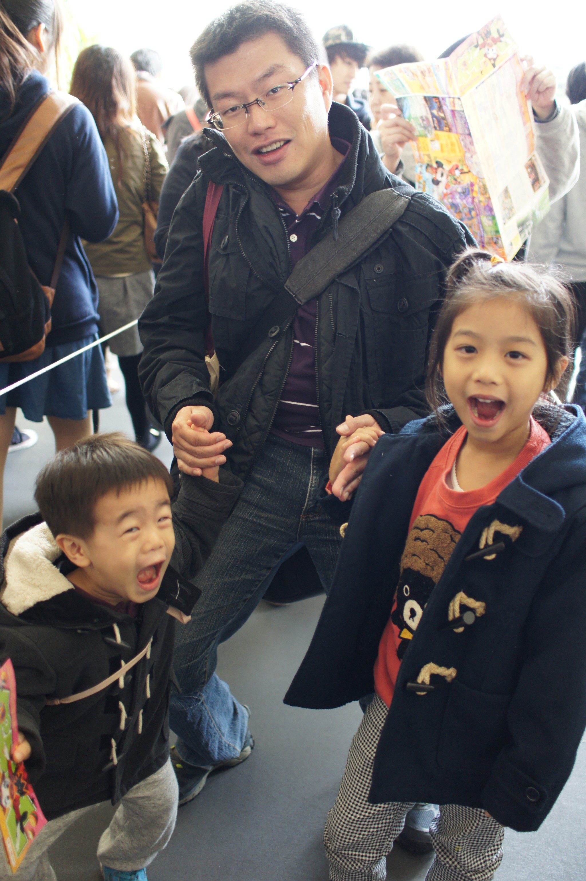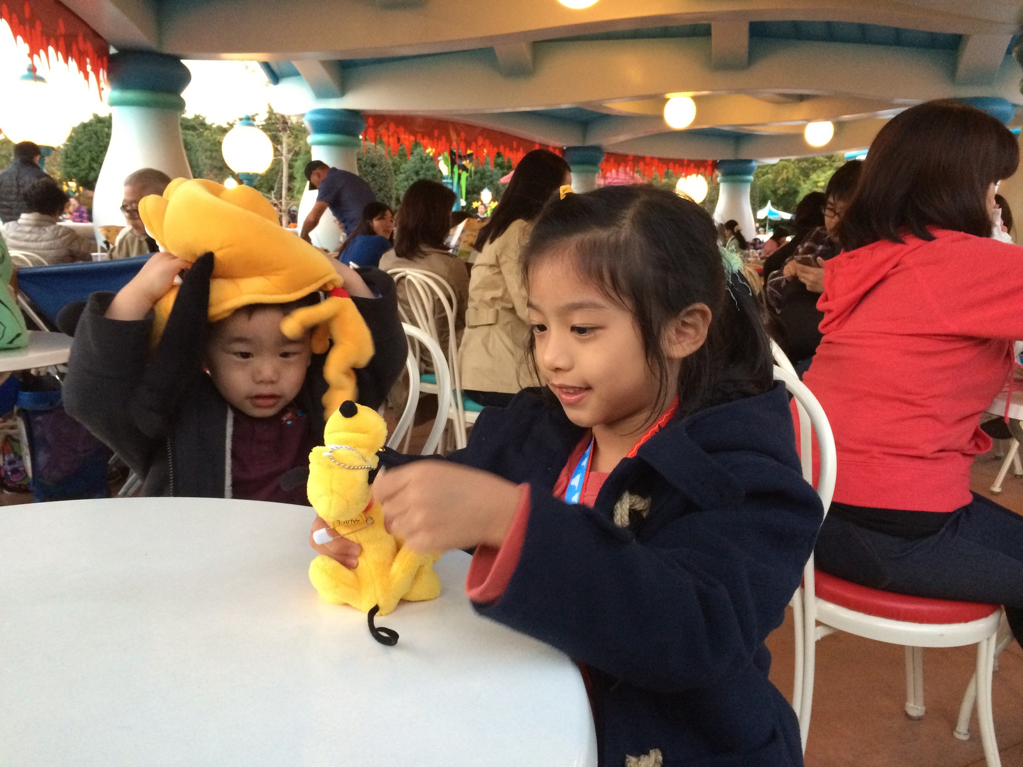 店內最佳的位子就屬這『中日友好子子孫孫』熊貓畫前,流籠就在這位子的上方進進出出,兩個小朋友看得超開心!