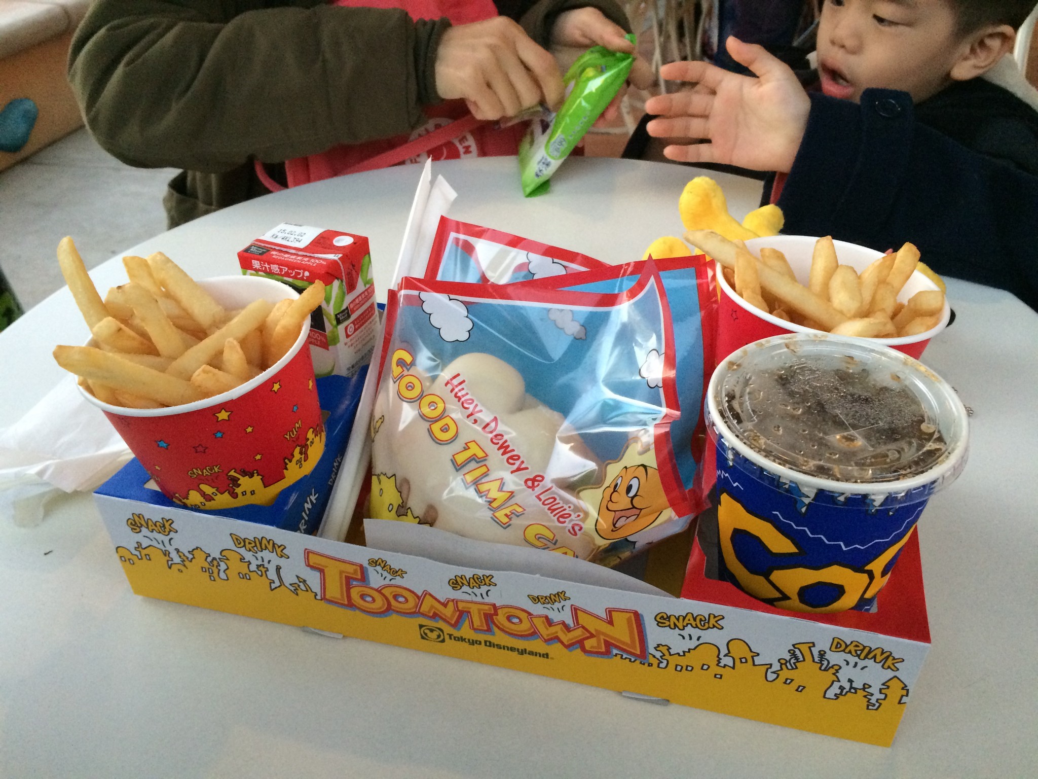 打工結束後,老闆請我們上榻榻米享用還沒吃完的糰子。雖然語言不太順暢,老闆還是很熱情的跟我們聊天,拿 iPad 跟我們拍照,最後還拿出相本給兩小孩塗鴉後準備將我們的照片給貼上並送了我們五張照片。我們就看他一人相當的忙碌,聽到對岸的木槌聲急忙的拉流籠與送糰子回去,沒流籠拉時就招呼兩個小朋友,還拿出他全部的零食全都送給了我們家小朋友,誇張到還幫兩小朋友準備塑膠袋讓他們裝零食。真懷疑我們只花 240 隻羊買兩隻糰子,帶走五張照片與兩袋零食後,老闆應該是虧錢的吧?!