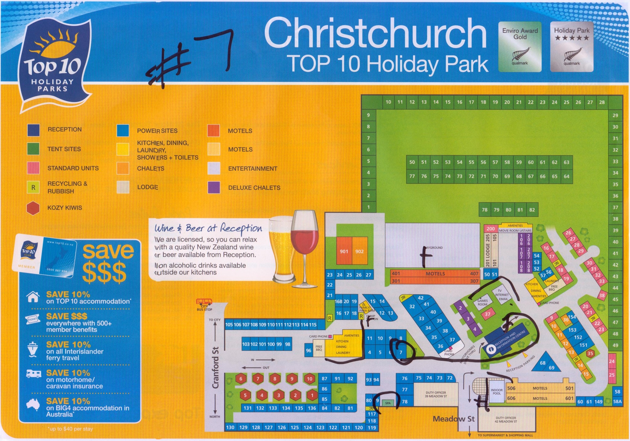 Christchurch Top10 可是五星級的 Holiday Park,預定時有註文要離廁所近的 power site,無奈這間 Holiday Park 太熱門了,給了一個不算近不算遠的 #7,廁所廚房是在地圖上最中央的黃色區域,我逛了一圈,最佳的 power site 是 #87, 91, 92,若有需要的朋友直接註文這幾個 power site。底下 Meadow St. 為入口,右手邊有一室內游泳池,可以帶泳衣去玩,地圖中央下方有一間 SPA,Top10 會員可免費使用,不過我們第一天兵荒馬亂的也沒去玩。