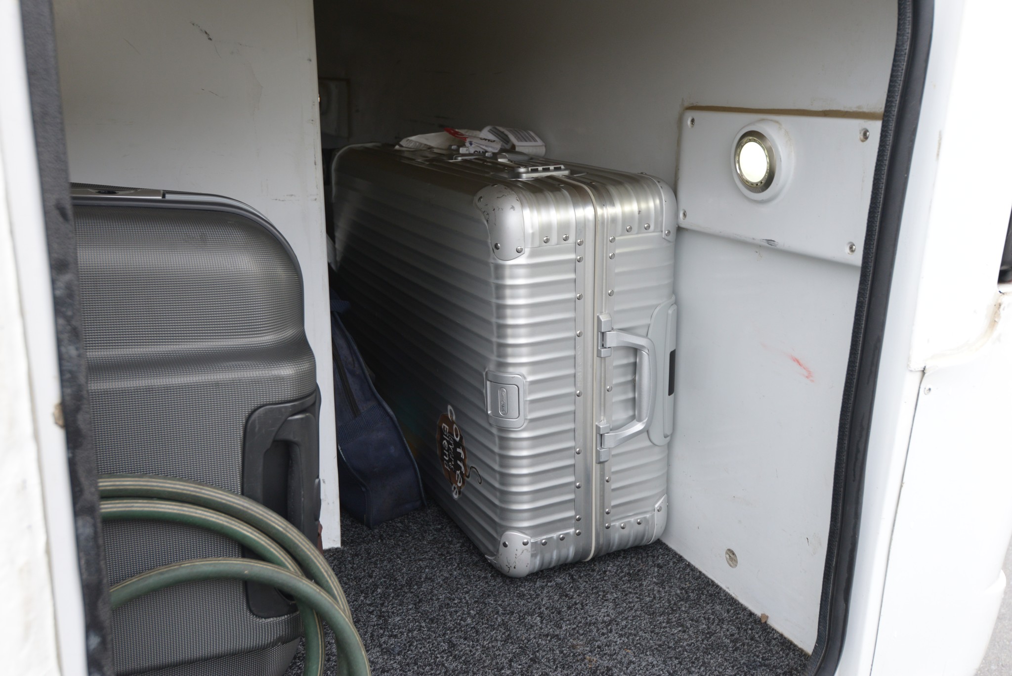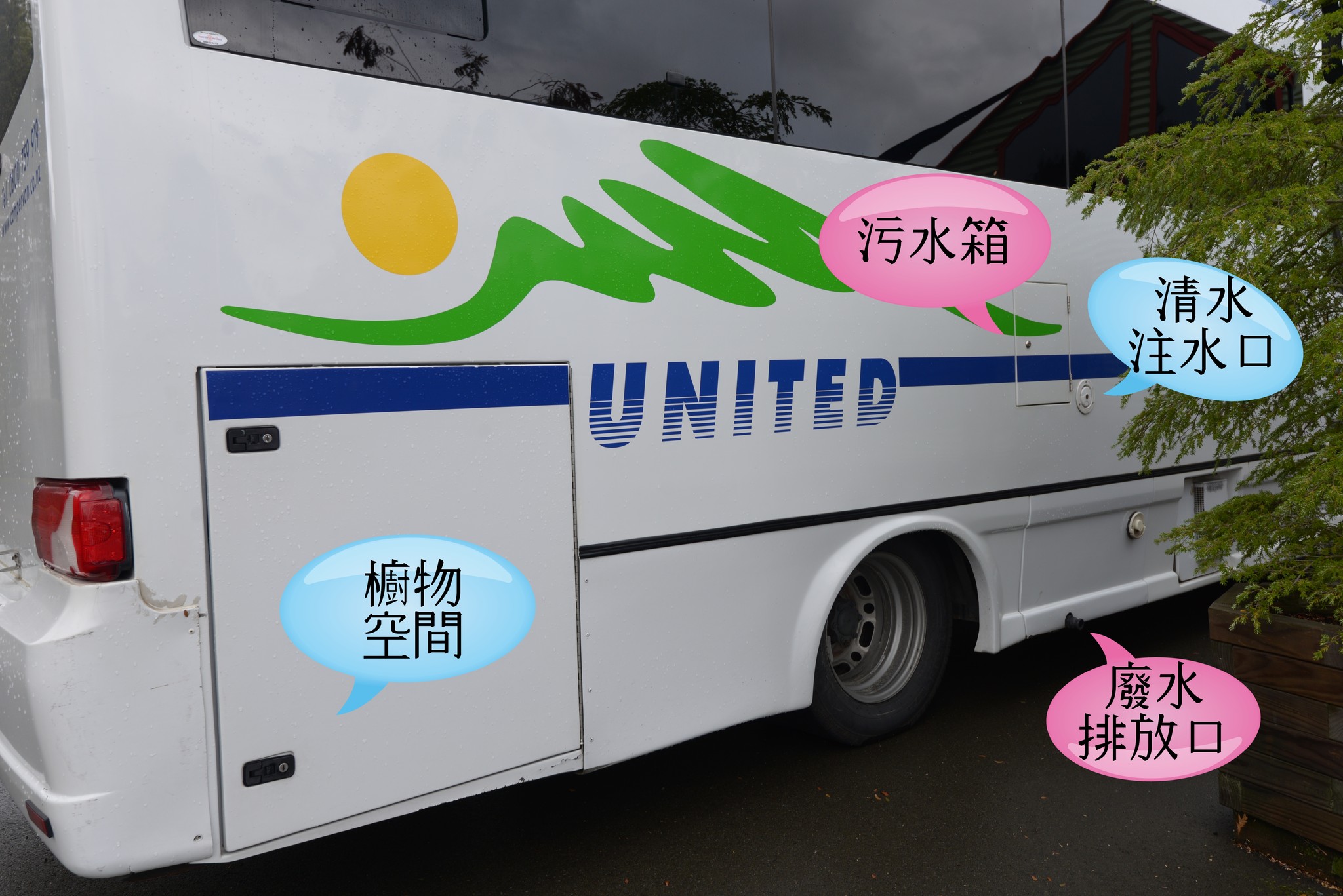 來看看外頭,UNITED 的很簡單,最右側有清水注水口與廢水排放口,要注意的是,清水與污水箱的容量一樣大,代表的是,將清水注滿前要先將廢水給排空,否則廢水很有機會在爆滿時溢出。有的 dump station 需要使用水管來排廢水,有的直接在地上做個排水溝槽讓你直接排廢水。再來是污水箱的部分,裡頭裝的是尿液糞便,需要投入生化藥劑才不會臭。而沖馬桶的水與清水箱是分開的,才不會相互污染,污水箱上方有一管狀物,拉出後往裡頭注水即可。左方有一櫥物空間,車子的左右兩側是相通的。