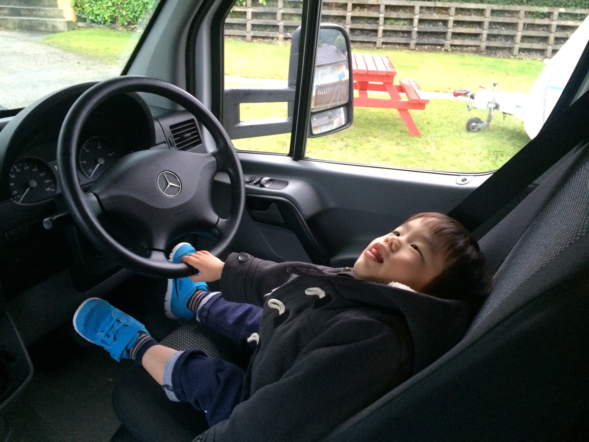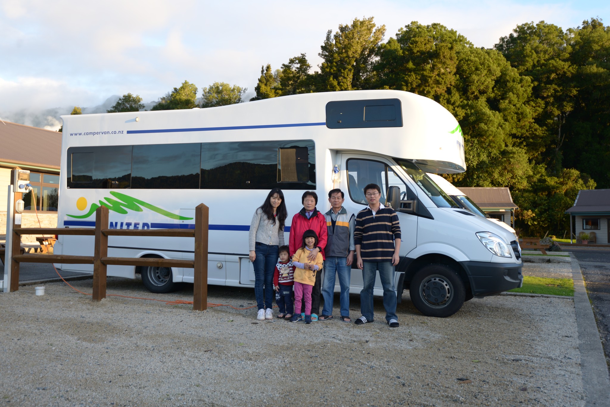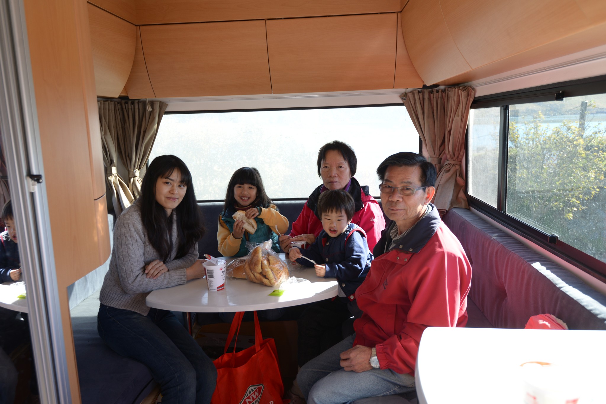 先看六人座的 campervan 有多大?這裡以我們全家來當比例尺就可得知,差不多是中型巴士的大小。開起來有很恐怖嗎?其實也還好,唯一要注意的是,裝滿水箱水後的車子非常之重,若行駛在郊區的百公里限速路段,一定要有安全距離,因為從你開始踩剎車到完全停止真的要滑很長的距離,若車距沒保持好,真的會很危險,尤其西岸很多單線道的橋樑都是躲在轉彎後,小轎車轉彎後會突然剎車,容易造成追撞。