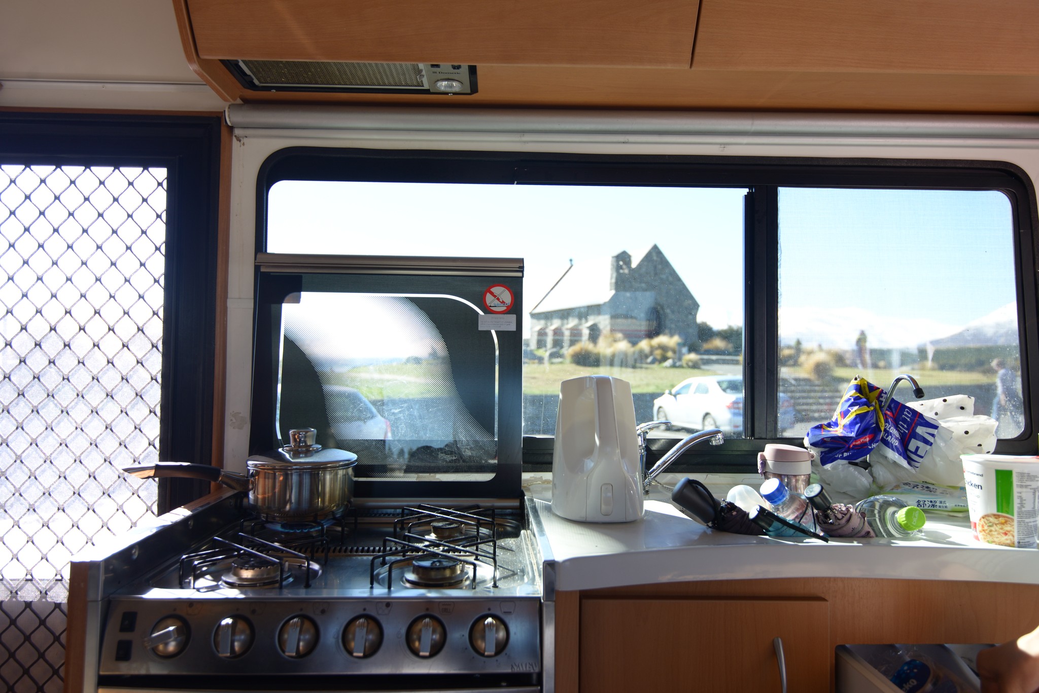 在牧羊人教堂前煮午餐,還有什麼風景比這更威的?在紐西蘭旅行,開露營車不用趕著用餐時間去餐廳跟人家大排長龍,那裡風景好就停那,嗑 pizza 嗑麵包嗑泡麵滋味更加的美味!當然有時間也可煎片牛排喝個紅酒佐無敵風景,人生最幸福的事不就是如此!