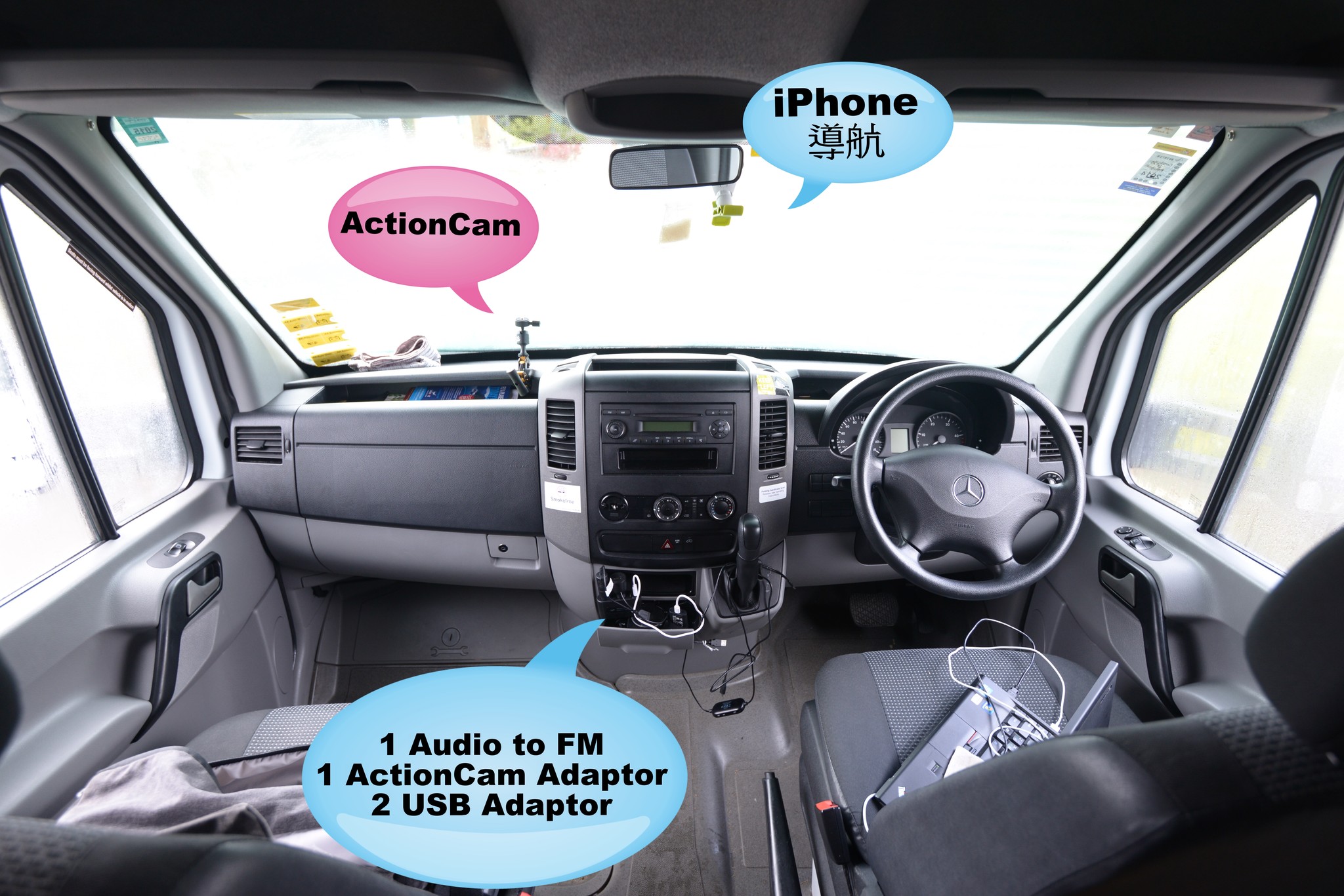 進到裡頭來看駕駛艙吧!駕駛艙空間很大,與副駕駛座中間還有一個小走道。我們的 3C 幾絲頭很多,從台灣帶了一組一對二點菸分接器外掛兩 USB 充電頭,一次可對四個裝置。我的 iPhone 裝 Tomtom 導航,Sony ActionCam 夾在副駕駛座拍沿途美景(外國人很好奇,行車記錄器大概也算是台灣之光了吧!)。音樂部分交給 belkin TuneCast® Auto Universal Hands-Free AUX 來對應 FM 頻道。