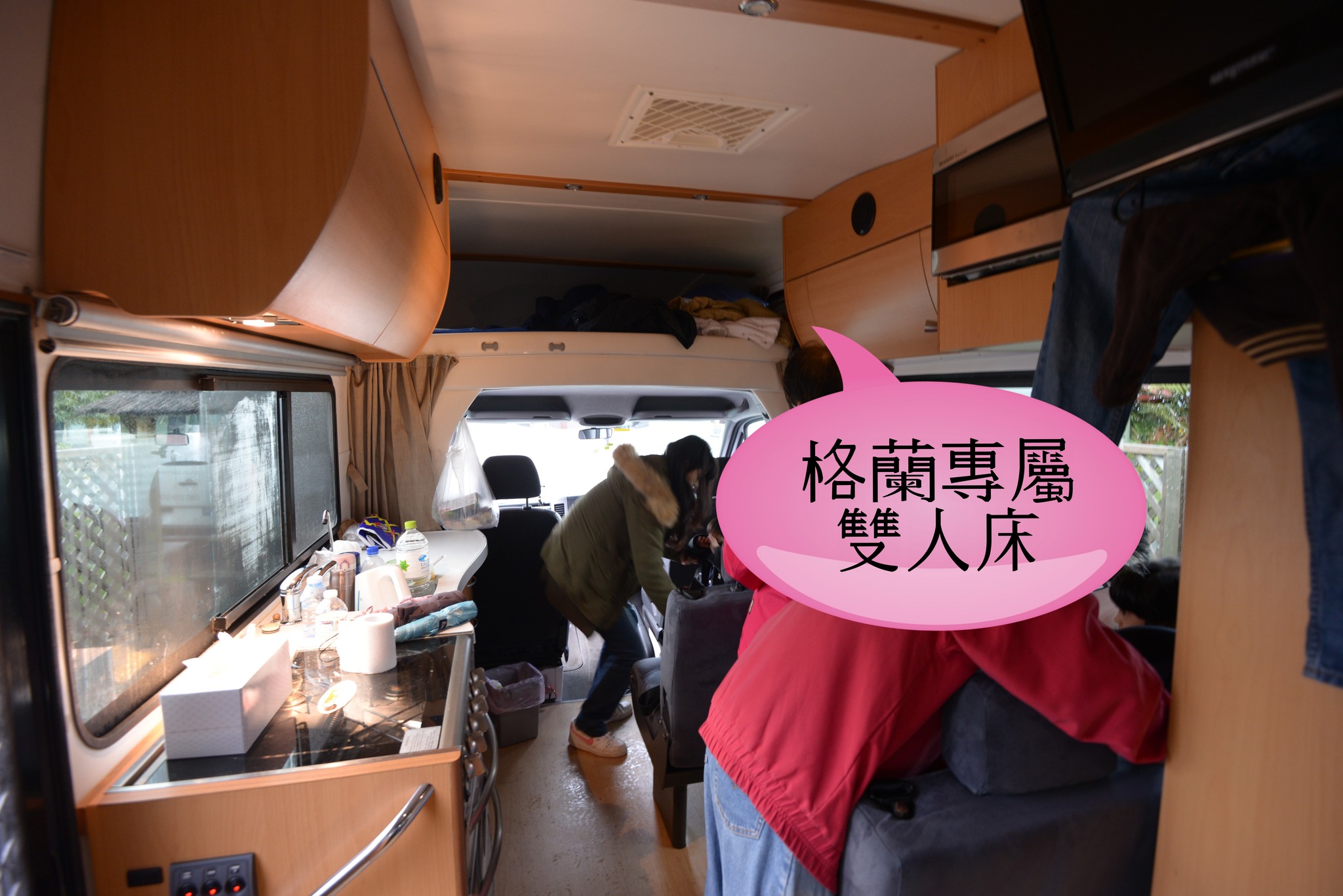 最後方的床算是最大的,原先是一『ㄇ』字型沙發與桌子,第一天變身成床後就懶得動它了,貓大王與兩位小朋友睡這還很餘裕。右下角粉紅色包包下方有一小型電冰箱,放兩三天的食材不成問題,冷凍庫也很給力,肉品凍在那一整個硬邦邦!冰箱上方平台有兩個插座,要插外部電源才會有電,可用車上附的快煮壺燒開水,電腦等充電器材也都是在此使用。