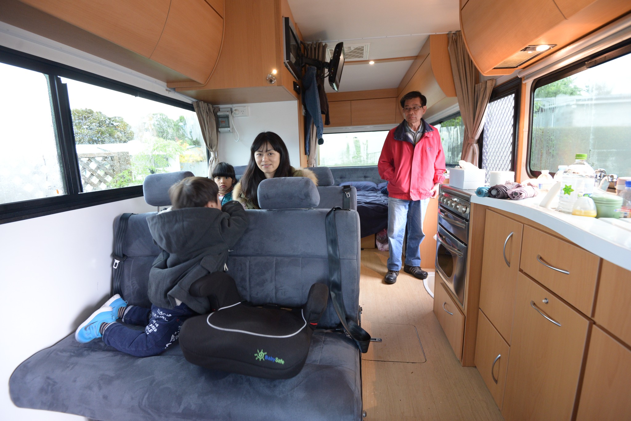 由駕駛艙往後看,左側是兩排兩人的座位,夜間則變身為一張雙人床。紐西蘭的法律規定車子在行駛的途中是不能躺在床上睡覺的,所以我們都乖乖的把它變回座位將兒童安全座椅給繫上!座椅後方就是廁所兼浴室,使用前將抽水幫浦以及瓦斯(若要洗熱水)打開即可使用。座位下方有暖(冷)氣出風口,暖氣也是燒瓦斯的,打開之後整晚都暖呼呼的!座位上方有一微波爐與電視音響組,好不容易來到世界地理教室,我們才不願意開電視來看勒!
