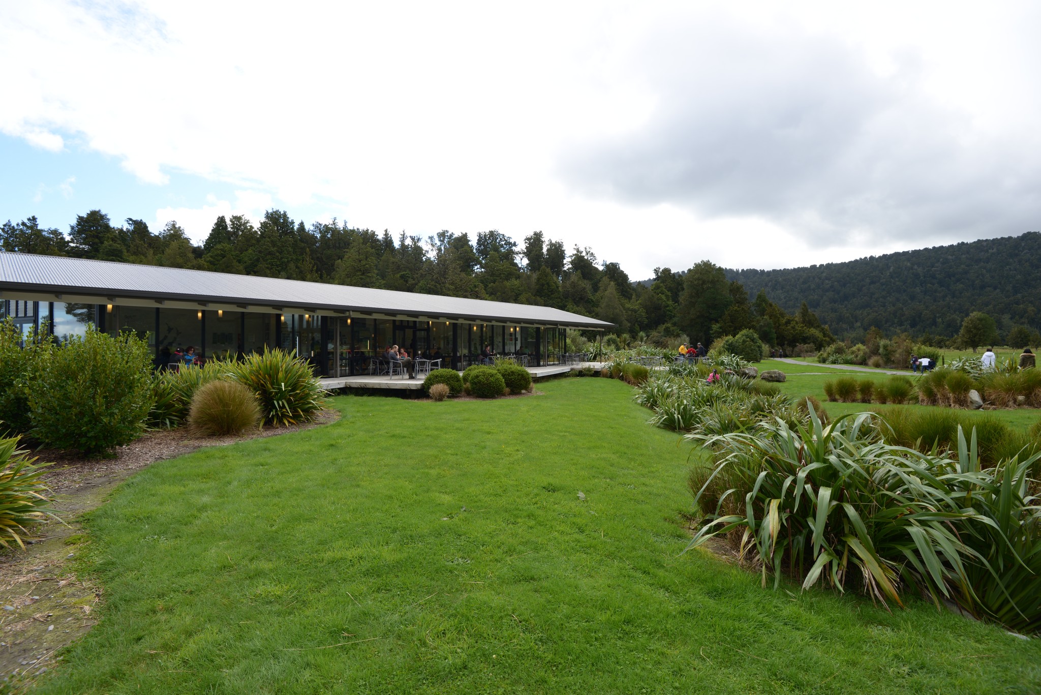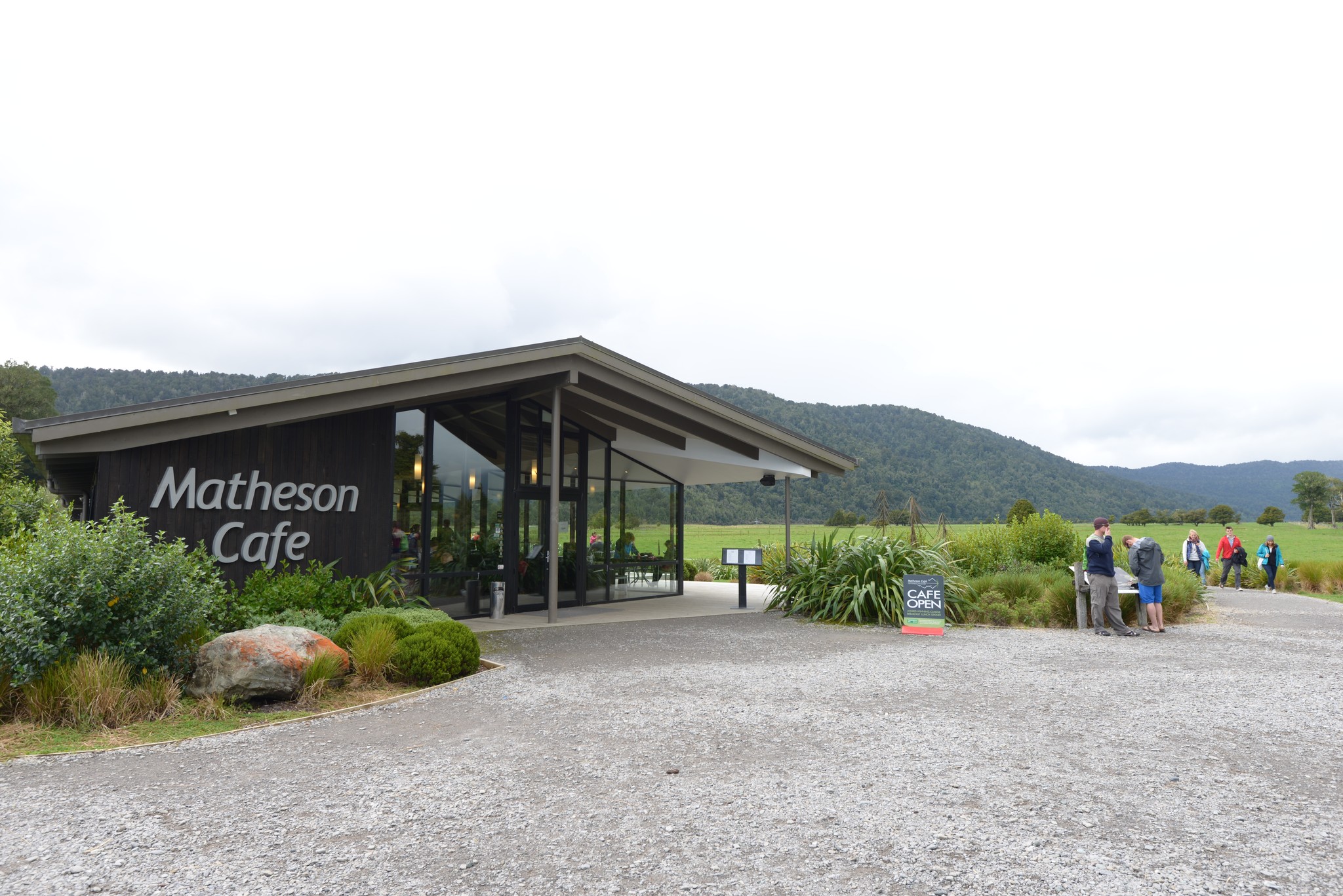 往 Matheson Cafe 走去,即是 Lake Matheson 環湖步道的入口。Matheson Cafe 有著大片的落地玻璃,在此發呆喝咖啡應該是不錯的享受。我們已在 hobnail.cafe 喝過嘍,所以直接去走步道。