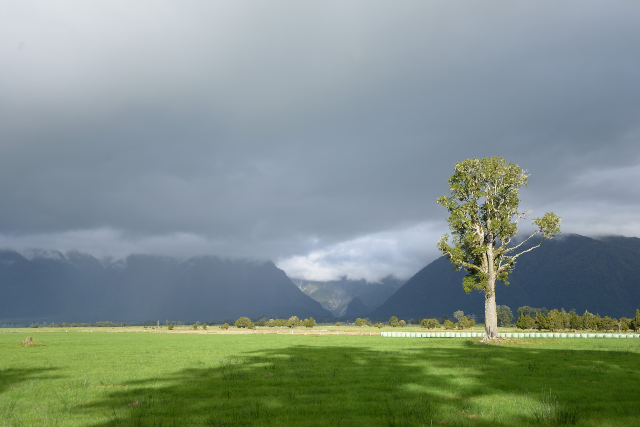 拋開無法登機的壞心情,我們轉進 Fox Glacier 的主要街道,要去 Lake Matheson 走走。才剛轉進街道沒多久,大太陽?回頭看看 highway 6,滂沱大雨,幾百公尺的差距有著天壤地別的天氣,這也太絕了吧!