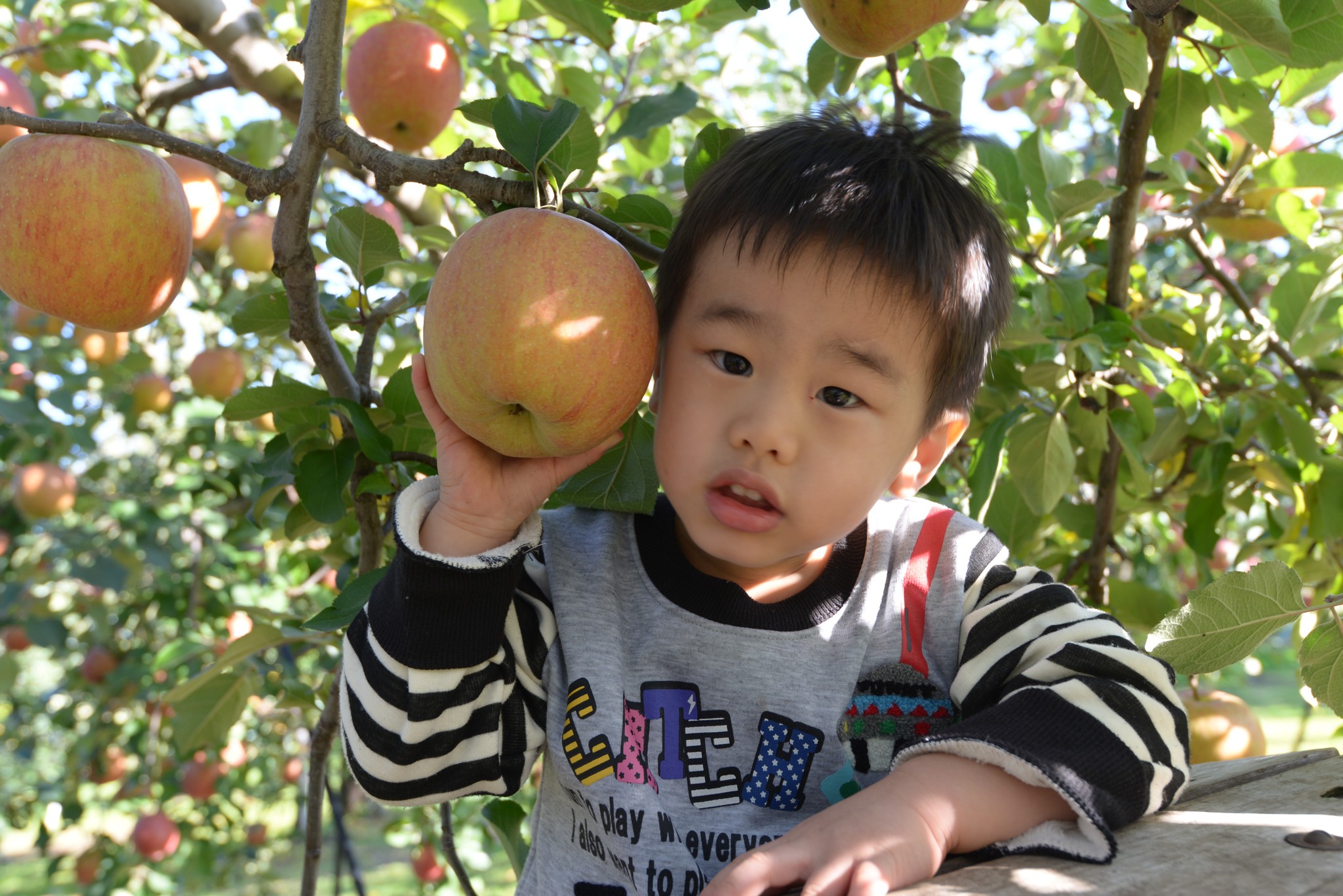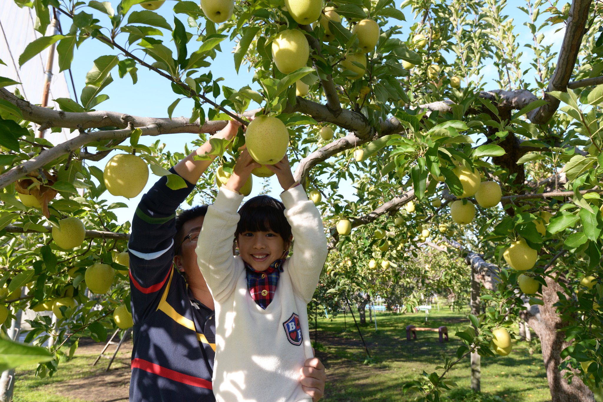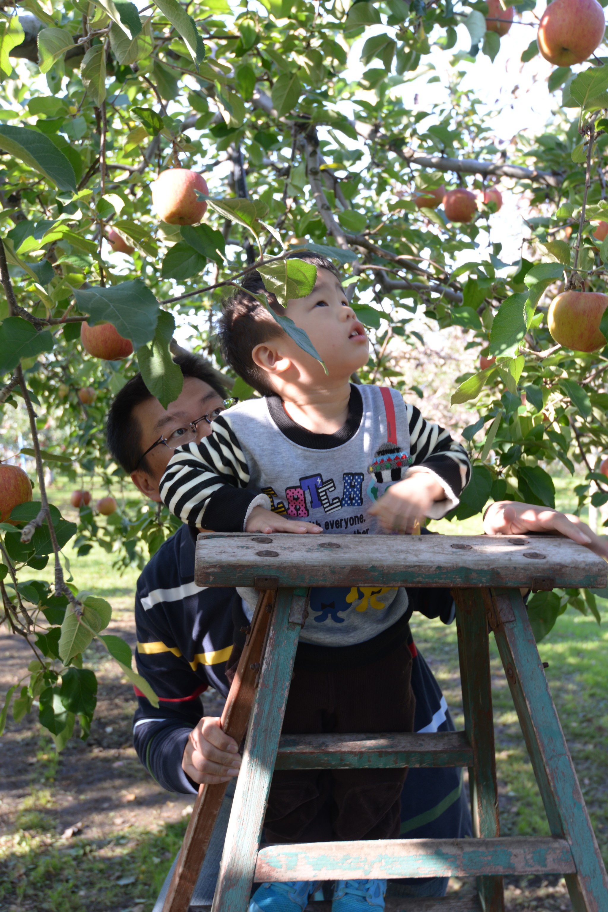 當時期好吃的還有王林蘋果(Genki的表情很僵,因為他有點害怕站在梯子上)