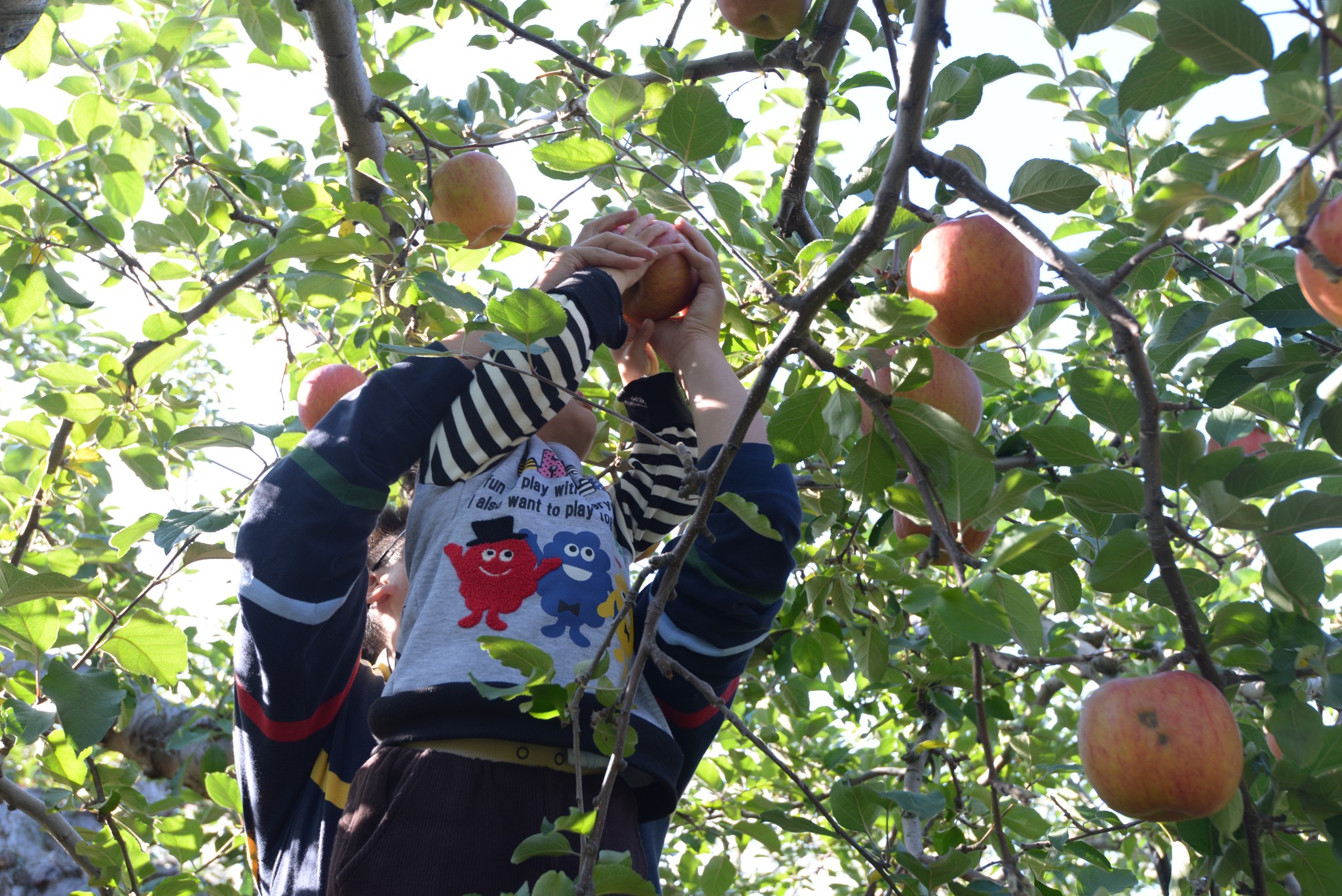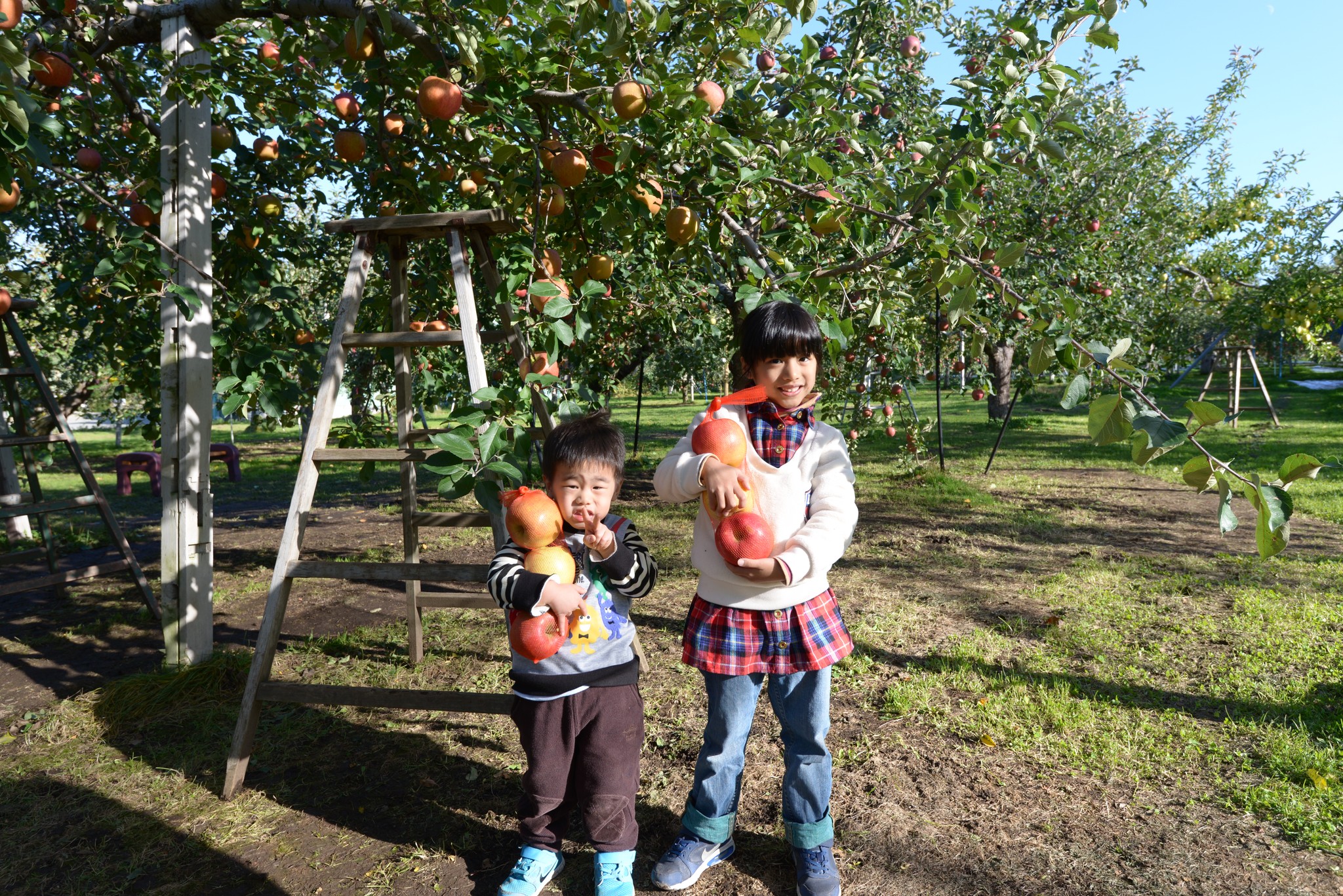 這家果園的採蘋果體驗是採3個300円,因為我們只剩下最後兩天在日本囉,所以就意思意思讓姐弟體驗一下自採蘋果的樂趣,採兩袋就好囉