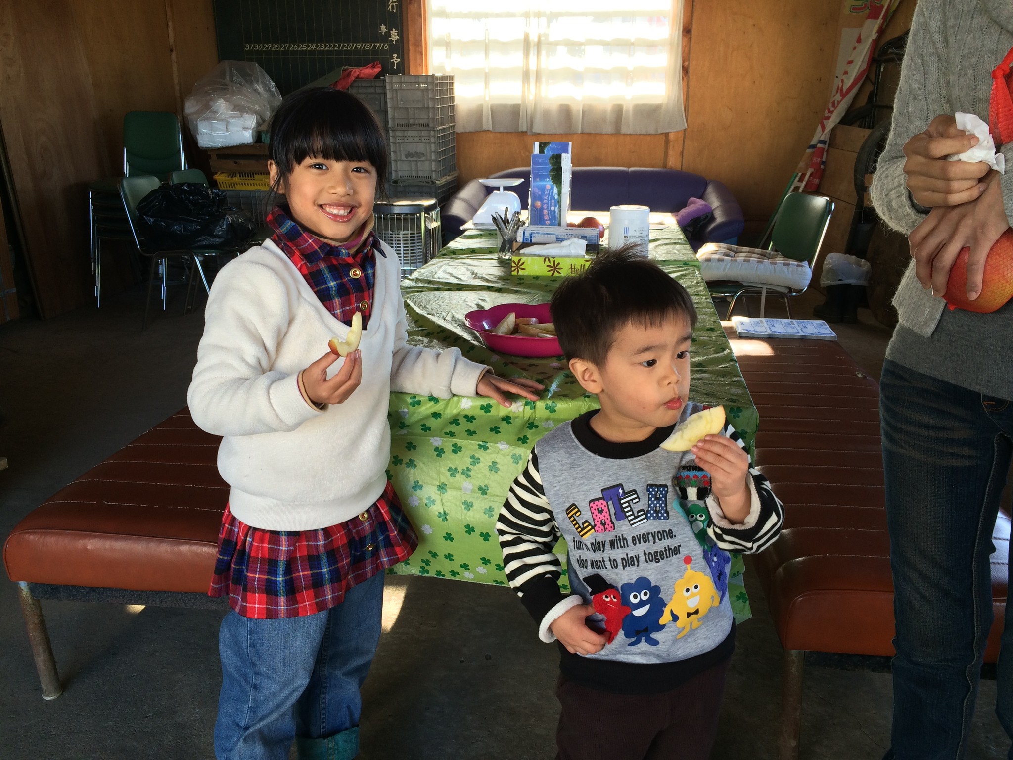 老闆娘請姐弟倆吃蘋果,都是當場現削的,中間還結蜜耶,這兩個小孩簡直吃到欲罷不能