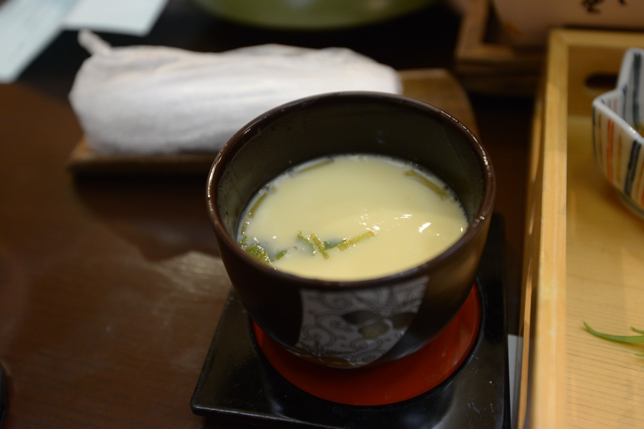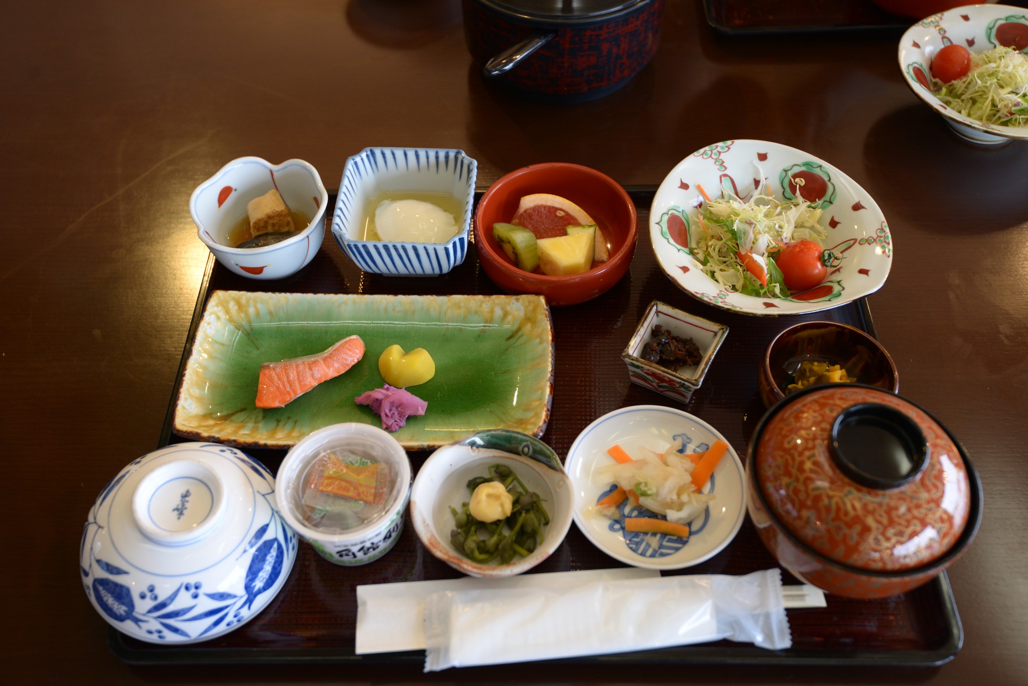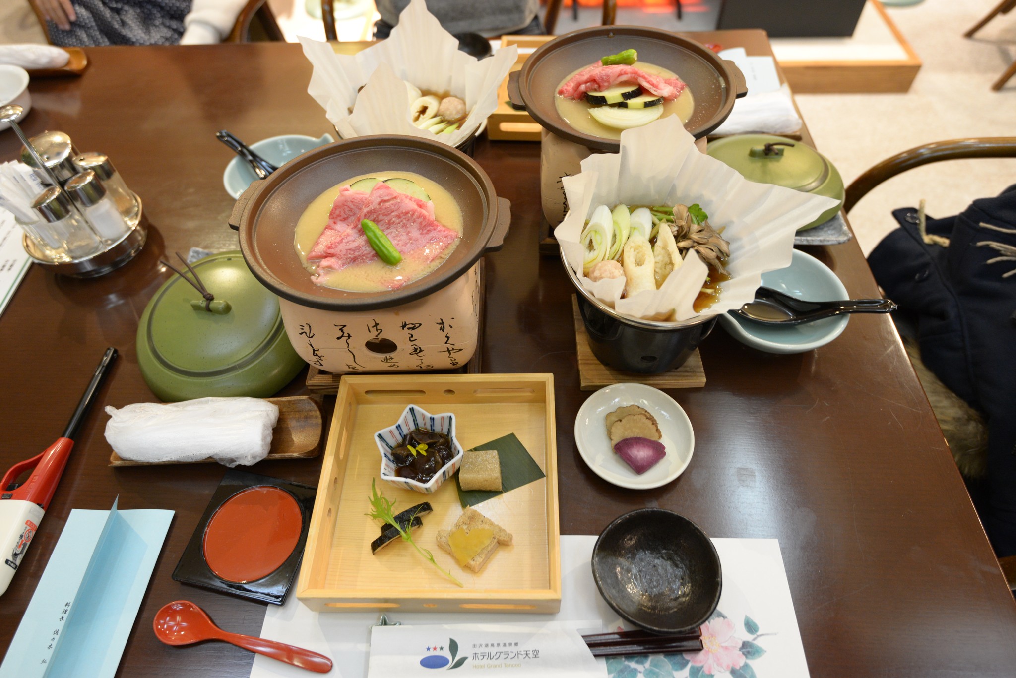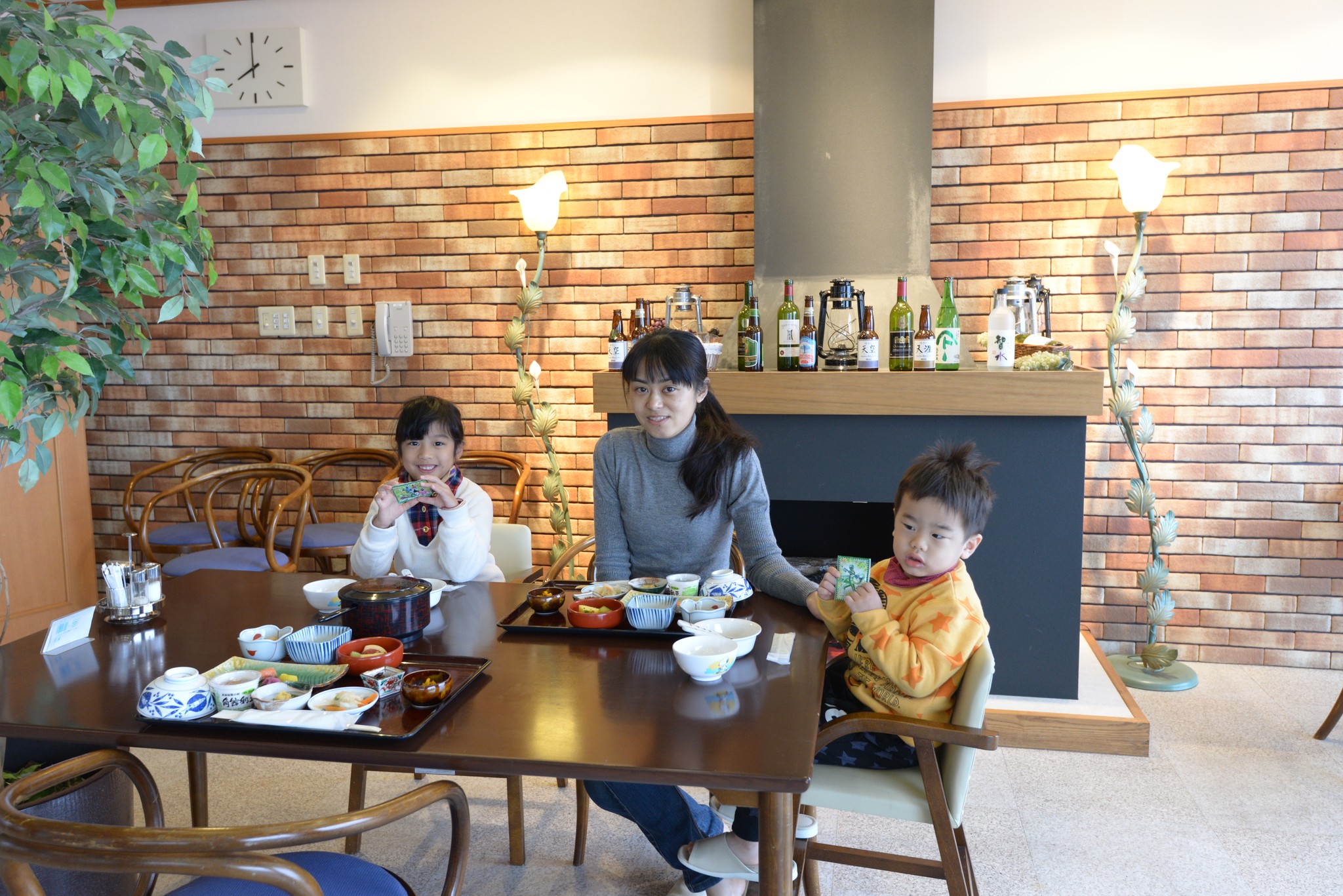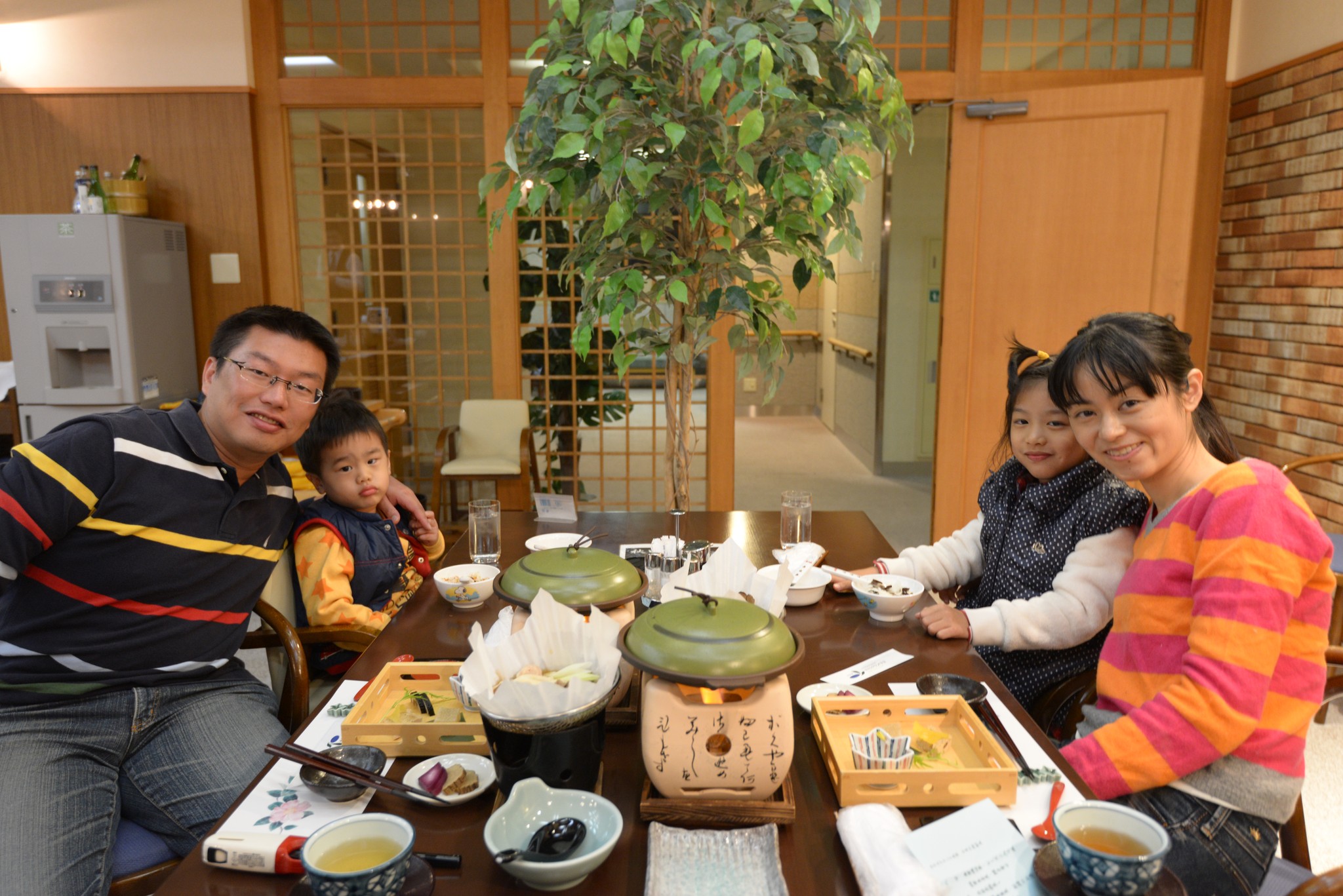 到日本過了三天後終於有一頓像樣的晚餐,為省錢只有兩份大人的餐點,小人一如各家溫泉旅館的慣例,沒付錢就只有一碗白飯加香鬆。等待的過程服務人員熱情的上來問說要不要幫我們拍張照,雖然太過廣角導致周圍有些變形(不承認自己胖),還是很謝謝啦!