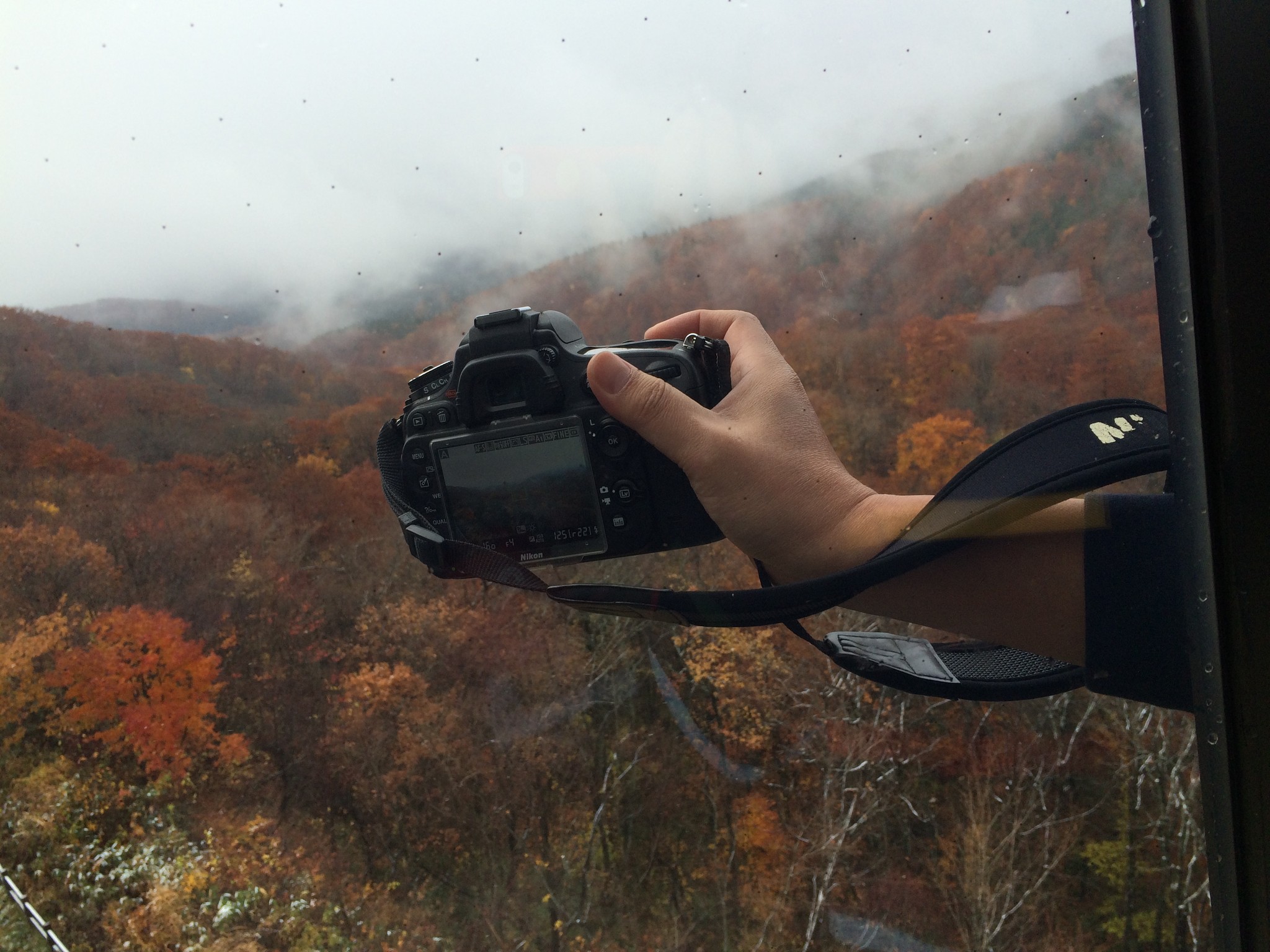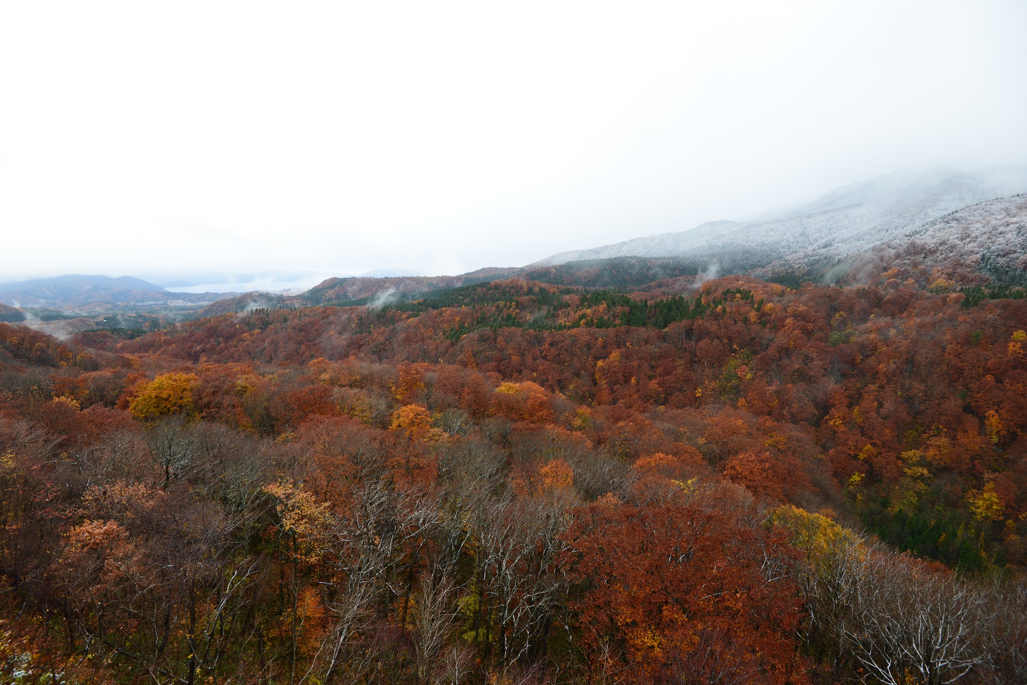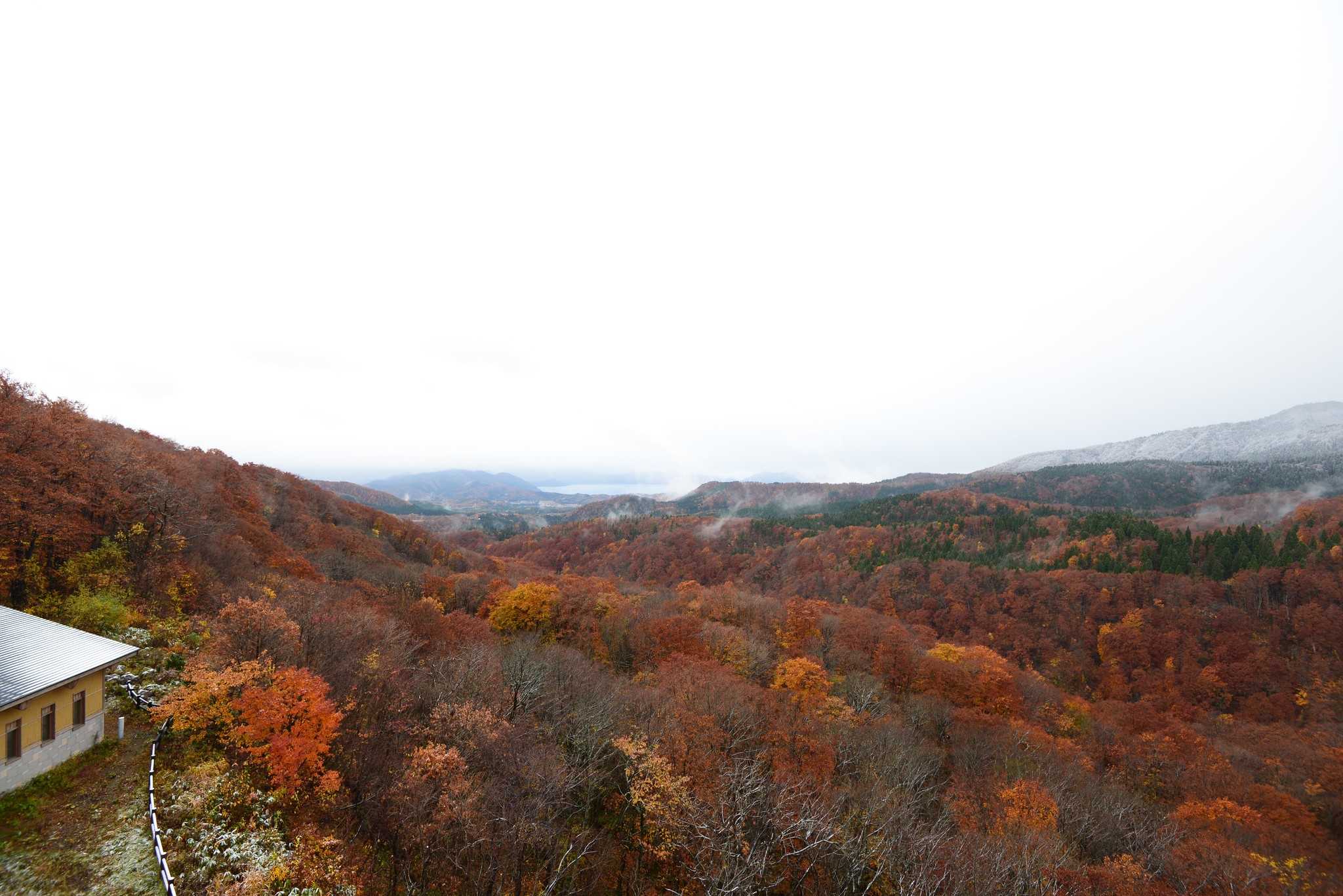 隔天一早起來為的是看前一天看不到的窗外景色,天色依舊灰矇矇的,紅葉大概掉了三成,遠方的田澤湖三不五時被霧氣所籠罩,隱隱看得出來天氣好時,這裏的紅葉是有多霸氣!