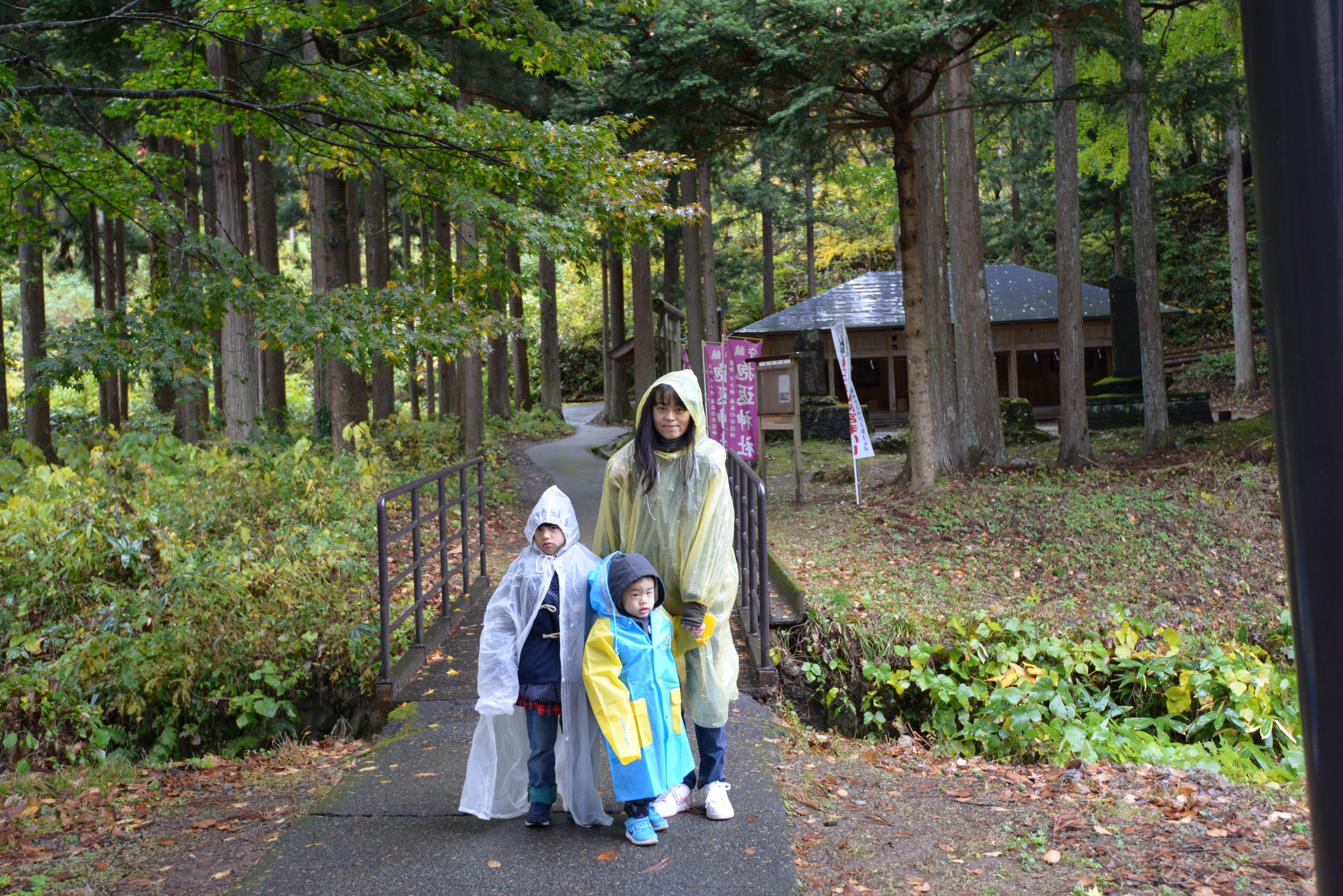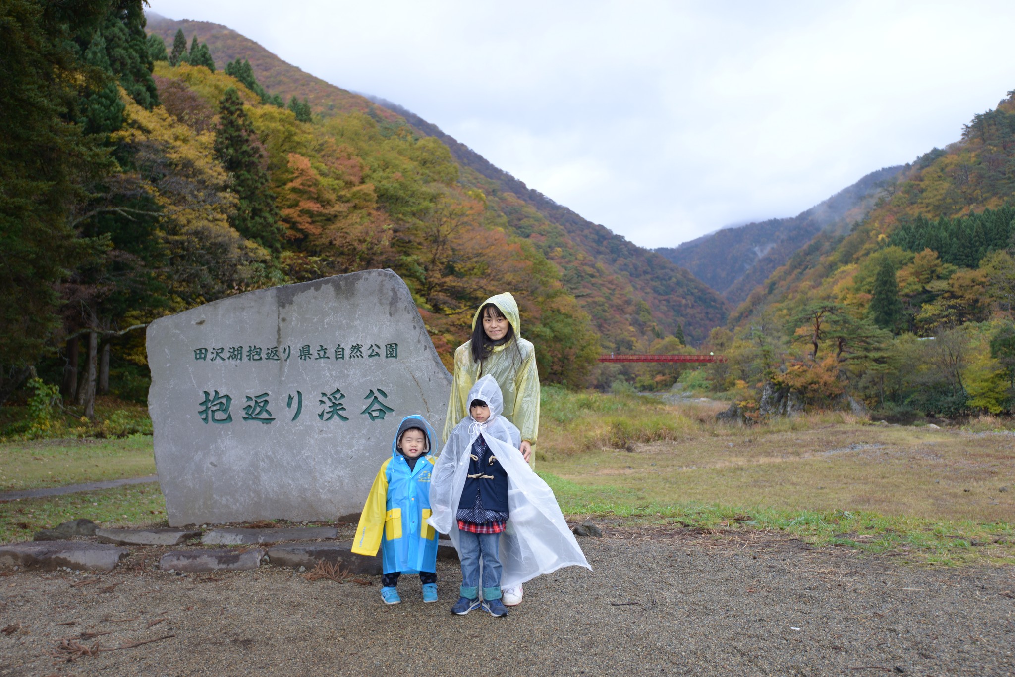 開車過來的路上雨勢從沒停歇,陳小妞的雨衣太小件了,便在大賣場買件便利型雨衣給她穿,沒想到下車時急忙間一扯就破了,搞得她小姐整路不開心。後頭的紅色吊橋就是神の岩橋。