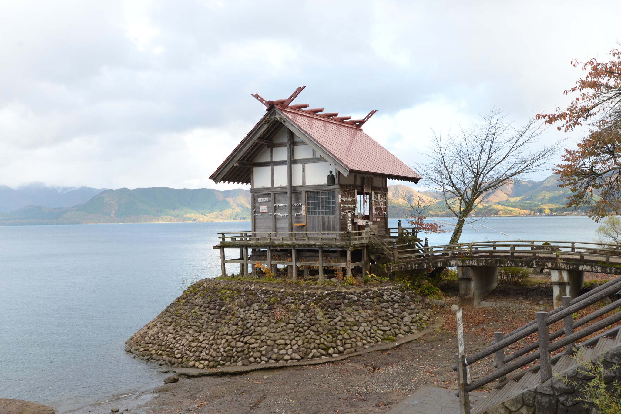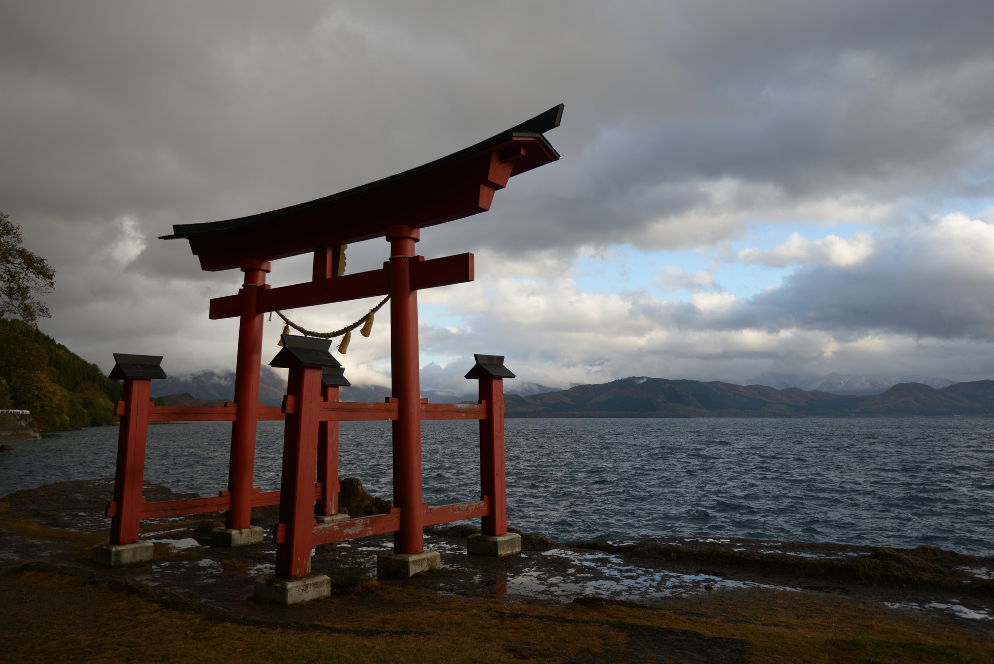 北岸的御座石神社據說也有辰子姫像,氣候不佳所以就沒去尋找,此外,這天的鳥居怎快泡進水裡了,和別人拍的水位怎差這麼多?