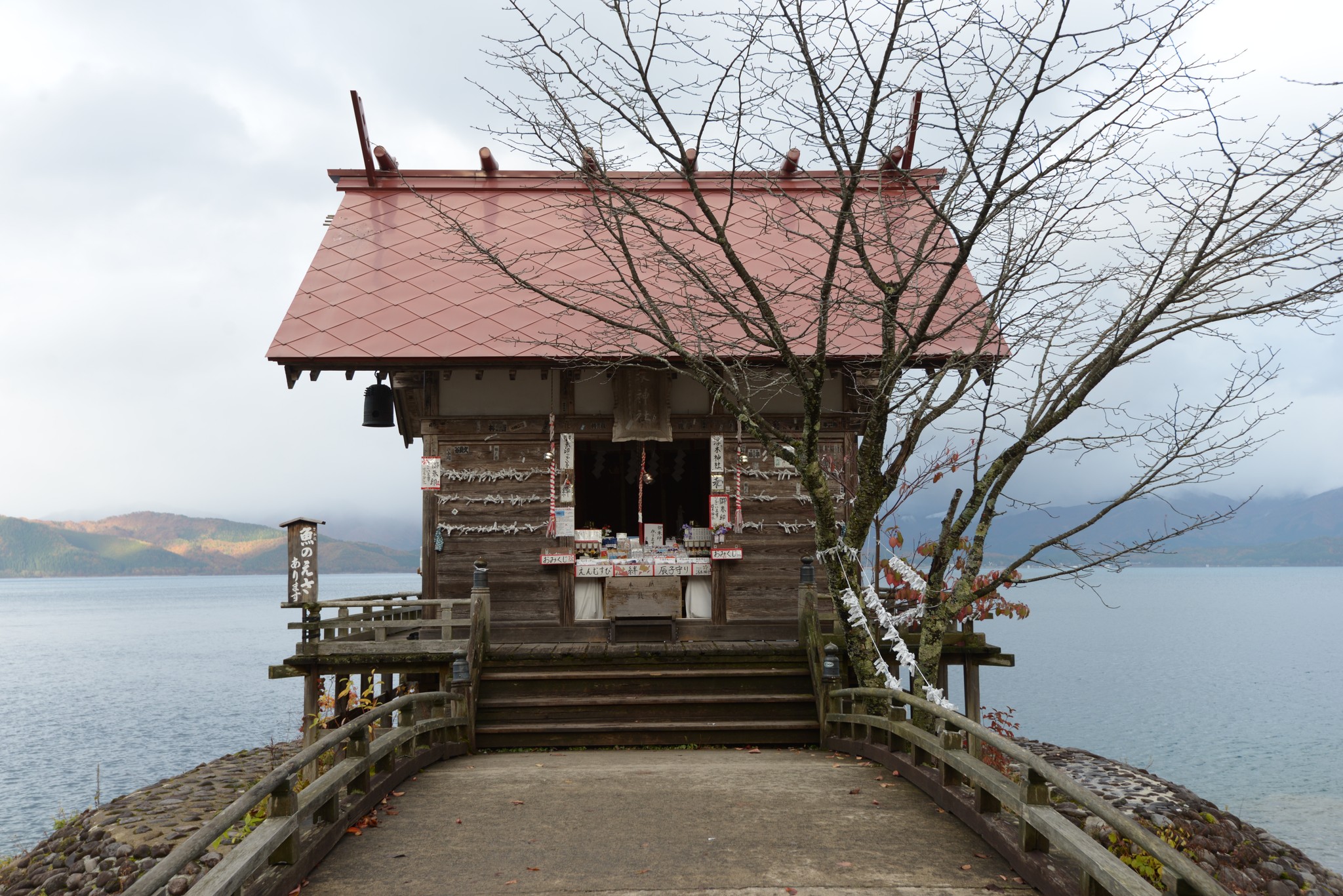 辰子姬一旁的漢槎宮(浮木神社)反倒是吸引我的目光,小小一間佇立在湖邊,超有感覺的。走上神社,還可沿著外圍走一圈,感受它悠久的歷史,妙的是,神社就正門口這一百零一個出入口,塞了一個攤位賣御守,啊是要怎麼參拜呀?